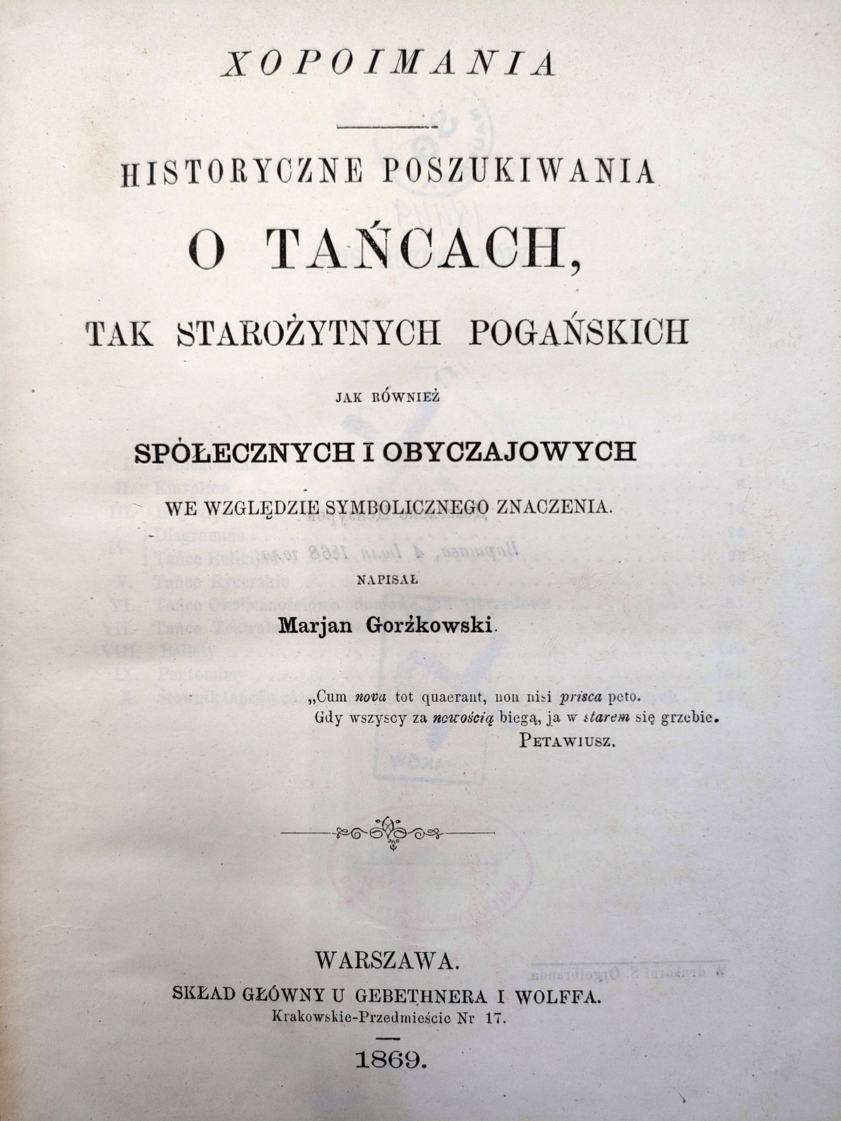 Gorzkowski Marian - Historyczne poszukiwania o tańcach, tak starożytnych pogańskich jak również społecznych i obyczajowych we względzie symbolicznego znaczenia.