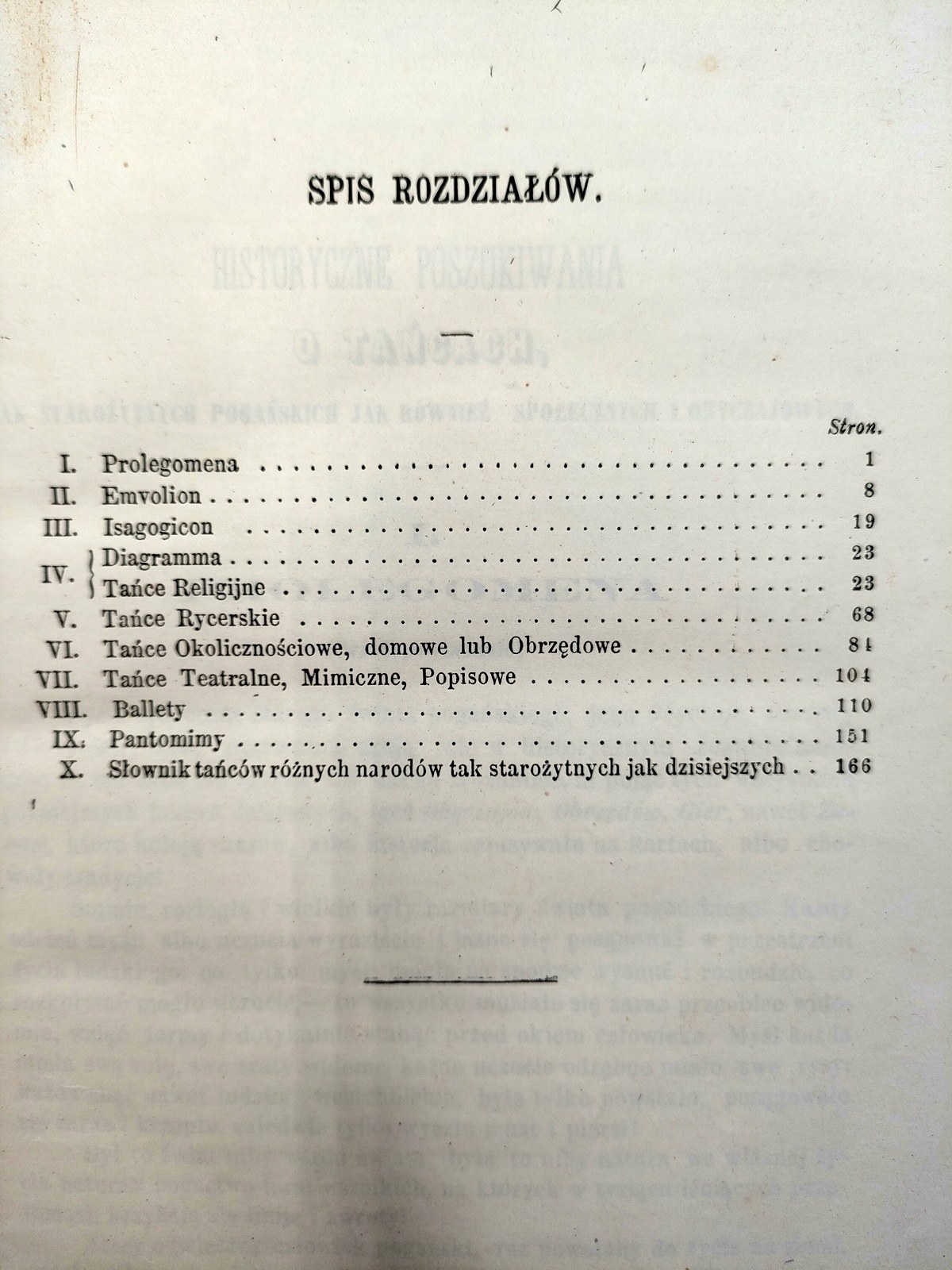 Zawiera m.in. rozdziały : Tańce religijne, rycerskie, obrzędowe, domowe, teatralne, popisowe, balety.