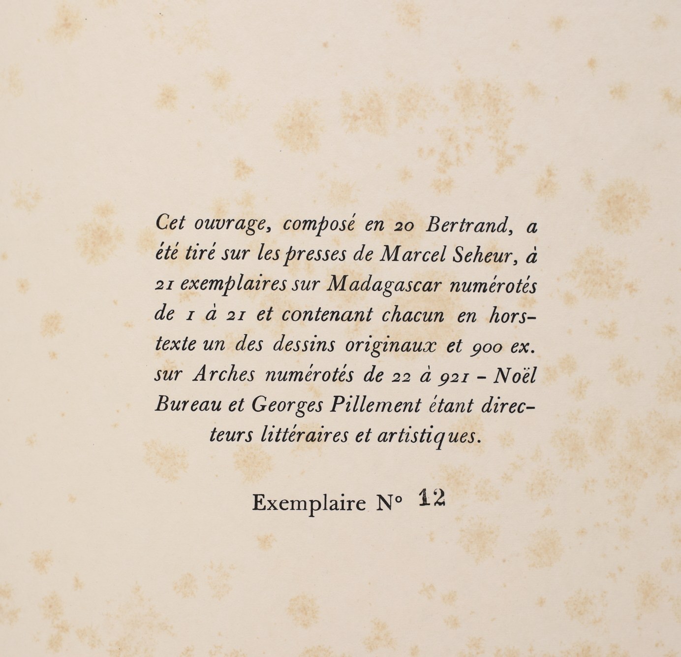 Wydano 921 numerowanych egz., z czego 21 egzemplarzy na specjalnym papierze Madagaskar i 900 egzemplarzy na papierze d'Arches. Ten egzemplarz nr 12 na specjalnym papierze Madagaskar. Do limitowanej puli 21 egzemplarzy dodawano 1 egzemplarz projektu ilustracji autora.
