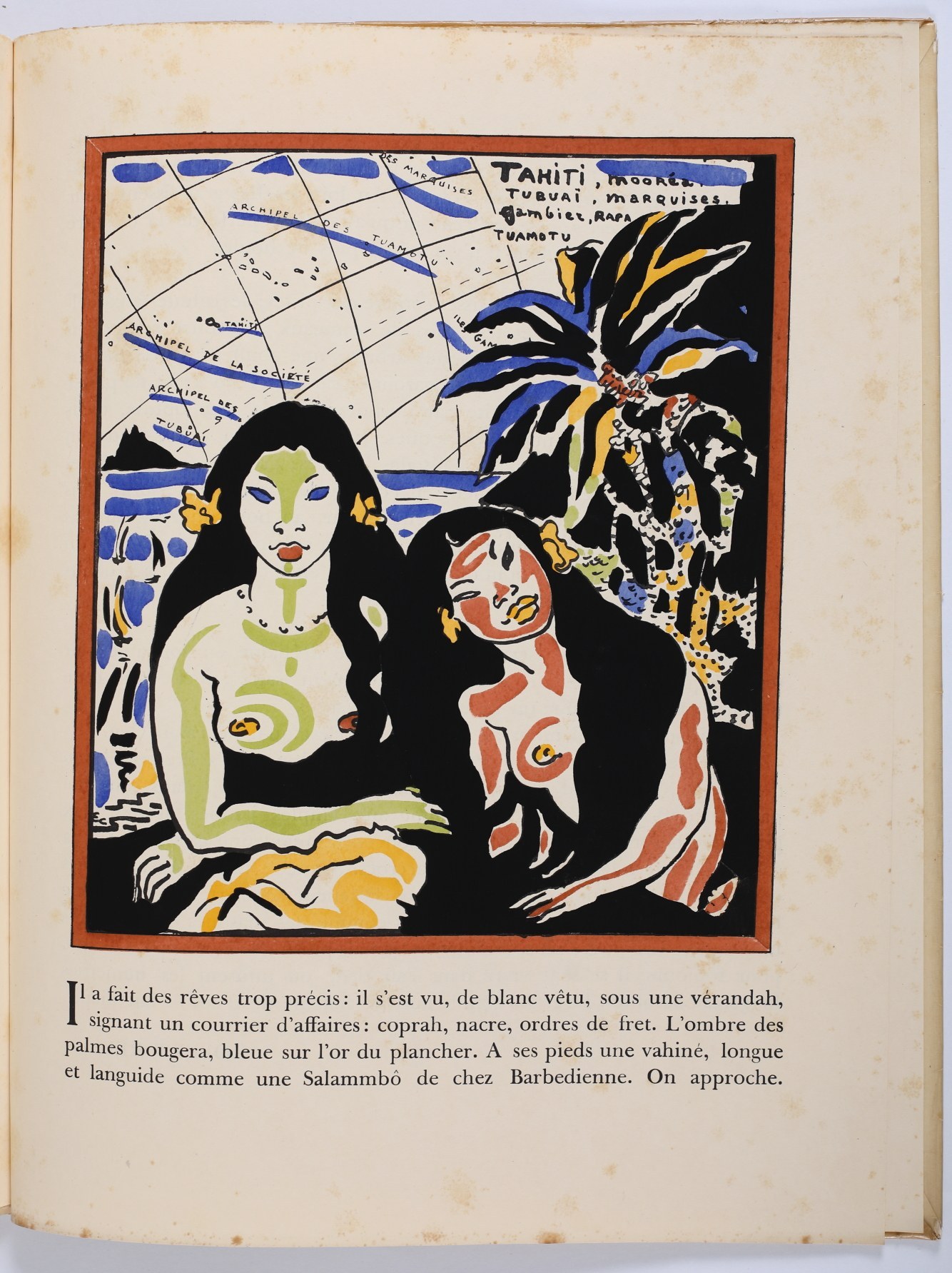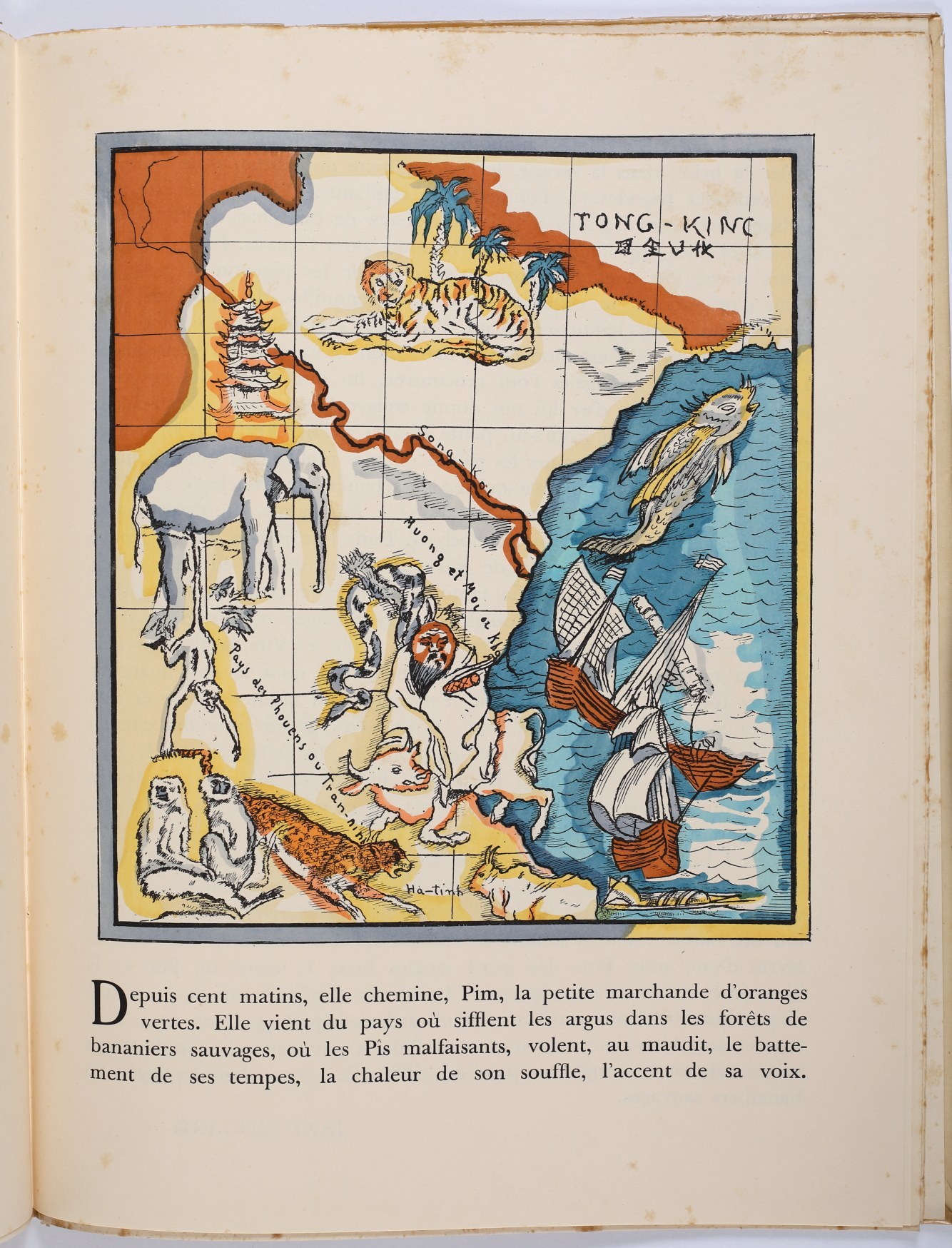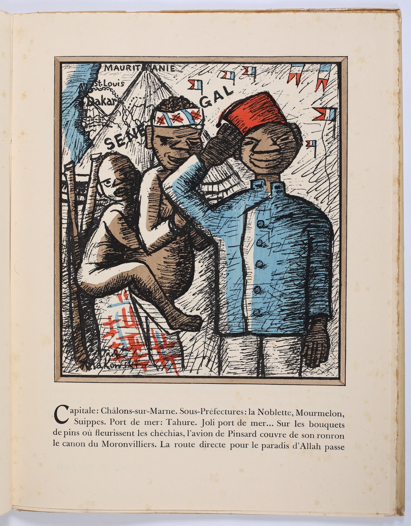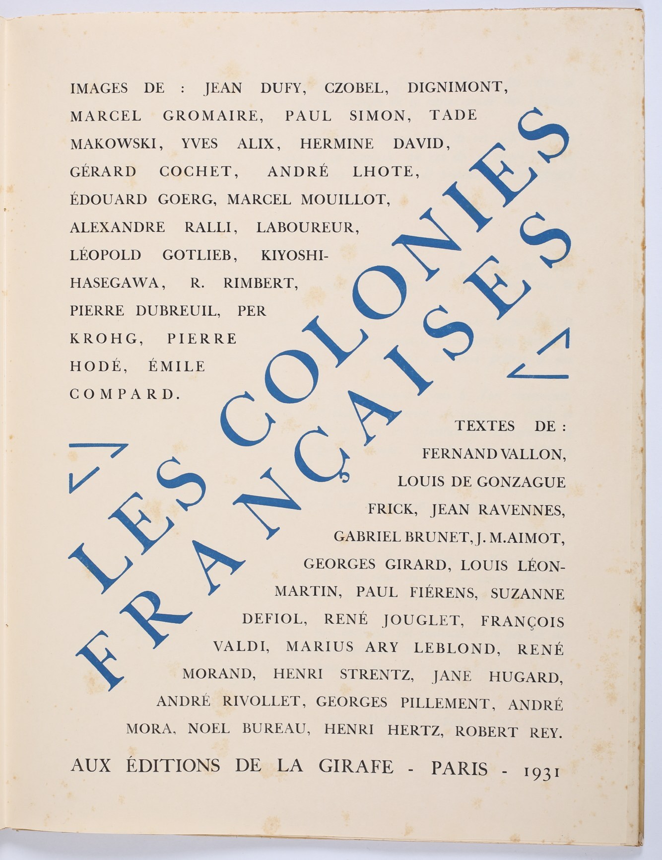 Zawiera 21 tekstów autorskich, opisujących różne francuskie kolonie. Każdy tekst ilustrowany drzeworytem, zaprojektowanym przez takich artystów jak: Jean Dufy, Czobel, Dignimont, Marcel Gromaire, Paul Simon, Tade Makowski, Yves Alix, Hermine David, Gerard Cochet, Andre Lhote, Edouard Goerg, Marcel Mouillot, Alexandre Ralli, Laboureur, Leopold Gotlieb, Kiyoshihasegawa, R. Rimbert, Pierre Dubreuil, Per Krohg, Pierre Hode, Emile Compard, Tadeusza Makowskiego (1882-1928) - ilusracja Mauretanii i Senegalu, Leopolda Gottlieba (1879-1934) - ilustracja Tonkin-Annam-Laos.