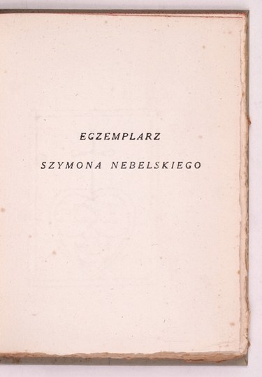 Stamperia 1/43. Niewielki otwór w dolnej części grzbietu, drobne zaplamienia okł., wewnątrz stan bardzo dobry. Wydano 300 egz., ten nr 54, imienny - przypisany Szymonowi Nebelskiemu. Druk na własnym papierze z filigranem w kształcie znaku firmowego Oficyny. Publikacja, 30. w dorobku Oficyny Nicejskiej, zamyka pierwszą serię jej wydawnictw. Poezje J. Gozdawy (właśc. Gozdawy-Małęczyńskiego) ozdobiono 30 winietami W. Stefanowskiej.