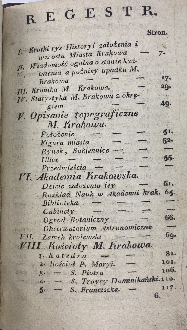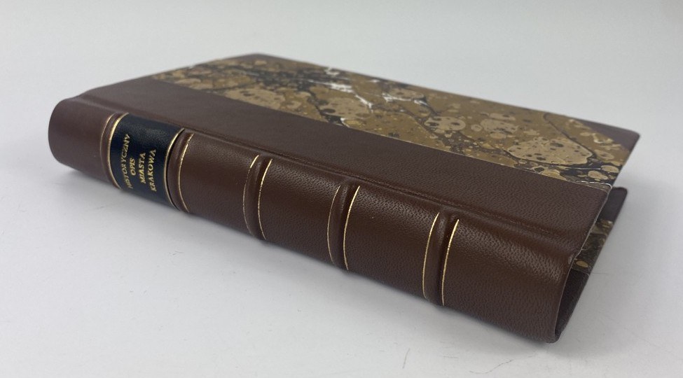 Grabowski Ambroży, Historyczny opis miasta Krakowa i jego okolic, nakł. i drukiem Józefa Mateckiego, Kraków 1822, I wydanie, s. [2], 327, [4], wymiary 11,5 x 18,5 cm. Brak tablic. Marginalia na stronie przedtytułowej i ostatniej. Półskórek wykonany w pracowni Suszek Books.