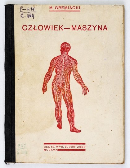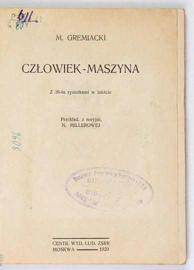 GREMIACKI M. - Człowiek-maszyna. Z 36-iu rysunkami w tekście. Przekład z rosyjsk. N. Millerowej. Moskwa 1929. Cernt. Wyd. Lud. ZSRR. 16d, s. 111, [1]. opr. ppł. z epoki, okł. brosz. naklejona na oprawę.