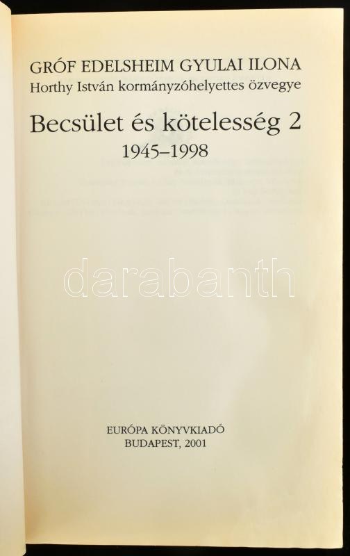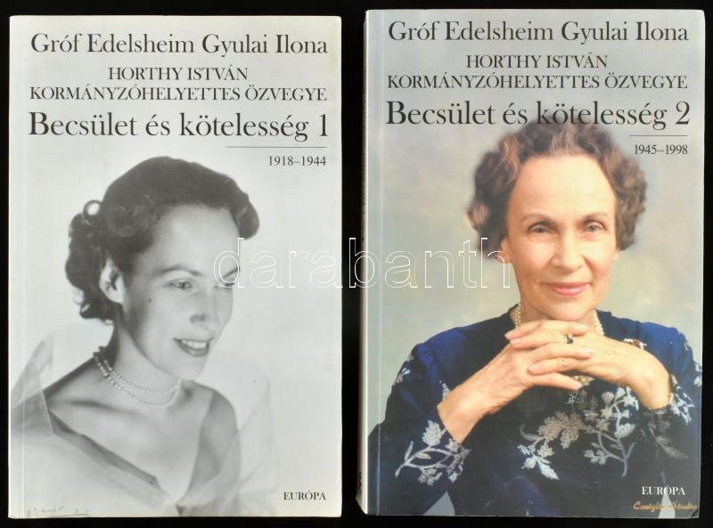 Gróf Edelsheim Gyulai Ilona, Horthy István kormányzóhelyettes özvegye: Becsület és kötelesség. 1-2. köt. Szerk.: Ocsovai Gábor. Bp., 2001, Európa. Kiadói papírkötés, a 2. kötetben foltos, hullámos lapokkal, az 1. kötetben néhány bejelöléssel.