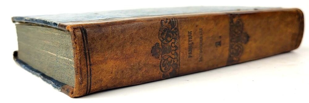 TWARDA OPRAWA PÓŁSKÓREK Z EPOKI, GRZBIET PŁASKI ZE ZŁOCENIAMI, KARTON MARMORYZOWANY, OBCIĘCIA KART PRÓSZONE