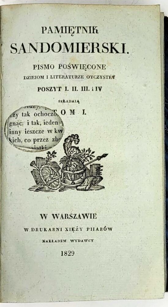 Jeden z dwóch tomów "Pamiętnika Sandomierskiego" opublikowanego przez Tomasza Ujazdowskiego (1796-1839) - archeologa, redaktora, nauczyciela w szkołach pijarskich oraz wojewódzkich w Kielcach i Kaliszu, a także osoby związanej z Biblioteką Uniwersytetu Warszawskiego. Oprócz "Pamiętnika" wydawał również periodyk "Tandeciarz" i w 1835 roku opublikował "Pomnik rycerstwa polskiego w wieku XV".