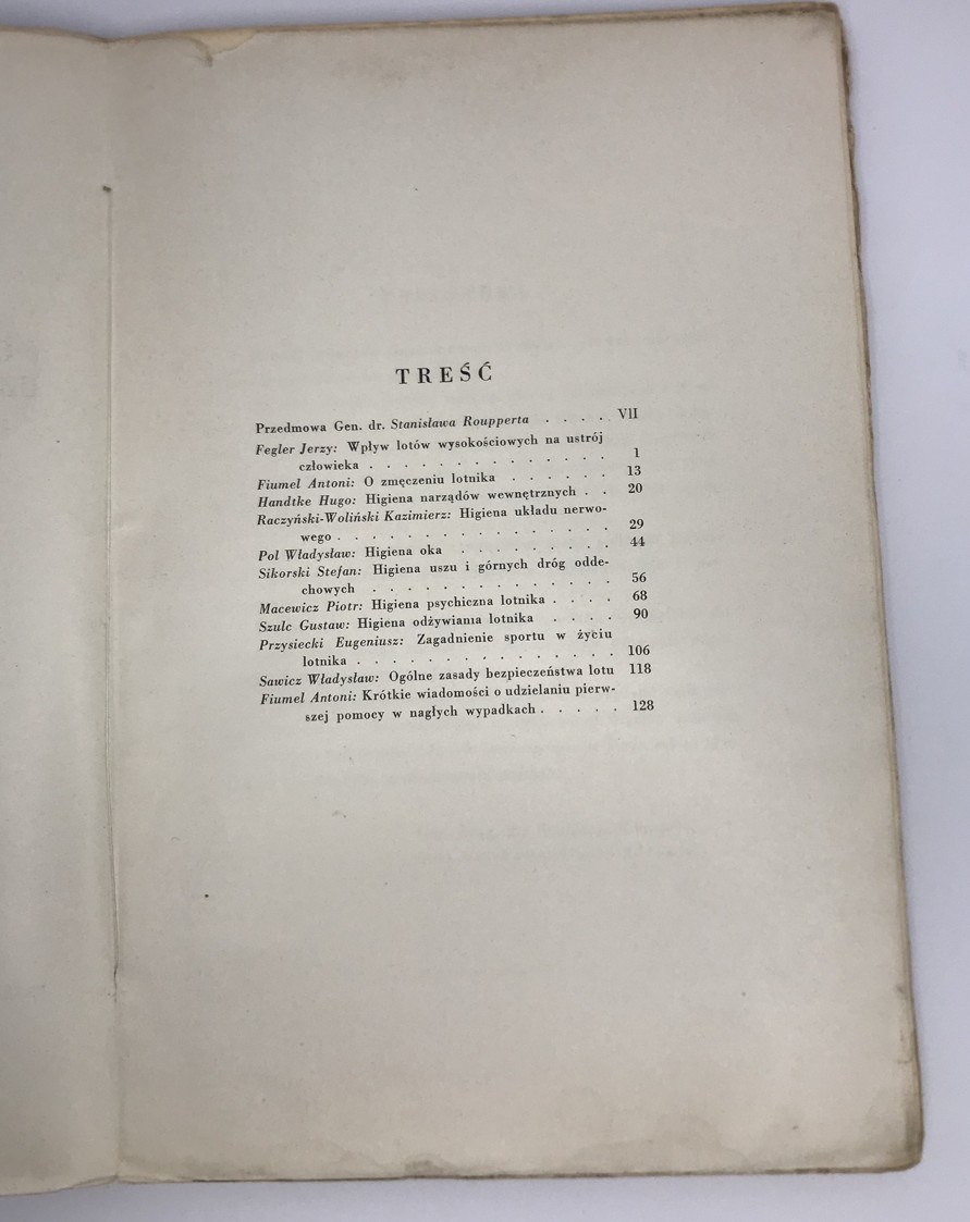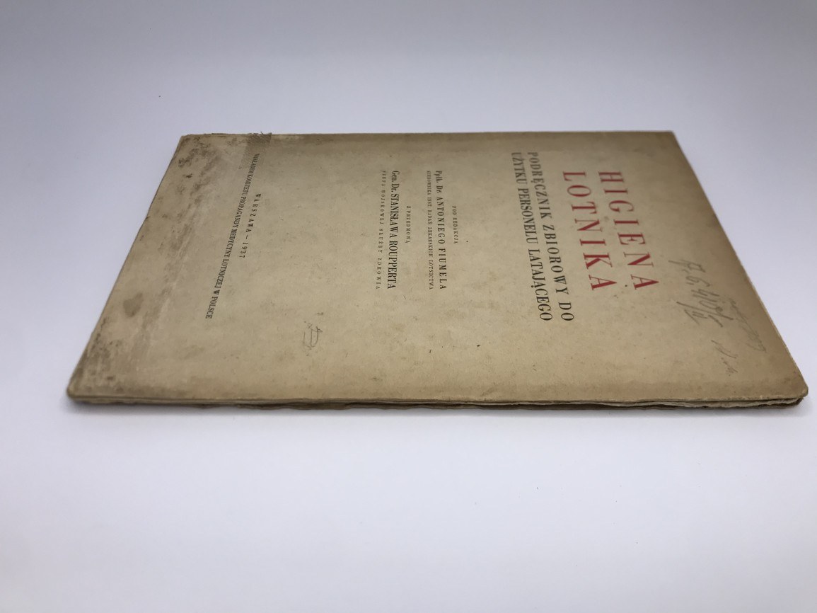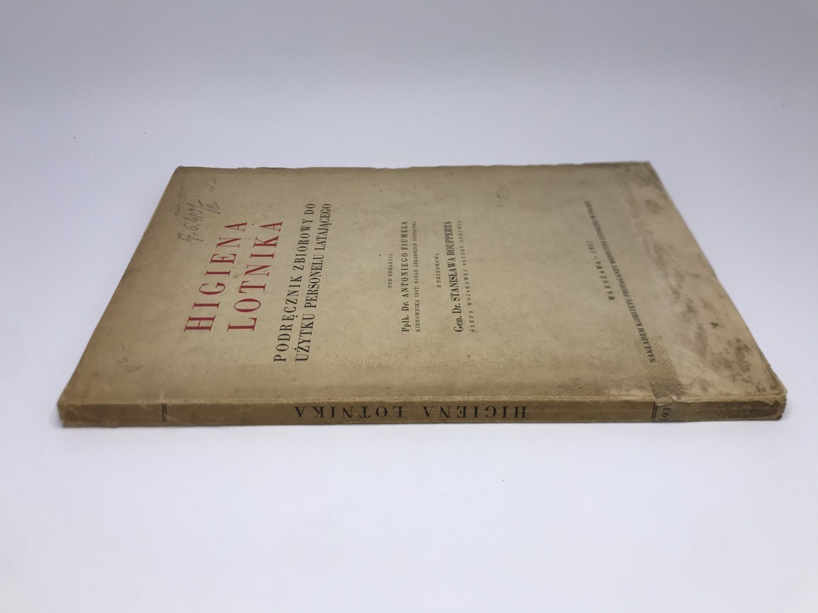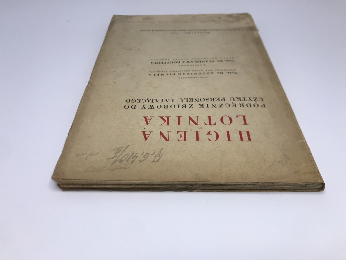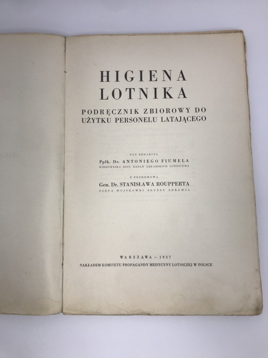 gen. Rouppert Stanisław [przedmowa], ppłk. Fiumela Antonii [redaktor] Higiena Lotnika. Podręcznik zbiorowy do użytku personelu latającego Nakładem Komitetu Propagandy Medycyny Lotniczej w Polsce, Warszawa 1937, s. 150, format 24 x 16 cm, okładka broszurowa, przybrudzona, karty książki czyste, blok zwarty.