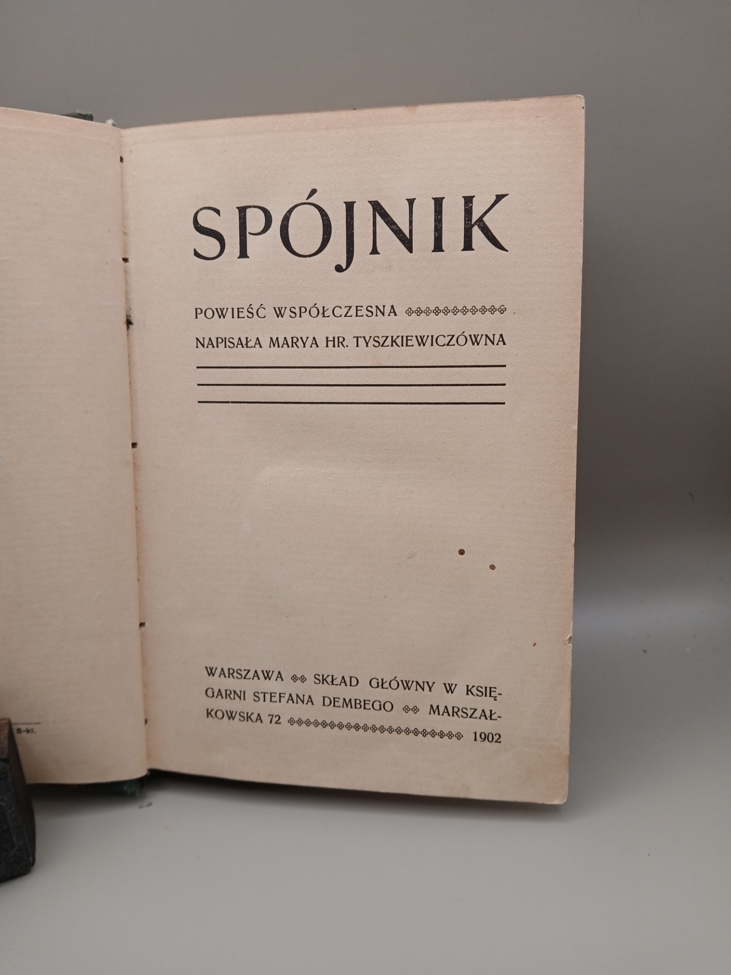 Marya hr. Tyszkiewiczówna. SPÓJNIK. POWIEŚĆ WSPÓŁCZESNA. WARSZAWA 1902. SKŁAD GŁÓWNY W KSIĘGARNI STEFANA DEMBEGO. 18X13 cm; s. 300; oprawa półpłocienna z mocnymi przetarciami.