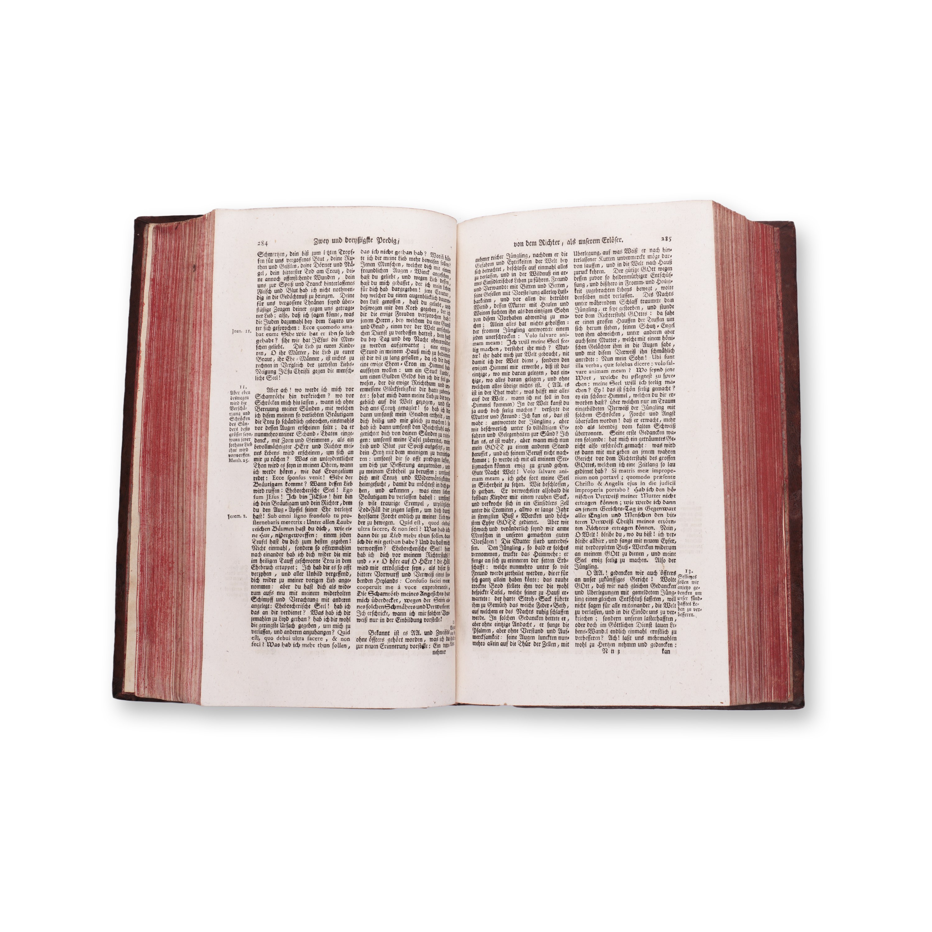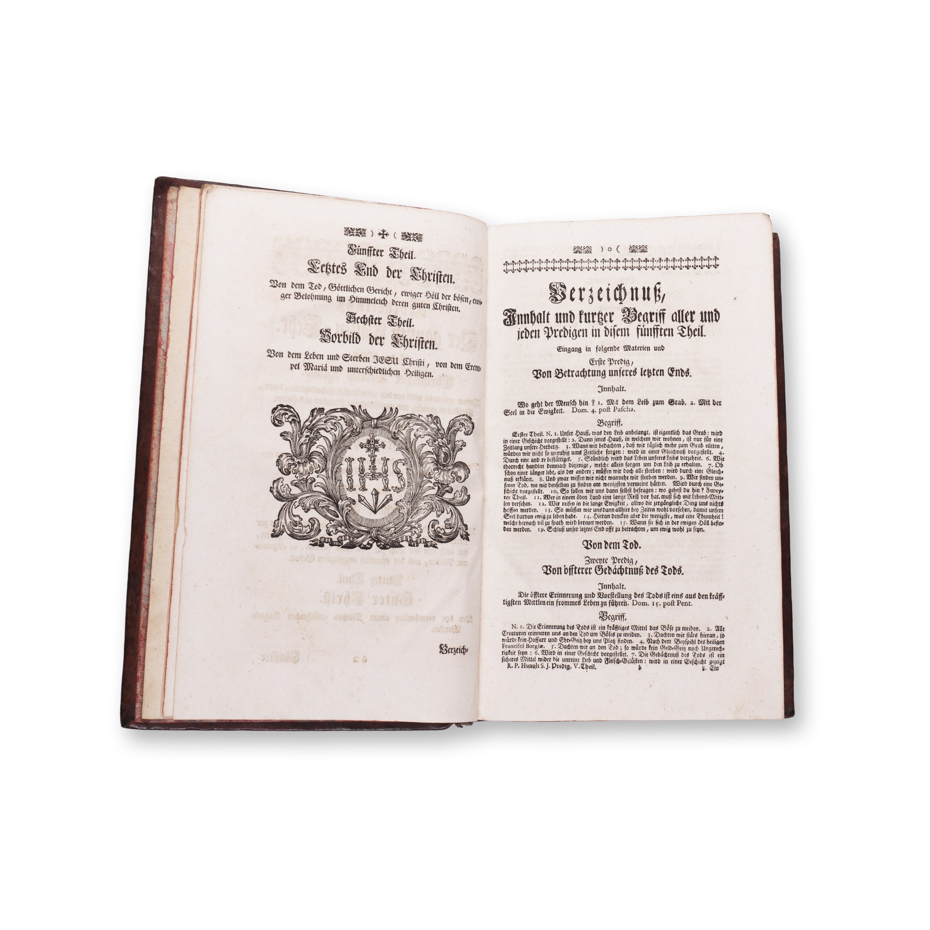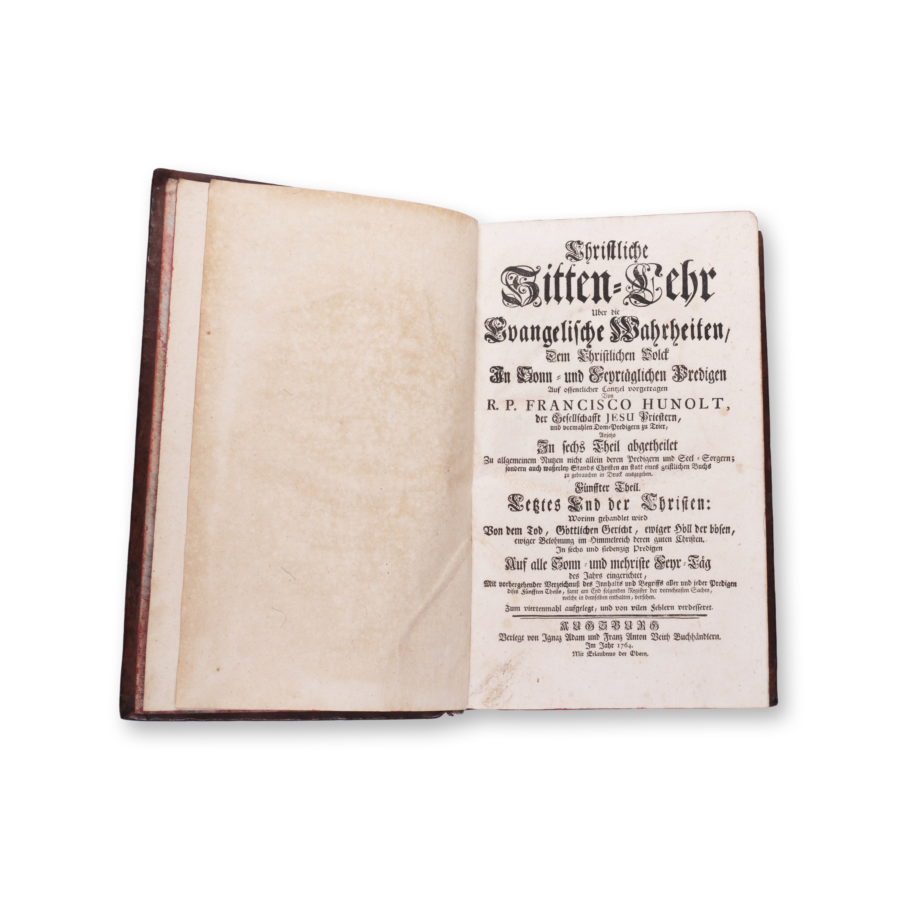 1764 | PUBLISHER: Augsburg, Ignaz Adam und Franz Anton Veith | NUMBER OF PAGES: 700 + index | LANGUAGE: German | DIMENSIONS: 346 x 225 mm | THE FULL TITLE OF THE WORK: Christliche Sittenlehre ueber die evangelischen Wahrheiten dem christlichen Volke in Sonn - , Festtags - und Gelegenheits - Predigten auf offentlicher Cantzel vorgetragen. Funffter Theil | CONDITION: insect damage, spots