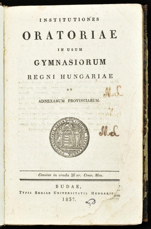 Institutiones oratoriae in usum gymnasiorum Regni Hungariae et adnexarum provinciarum. Buda, 1837. Univeritatis. XVI, 368 p.. Korabeli, kopottas félbőr kötésben. Címlapon kis hiánnyal