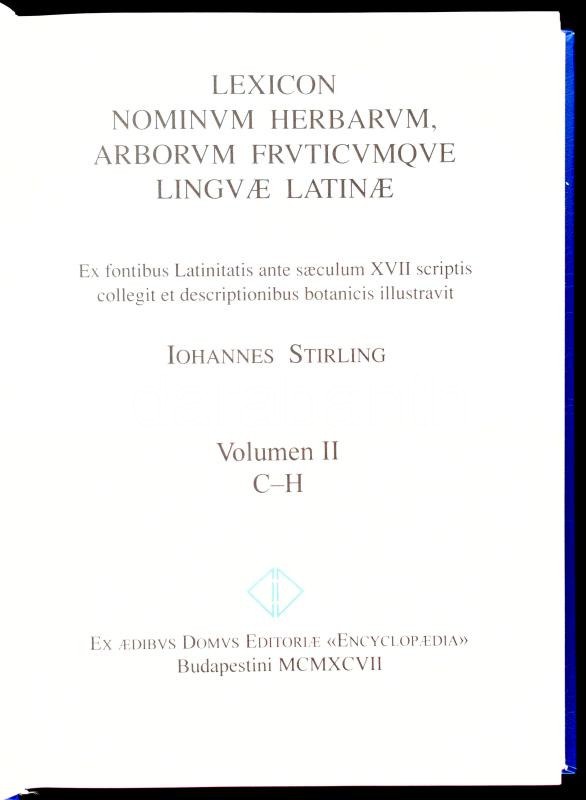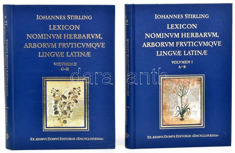 Iohannes Stirling: Lexikon nominum herbarum, arborum fruticumque linguae latinae. Volumen I-II. köt. Ex fontibus Latinitatis ante saeculum XVII scriptis collegit et descriptionibus botanicis illustravit. A mű 4 kötetben teljes. Bp., 1995-1997,Enciklopédia Kiadó. Latin, angol, német és francia nyelvű előszóval. Latin nyelven. Kiadói műbőr-kötés.
