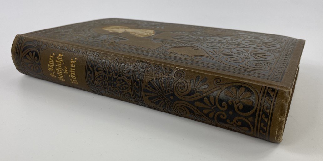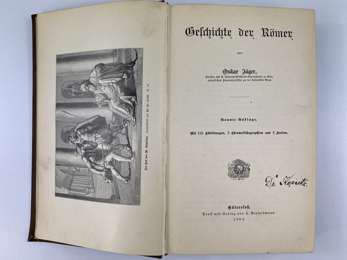 Jäger Oskar, Geschichte der Römer, Bertelsmann, Gütersloh 1904, s. 694, [2], 2 rozk. mapy, wymiary 14 x 22,5 cm. Podpis własnościowy. Ilustracje w tekście. Okładka płócienna, wydawnicza. Otarcia okładki.