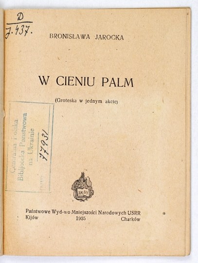 JAROCKA Bronisława - W cieniu palm. (Groteska w jednym akcie). Kijów-Charków 1935. Państwowe Wyd-wo Mniejszości narodowych USRR. 16d, s. 30, [1]. brosz. Bibljoteczka "Bądź Gotów", nr 2.