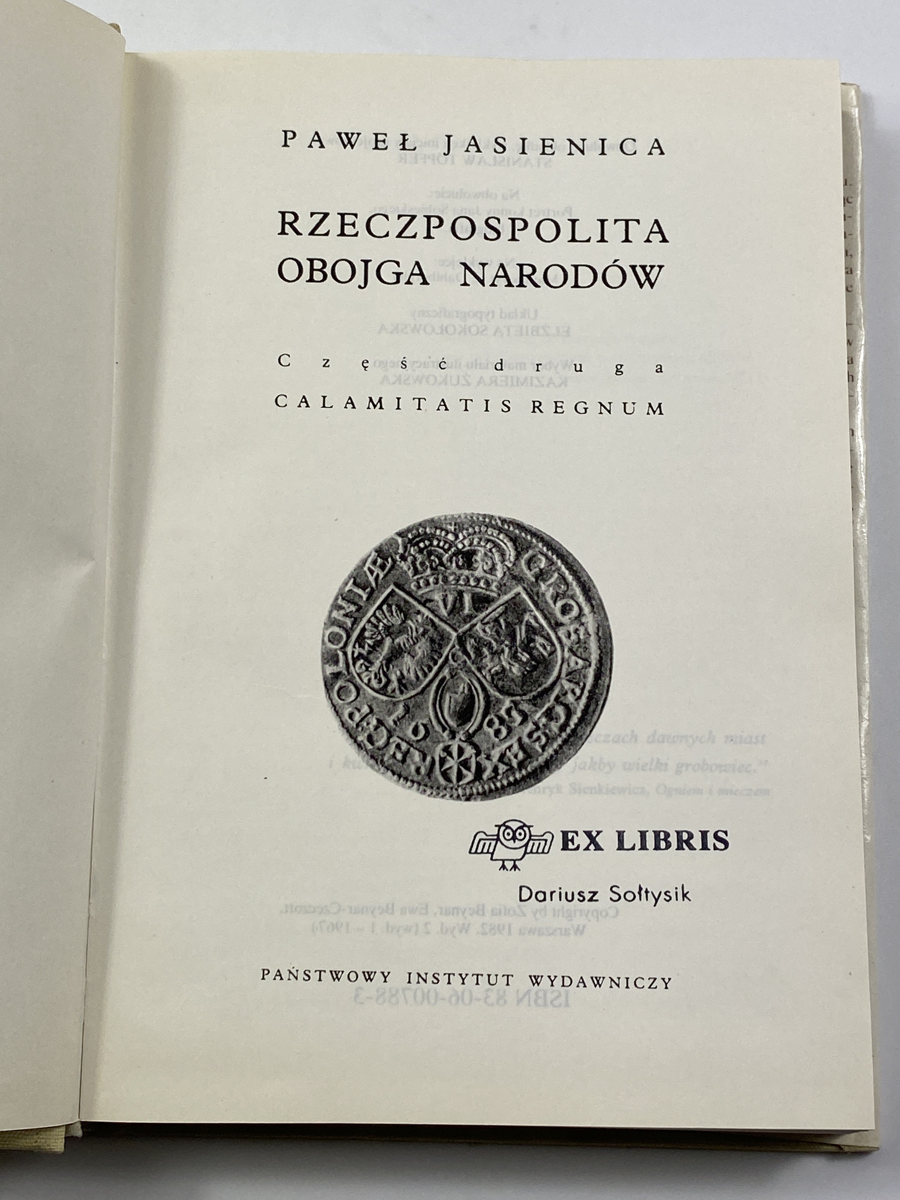 Jasienica Paweł, Rzeczpospolita Obojga Narodów t. I – III, wyd. PIW, Warszawa 1982, wydanie II, t. I – s. 499, t. II – s. 417, t. III – 645, wymiary 15,5 x 21 cm. Obwolutę, okładkę i inicjały Stanisław Töpfer. Liczne ilustracje w tekście. Okładki płócienne z oryginalnymi obwolutami. Nieakt. pieczęć własności. Otarcia, niewielkie naddarcia, zabrudzenia obwolut.