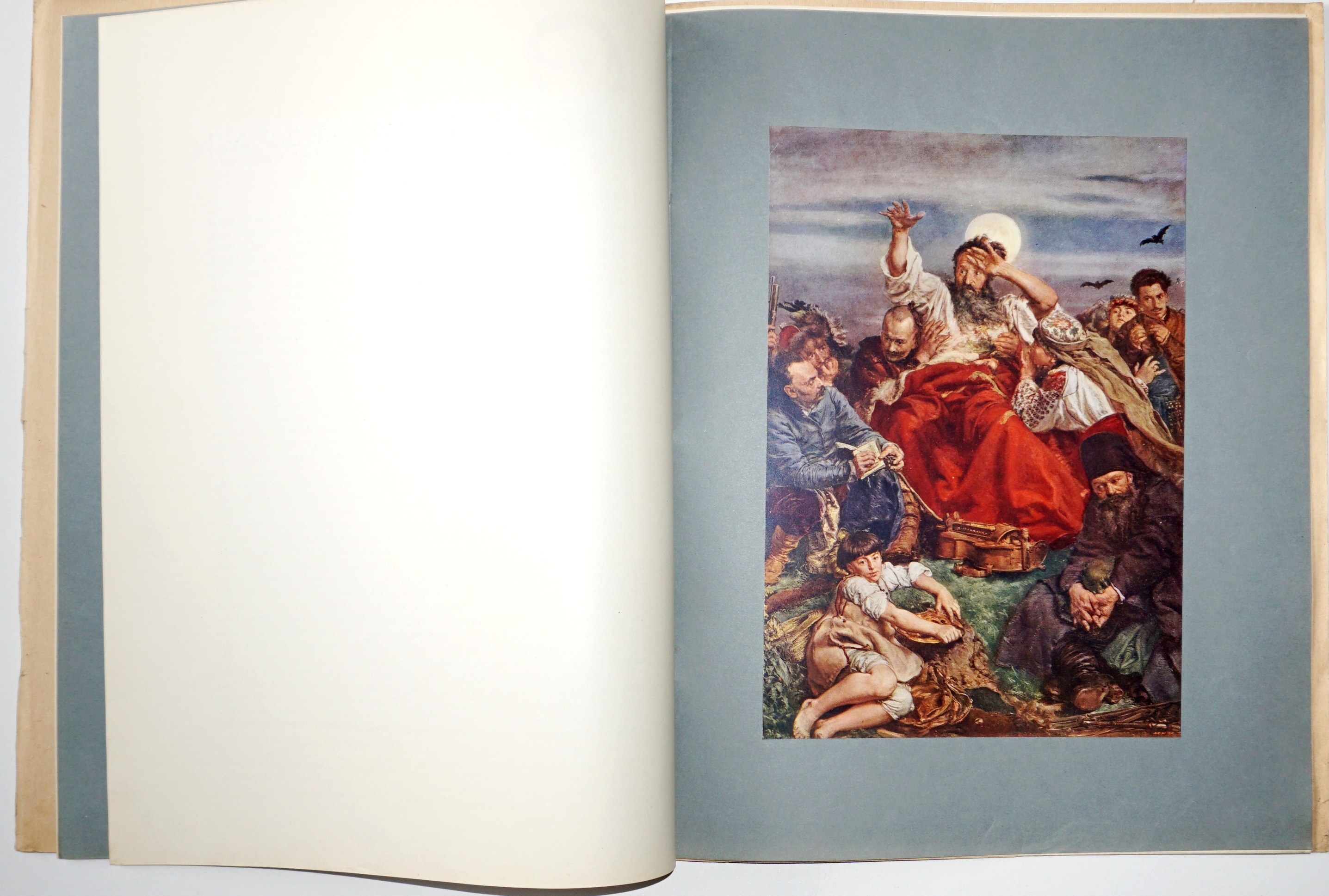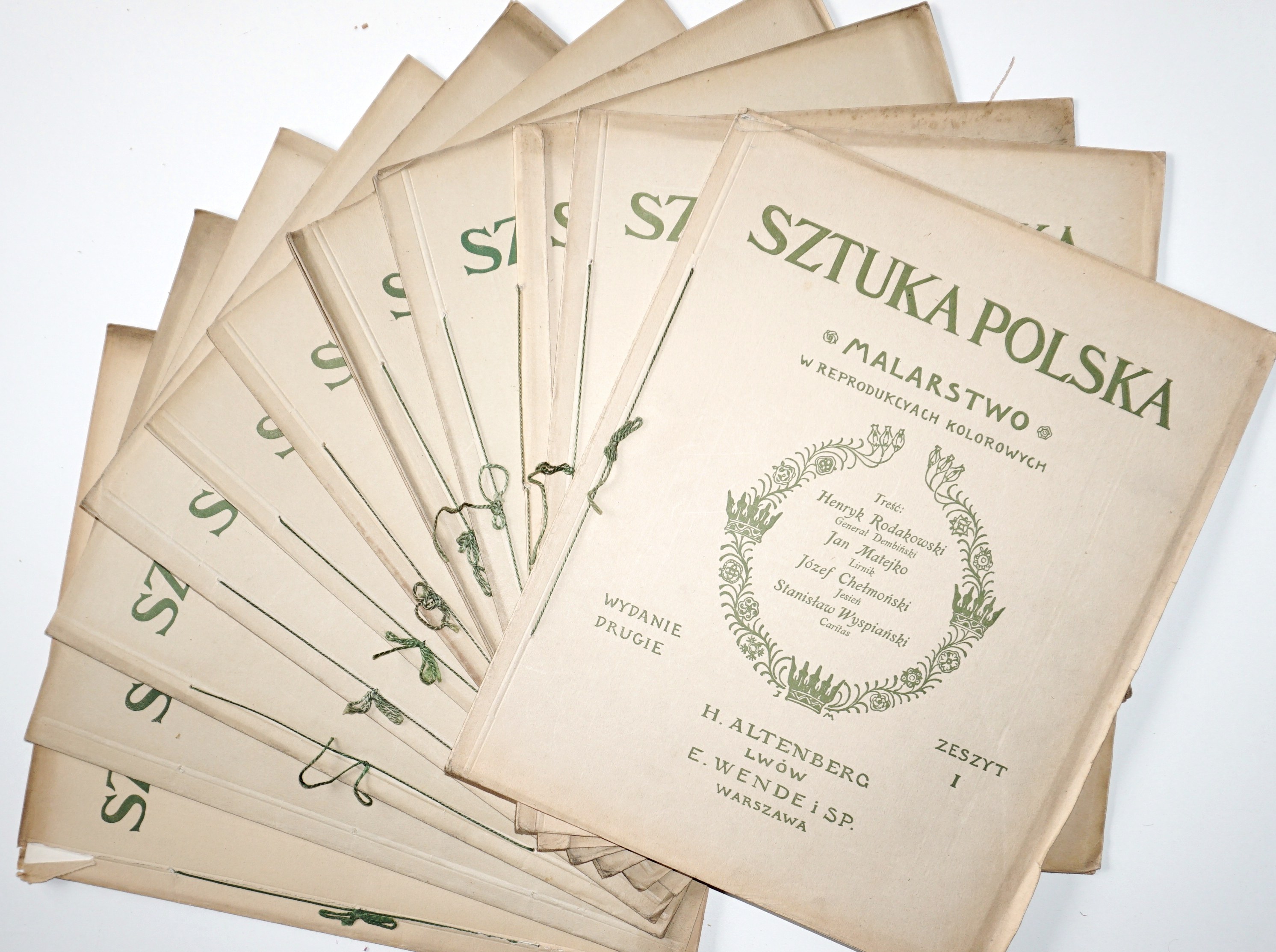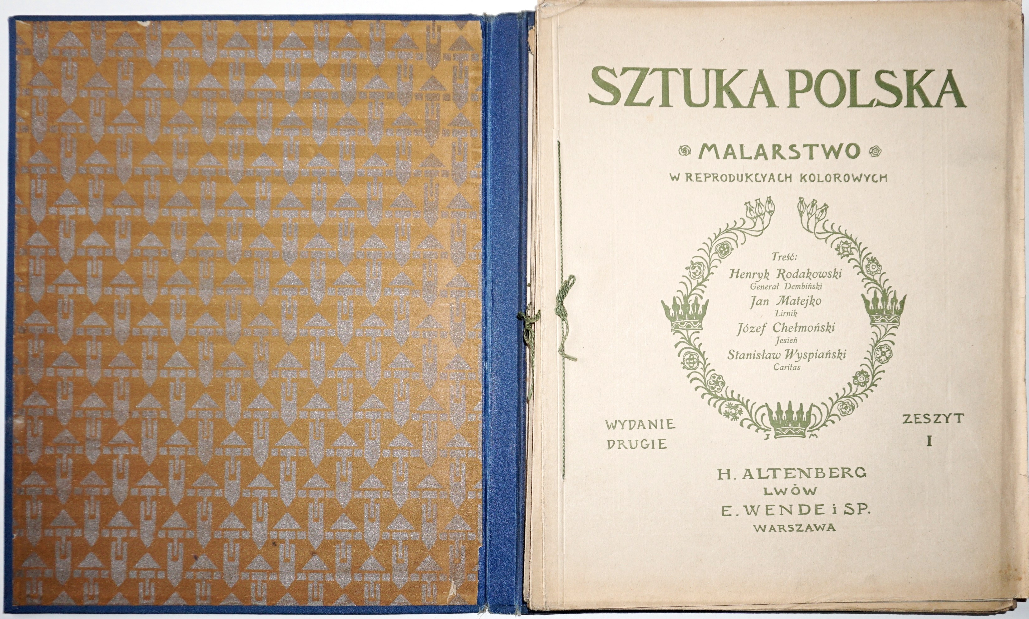 [55] k., [50] k. tabl. ilustracji (gł. kolor.) ; płótno wydawnicze bogato tłoczone i złocone, na okładce wmontowana ilustracja, 34 cm, ozdobna przednia wyklejka, brak tylnej; otarcia oprawy w narożnikach i naddarcie w dolnej i górnej części grzbietu, niewielkie zabrudzenia; blok w postaci oryginalnych 12 zeszytów, każdy w oryginalnej okładce broszurowej, przewiązanej sznurkiem (jeden bez), nigdy nieoprawiony; wydawnicza oprawa osobno i wydawnicze zeszyty (rzadkość w oryginalnych okładkach), taki zestaw trafiał do introligatora, który zszywał i wprawiał w oprawę; piękna pozycja w unikatowym stanie zachowania!