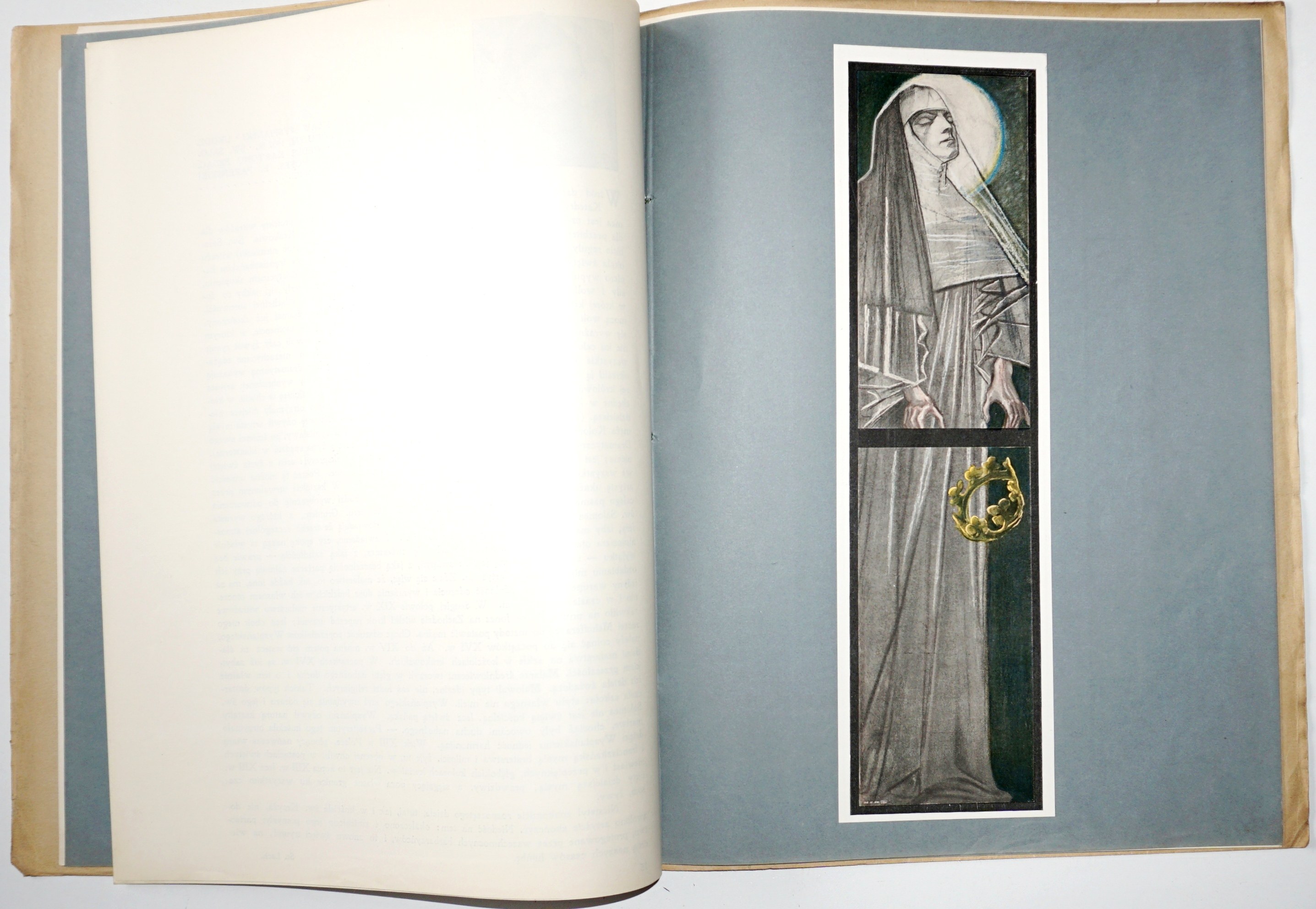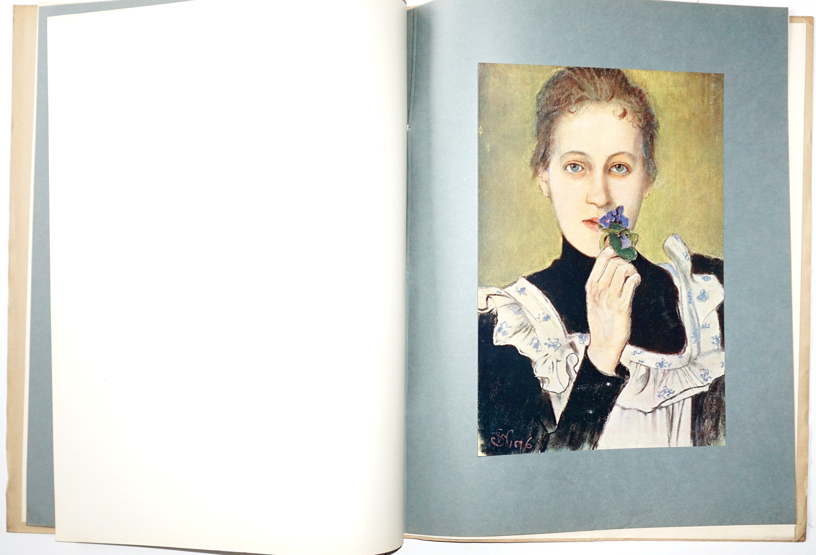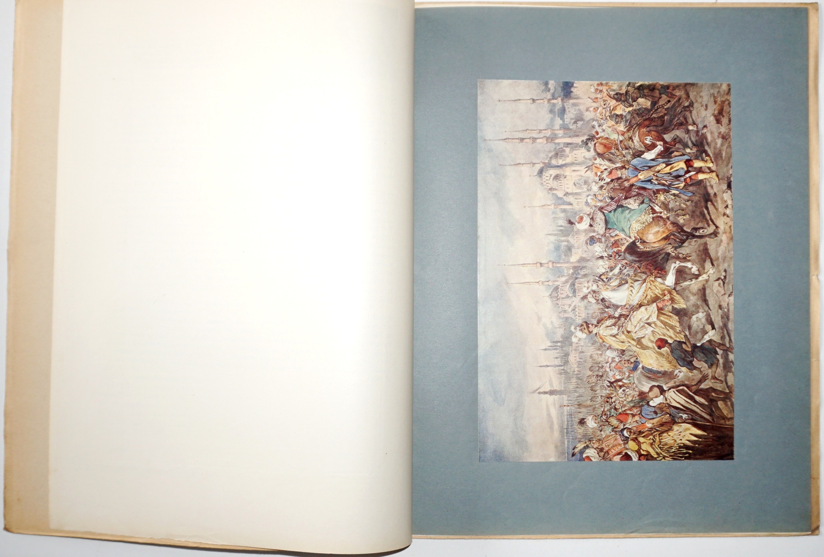 [55] k., [50] k. tabl. ilustracji (gł. kolor.) ; płótno wydawnicze bogato tłoczone i złocone, na okładce wmontowana ilustracja, 34 cm, ozdobna przednia wyklejka, brak tylnej; otarcia oprawy w narożnikach i naddarcie w dolnej i górnej części grzbietu, niewielkie zabrudzenia; blok w postaci oryginalnych 12 zeszytów, każdy w oryginalnej okładce broszurowej, przewiązanej sznurkiem (jeden bez), nigdy nieoprawiony; wydawnicza oprawa osobno i wydawnicze zeszyty (rzadkość w oryginalnych okładkach), taki zestaw trafiał do introligatora, który zszywał i wprawiał w oprawę; piękna pozycja w unikatowym stanie zachowania!
