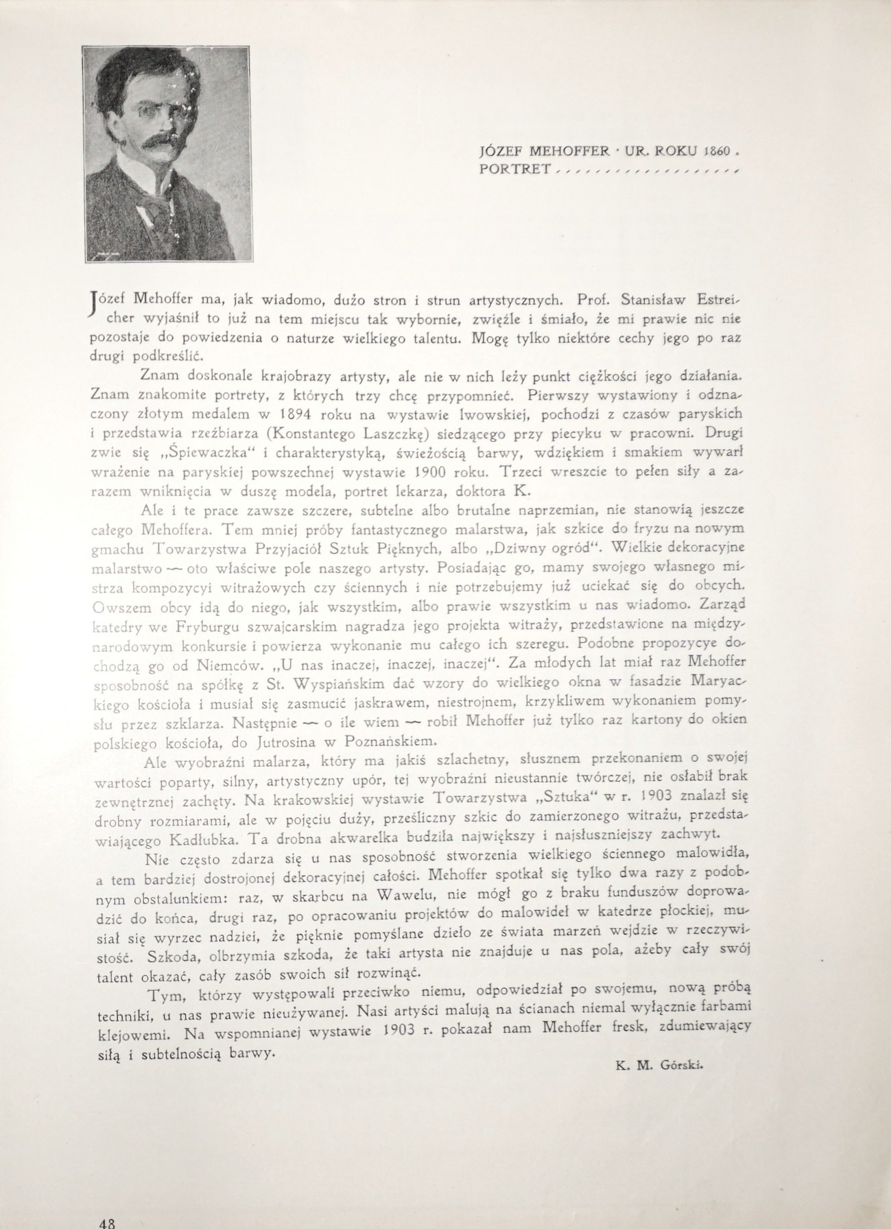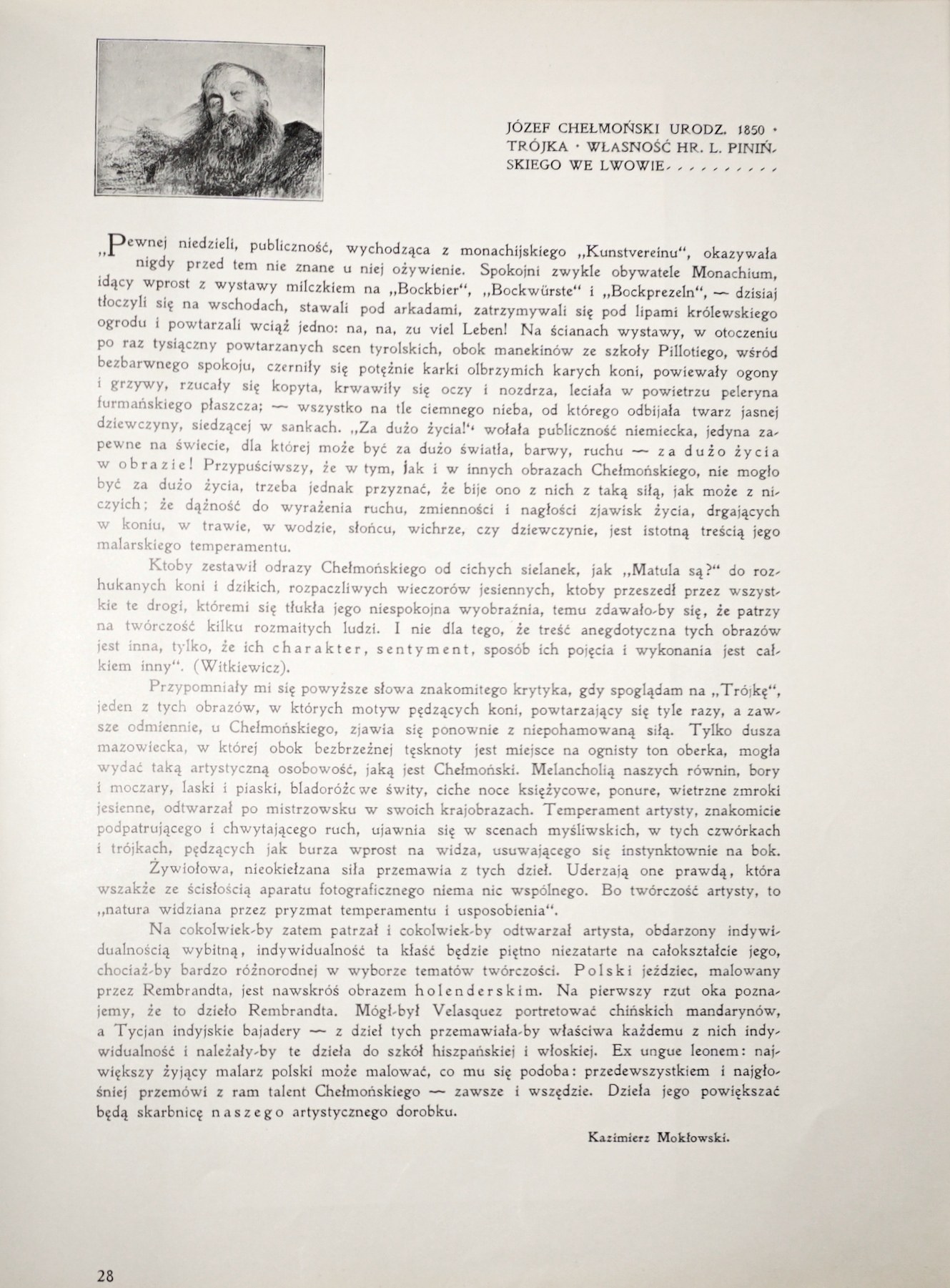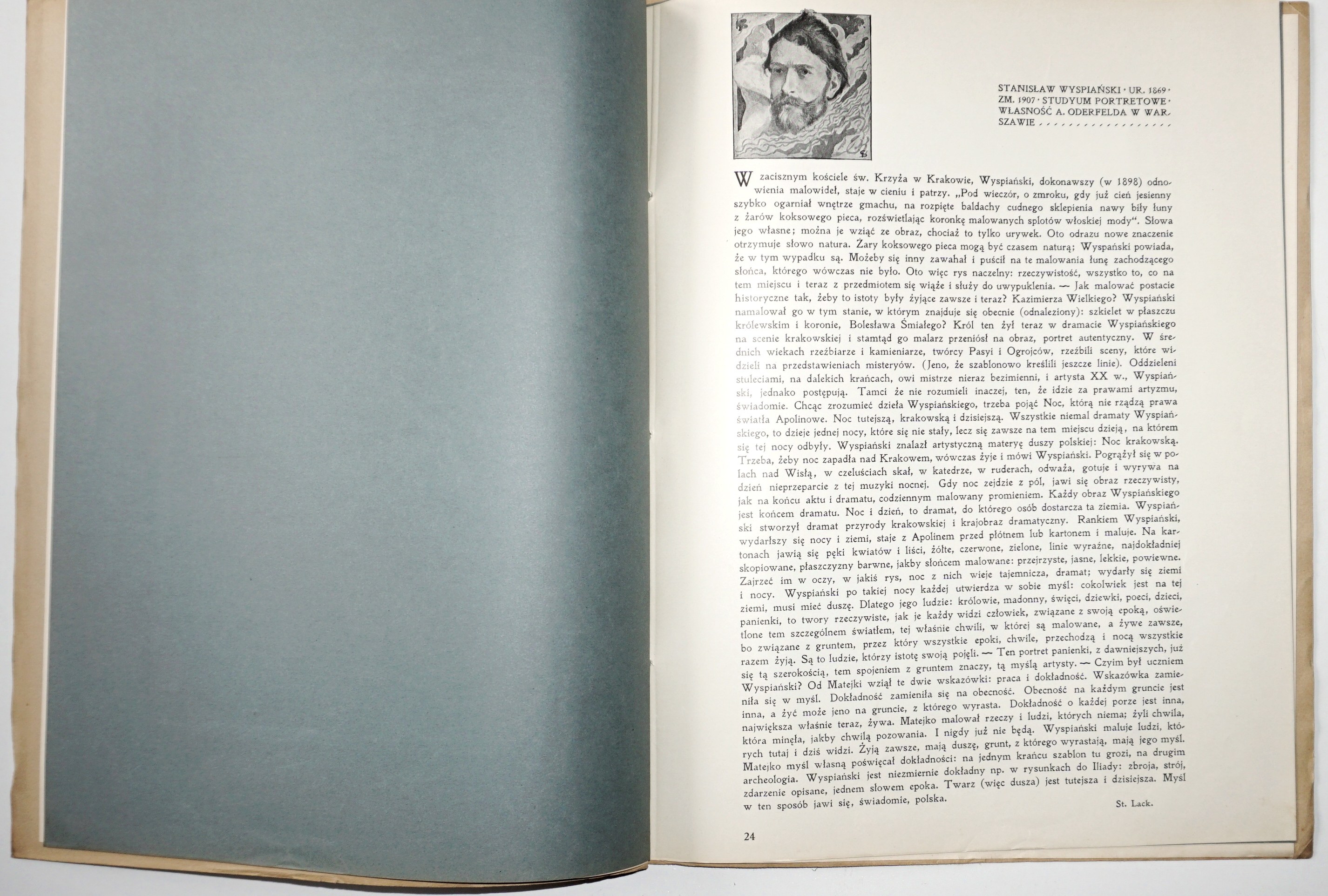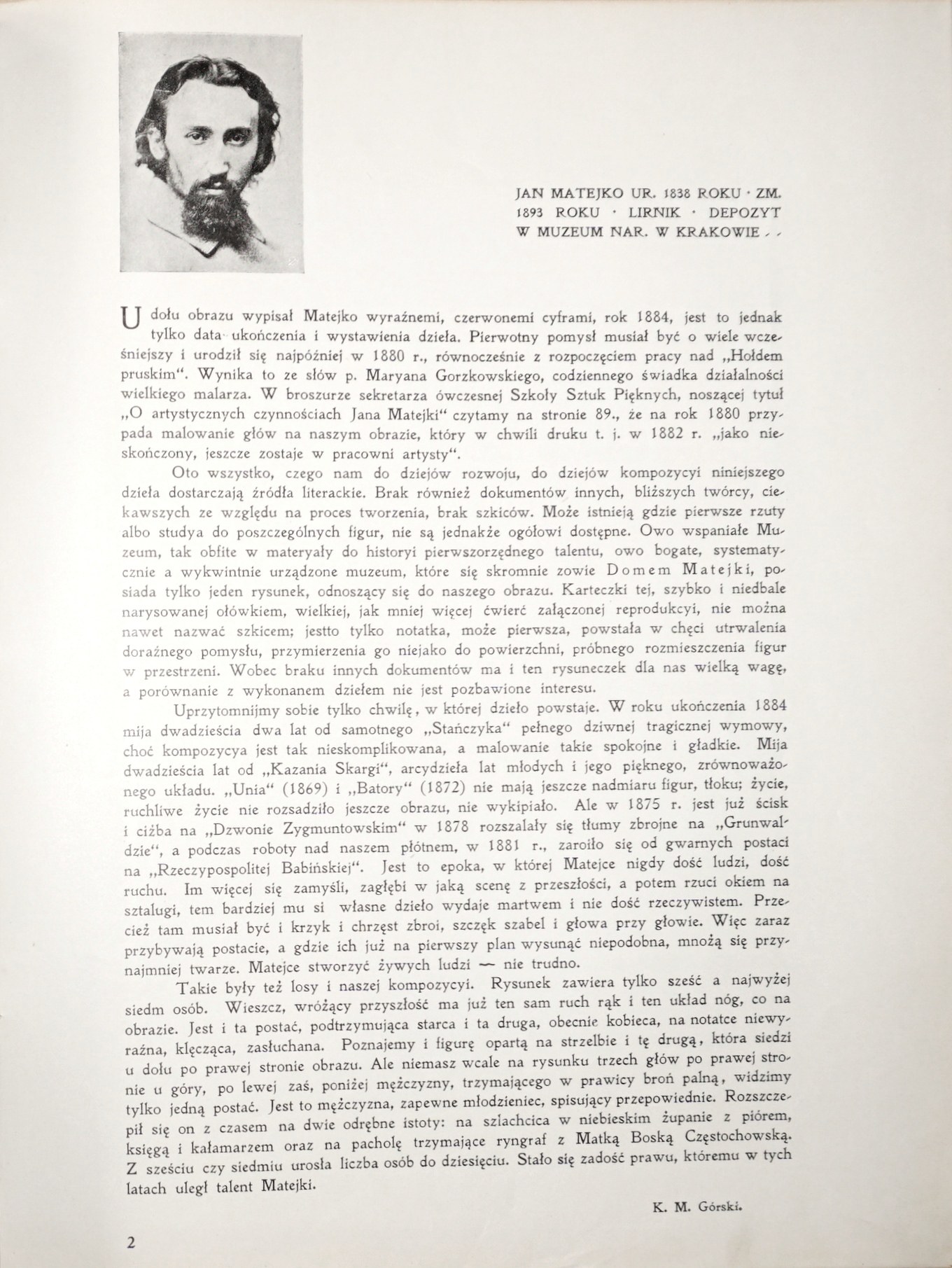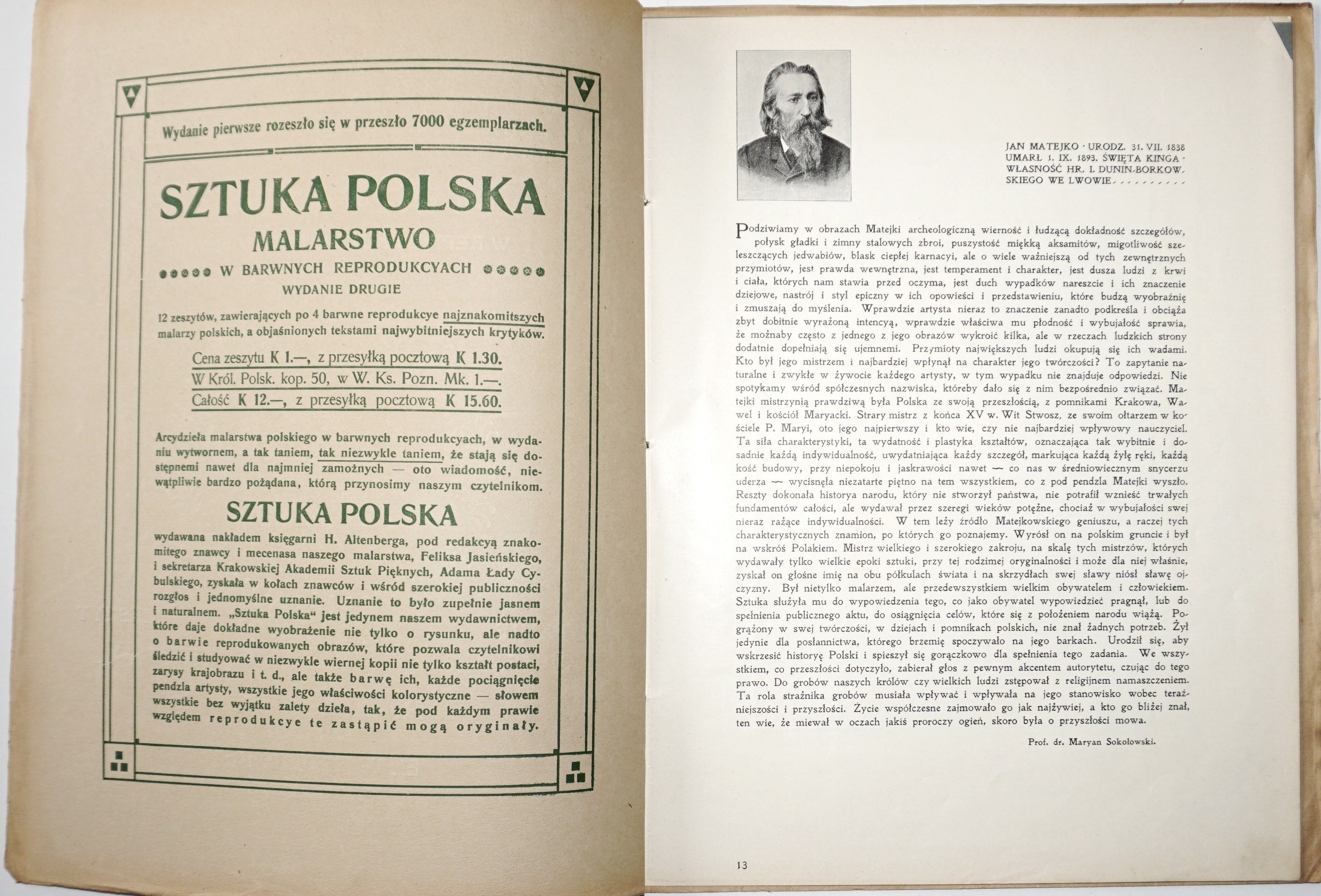 Barwne reprodukcje obrazów zamontowane na kartonowych podkładach, każdej planszy towarzyszy karta z tekstem objaśniającym. Na przedniej okł. w owalu scena z Matejkowskiego "Hołdu pruskiego". Oprawa w kolorze granatowym. Tytuł okł.: "Sztuka polska. Malarstwo w reprodukcyach kolorowych". Na początku przedmowa do wyd. z 1904.