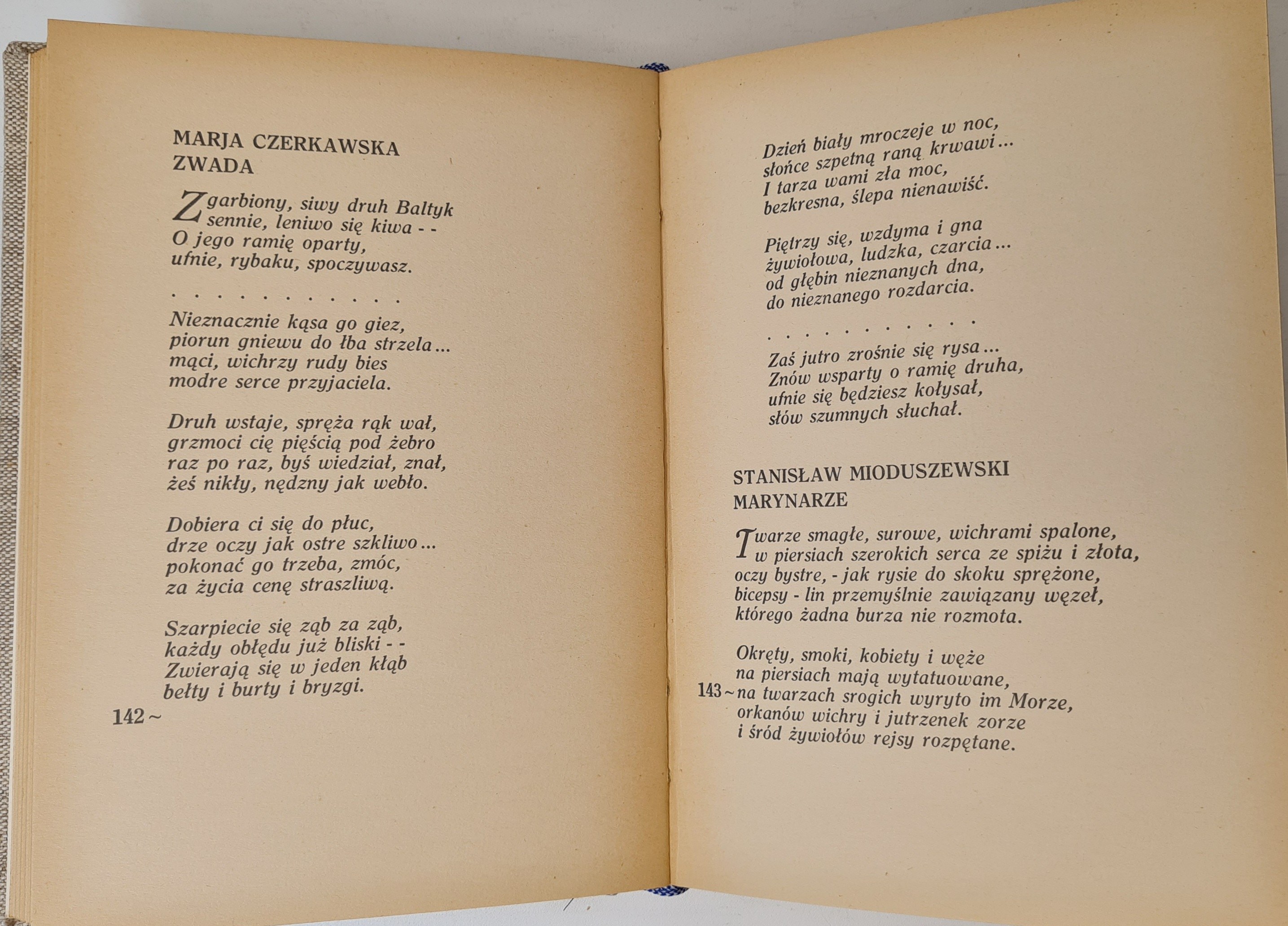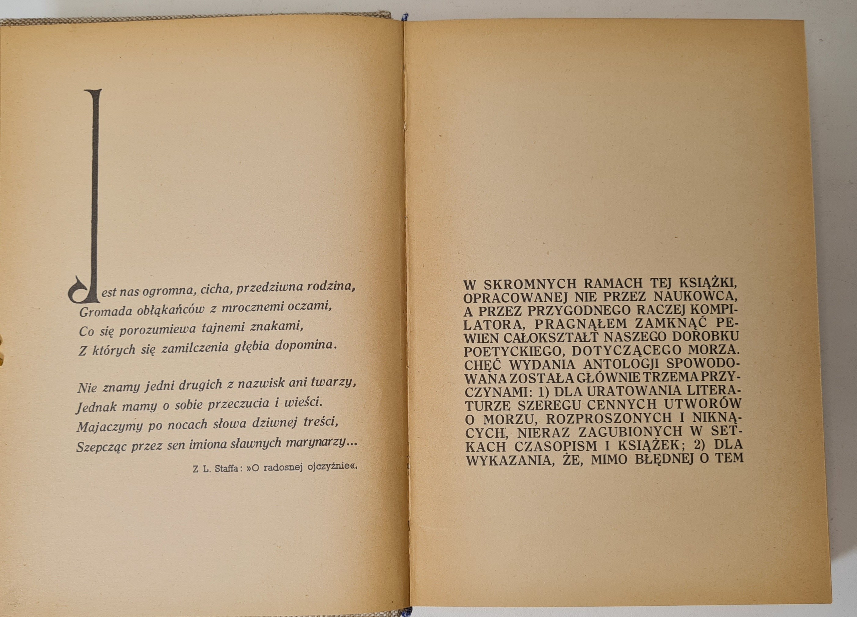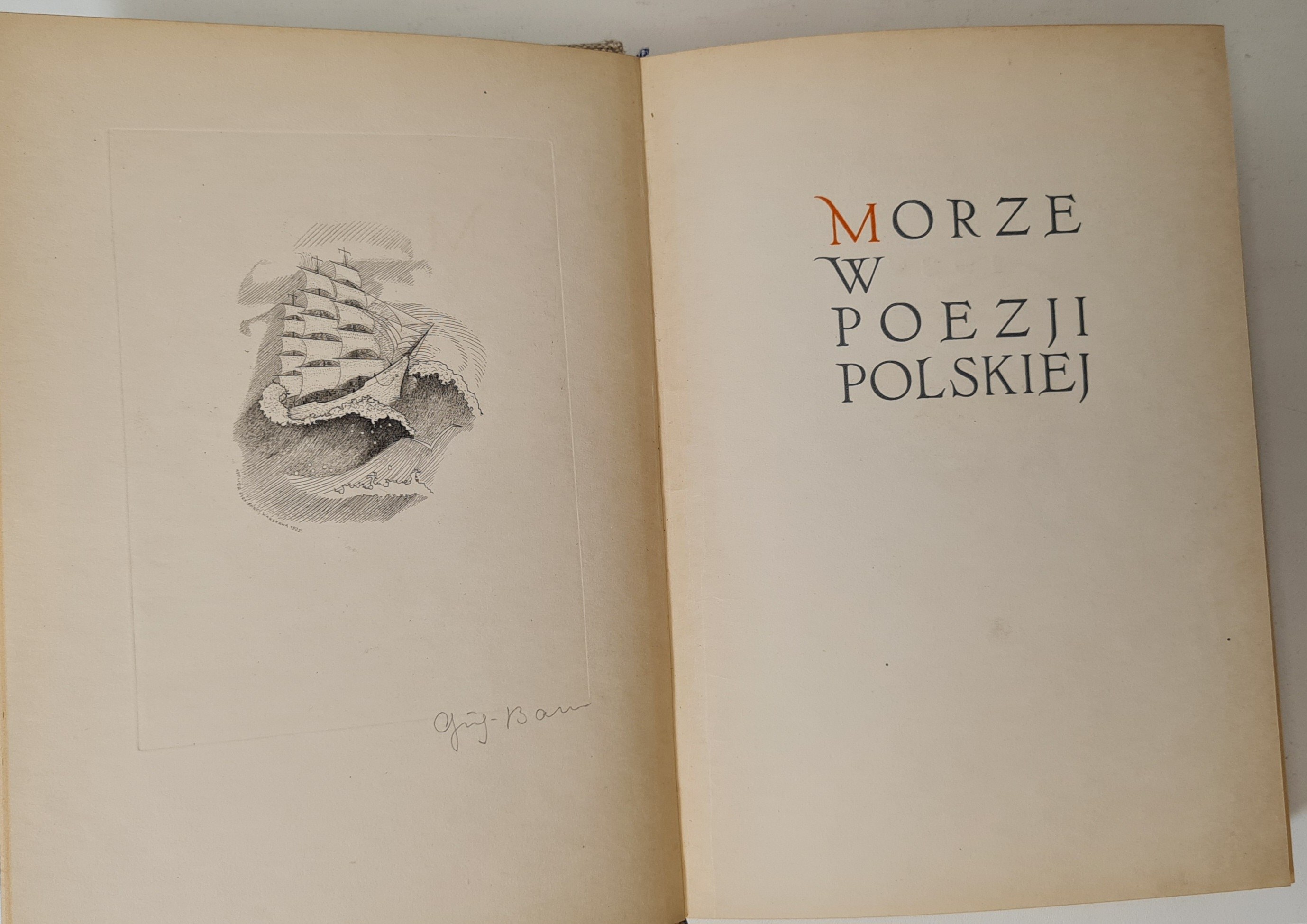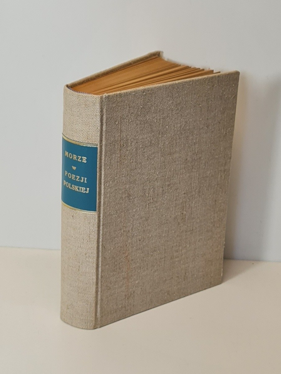 Jasiński Zbigniew Morze w poezji polskiej Antologia poezyj marynistycznych zebrał, omówił i całkowicie opracował ... Warszawa 1937. Nakładem Głównej Księgarni Wojskowej. wym.17,5x24cm. s.234. Oprawa introligatorska płótno lniane z e skórzanym szyldzikiem na grzbiecie w stanie dobrym+, zachowana oprawa miękka wydawnicza. Środek pożółknięty ogólny stan zachowania dobry +