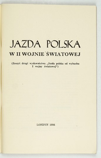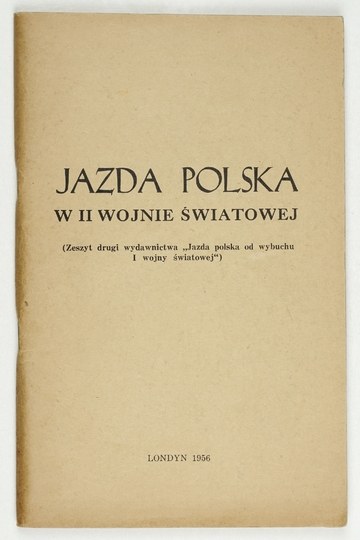 JAZDA polska w II wojnie światowej. (Zeszyt drugi wydawnictwa "Jazda polska od wybuchu I wojny światowej"). Londyn 1956. Zrzeszenie Kół Pułkowych Kawalerii. 8, s. 129, [2]. brosz.