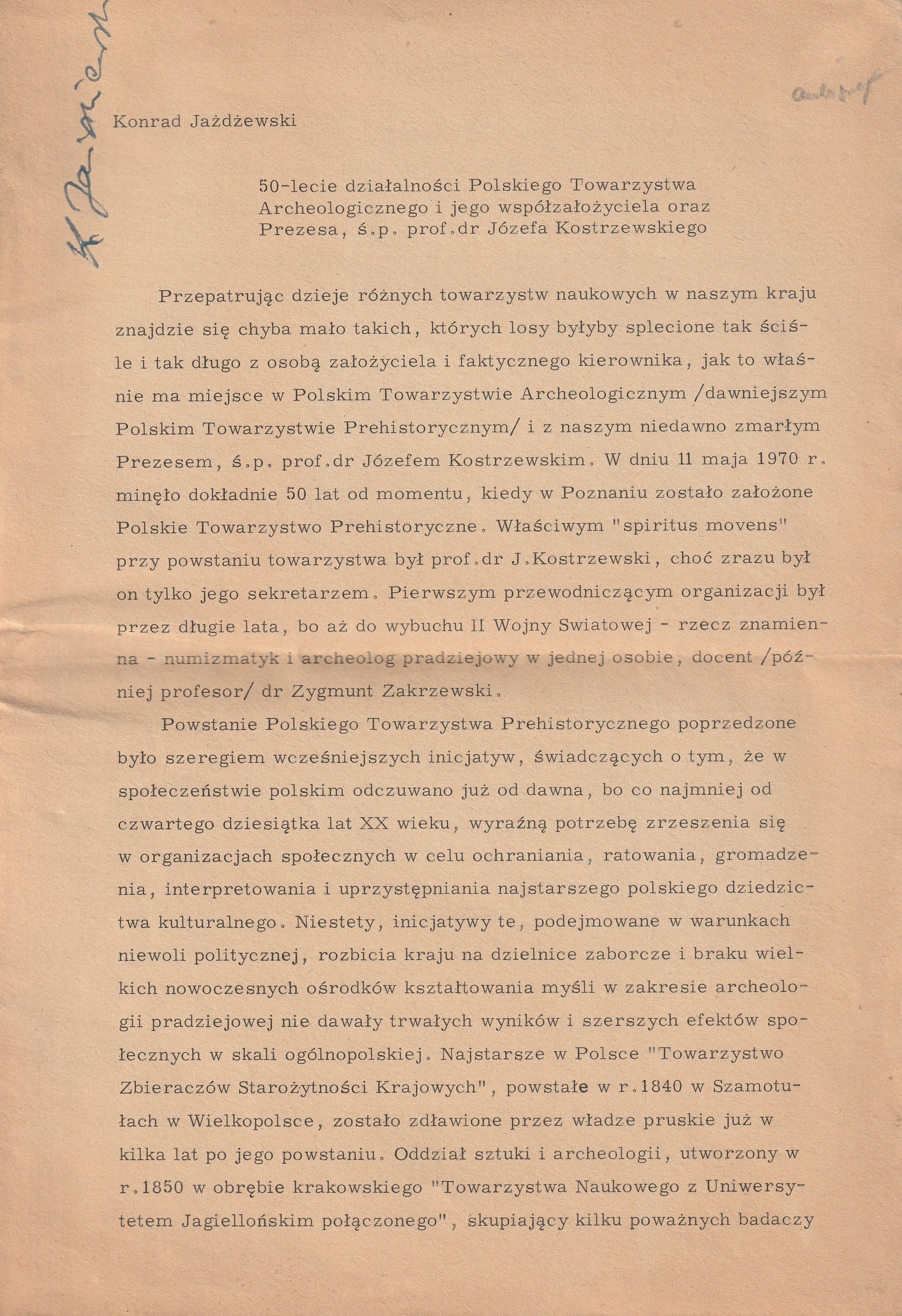 JAŻDŻEWSKI Konrad. 50-lecie działalności Polskiego Towarzystwa Archeologicznego i jego wspólżalożyciela o raz Prezesa, ś.p. prof. dr Józefa Kostrzewskiego, maszynopis Łódź, 3.03.1970, str. 19, na str. tyt. autograf autora; ślad złożenia, zagniecenia, st. db.; wym. ok. 200x290 mm.