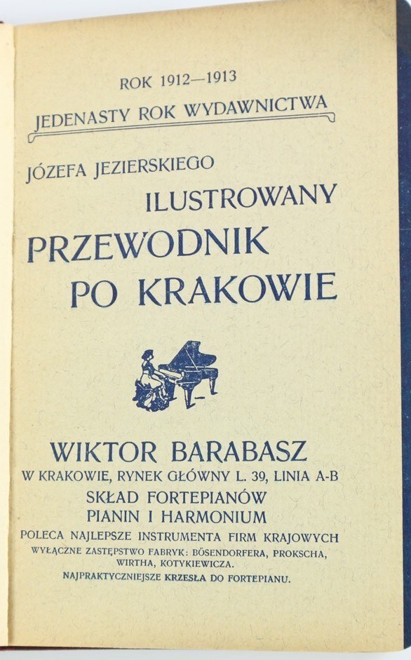 Jezierski Józef, Ilustrowany przewodnik po Krakowie i okolicy: 1912-1913, Kraków: [s.n., 1913], s. 94, [34], wymiary 12,5 x 18,5 cm. Ilustracje w tekście. 1 rozkł. tabl. Okładka płócienna z złoceniami na licu. Zachowane okładki broszurowe.