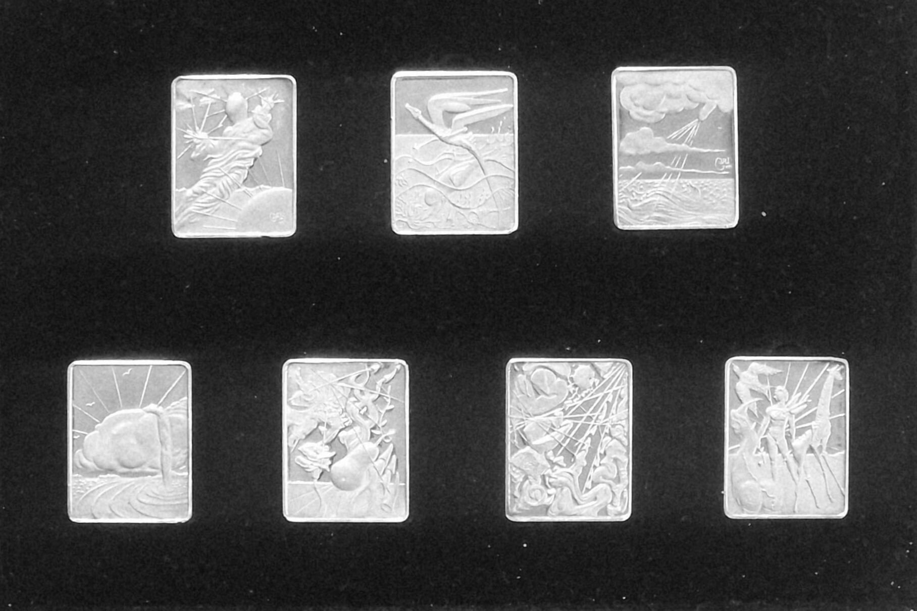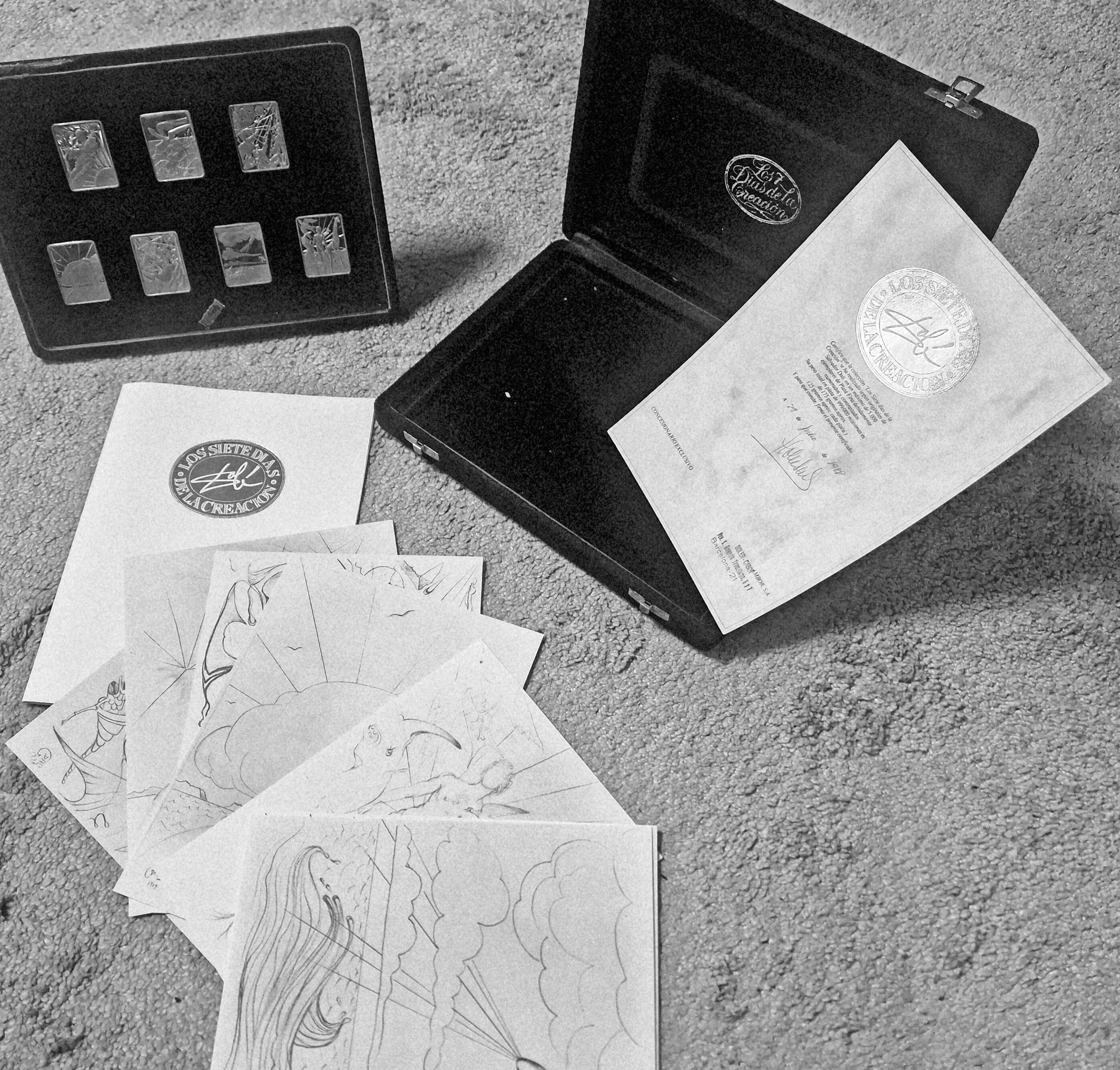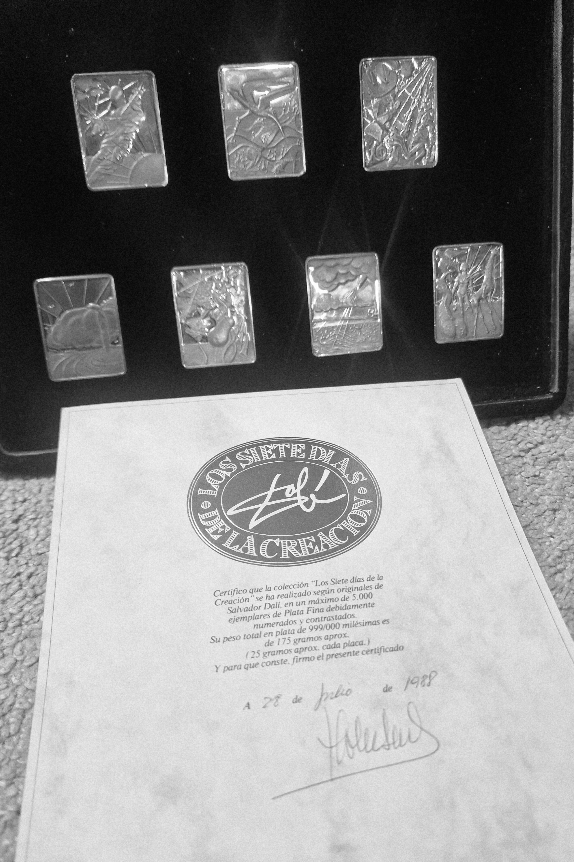 Komplet 7 litografii offsetowych na grubym kartonie będących projektami każdej z 7 sztabek, każda litografia podpisana przez Salvadora Dali i datowana (1978) na płycie; każda o wym. 22 x 17 cm; litografie wykonało Atelier Editorial Mediterrania; dołączona rozkładana teczka/okładka ze złoconą na licu sygnaturą Dalego i tytułem cyklu w jęz. Hiszpańskim „Los siete Dias De La Creacion”. Całość mieści się w etui pod ekspozytorem ze sztabkami. Ekspozytor posiada składaną nóżkę umożliwiającą prezentowanie sztabek w gablocie.