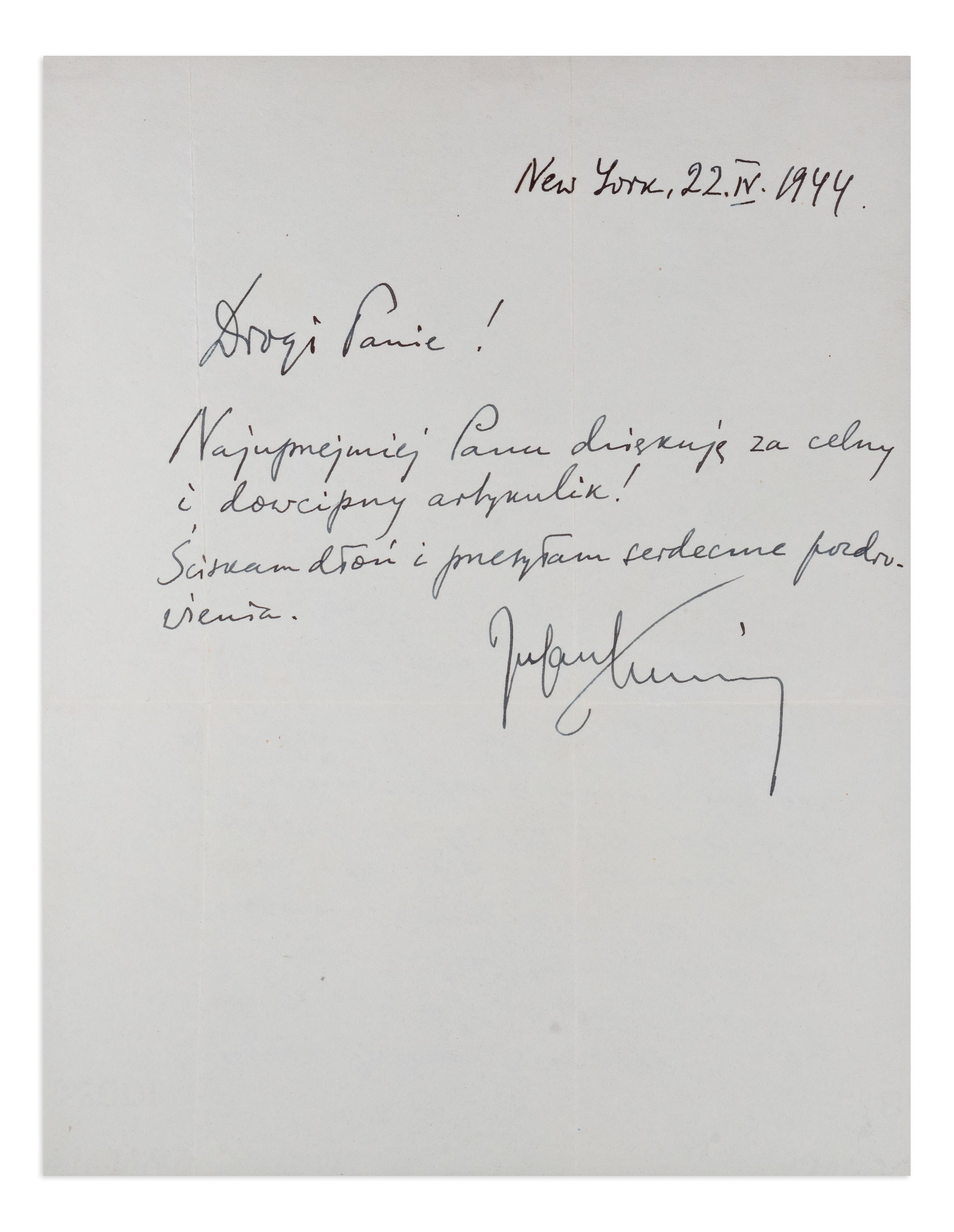 This letter is a valuable autograph from one of the most significant Polish poets of the 20th century. Tuwim was known not only for his poetry but also for his humor and satire, as reflected in this document, in which he expresses gratitude for a witty article. The letter comes from the period of his exile in the United States before his return to Poland after the war.
