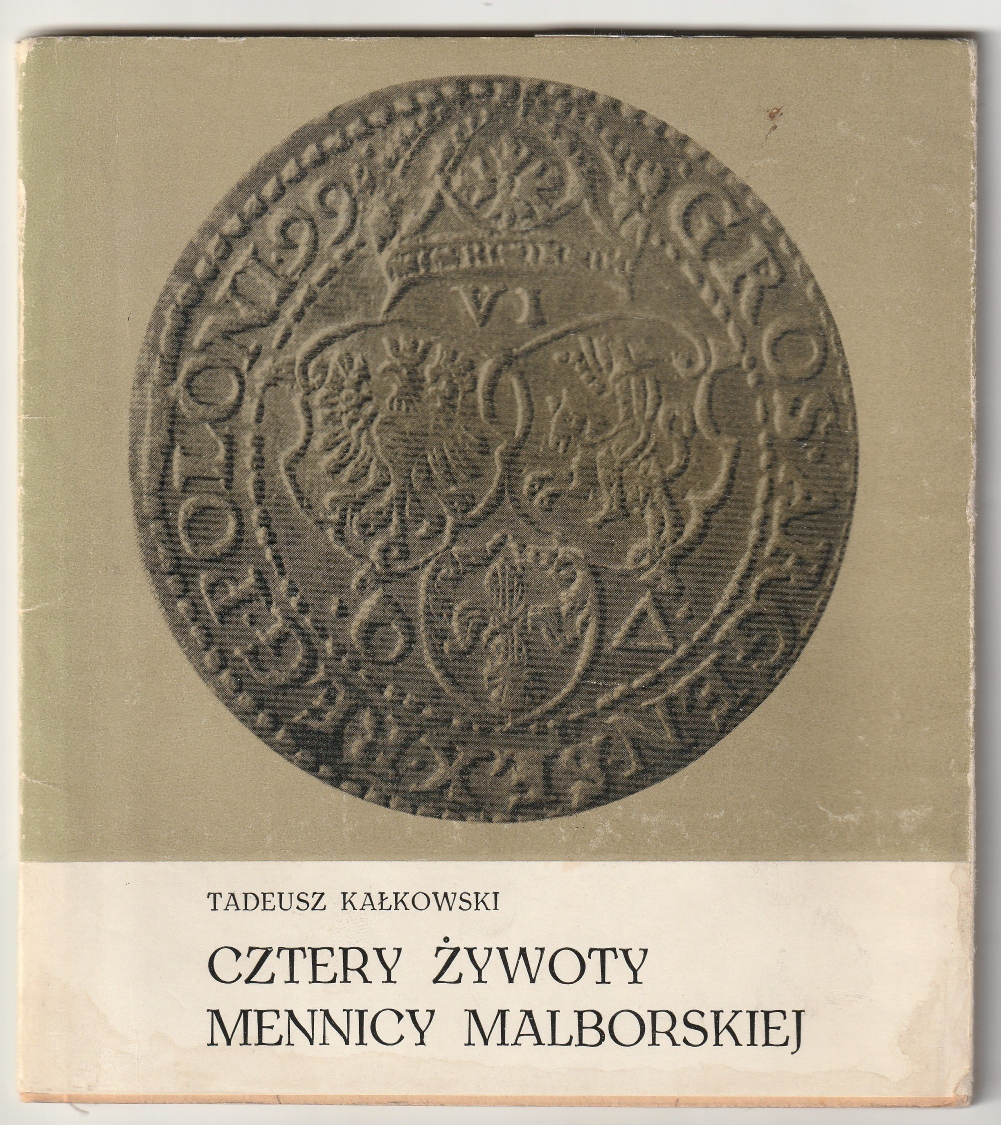 KAŁKOWSKI Tadeusz. Cztery żywoty mennicy malborskiej, wyd. Muzeum Zamkowe w Malborku, 1969, str. 67; oprawa miękka z obwolutą rozdartą z tyłu, st. bdb.; wym. ok. 160x180 mm.