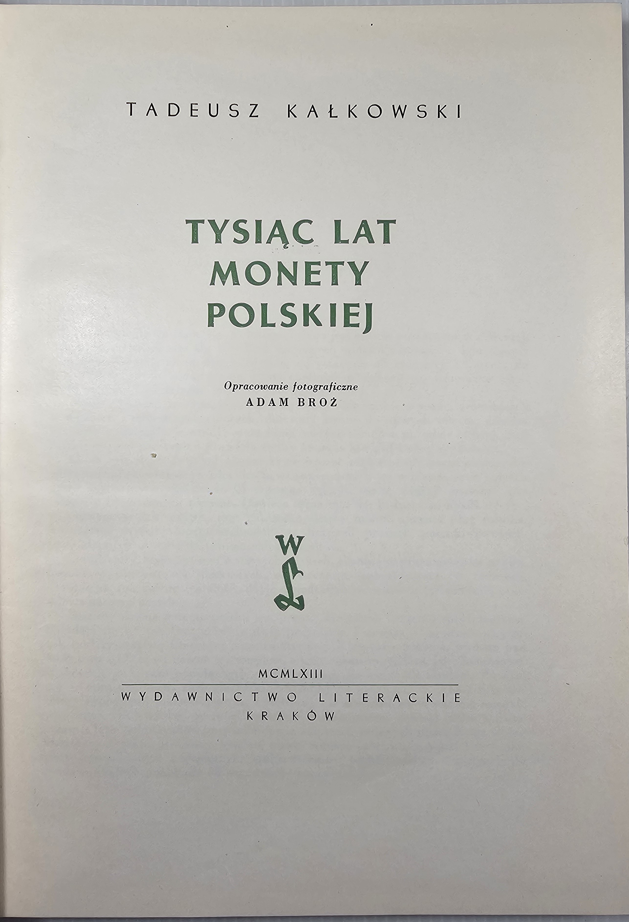 Kałkowski Tadeusz - Tysiąc lat monety polskiej. Kraków 1968 Wyd. Literackie.