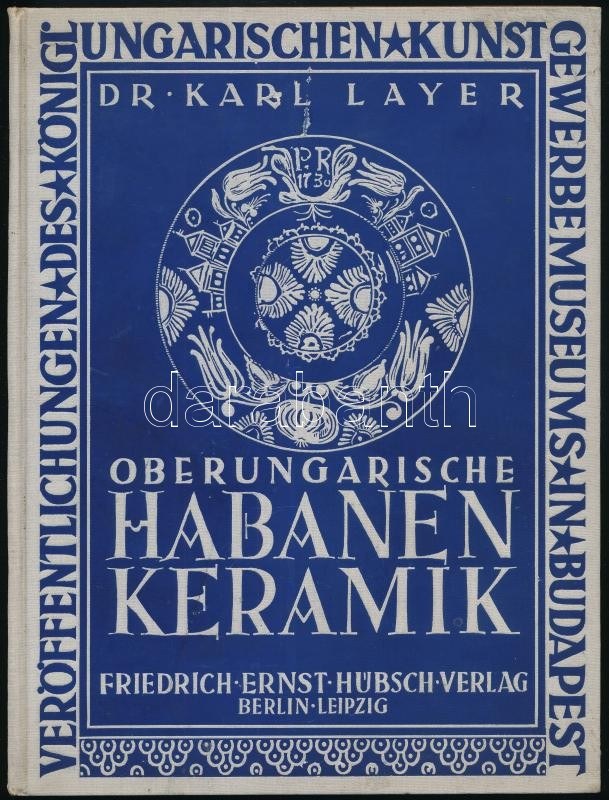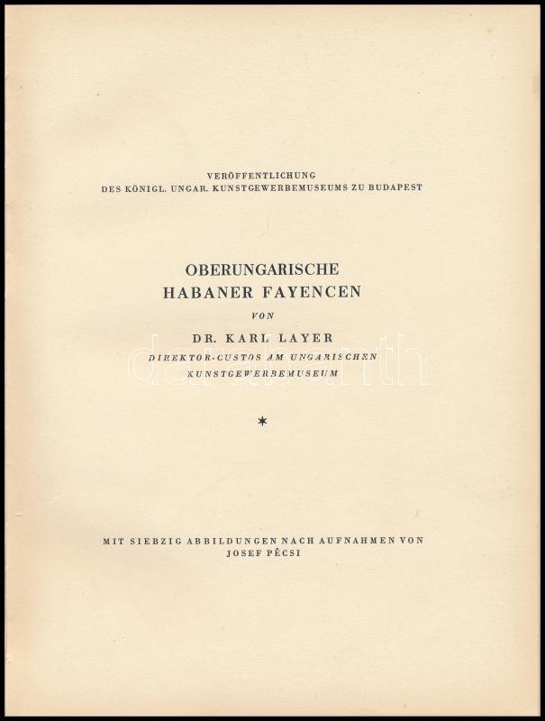Karl Layer: Oberungarische Habaner Fayencen. Mit 70 Abbildungen nach aufnahmen von Josef Pécsi. Berlin-Leipzig-Wien, 1927., Friedrich Ernst Hübsch Verlag, XVII+3 p. + 70 (Pécsi József (1889-1956) fotóművész habán kerámiákat tartalmazó fekete-fehér fotói) t. +2+14 (kiadói reklámok) p. Német nyelven. Gazdag képanyaggal illusztrált. Kiadói, festett egészvászon-kötésben.