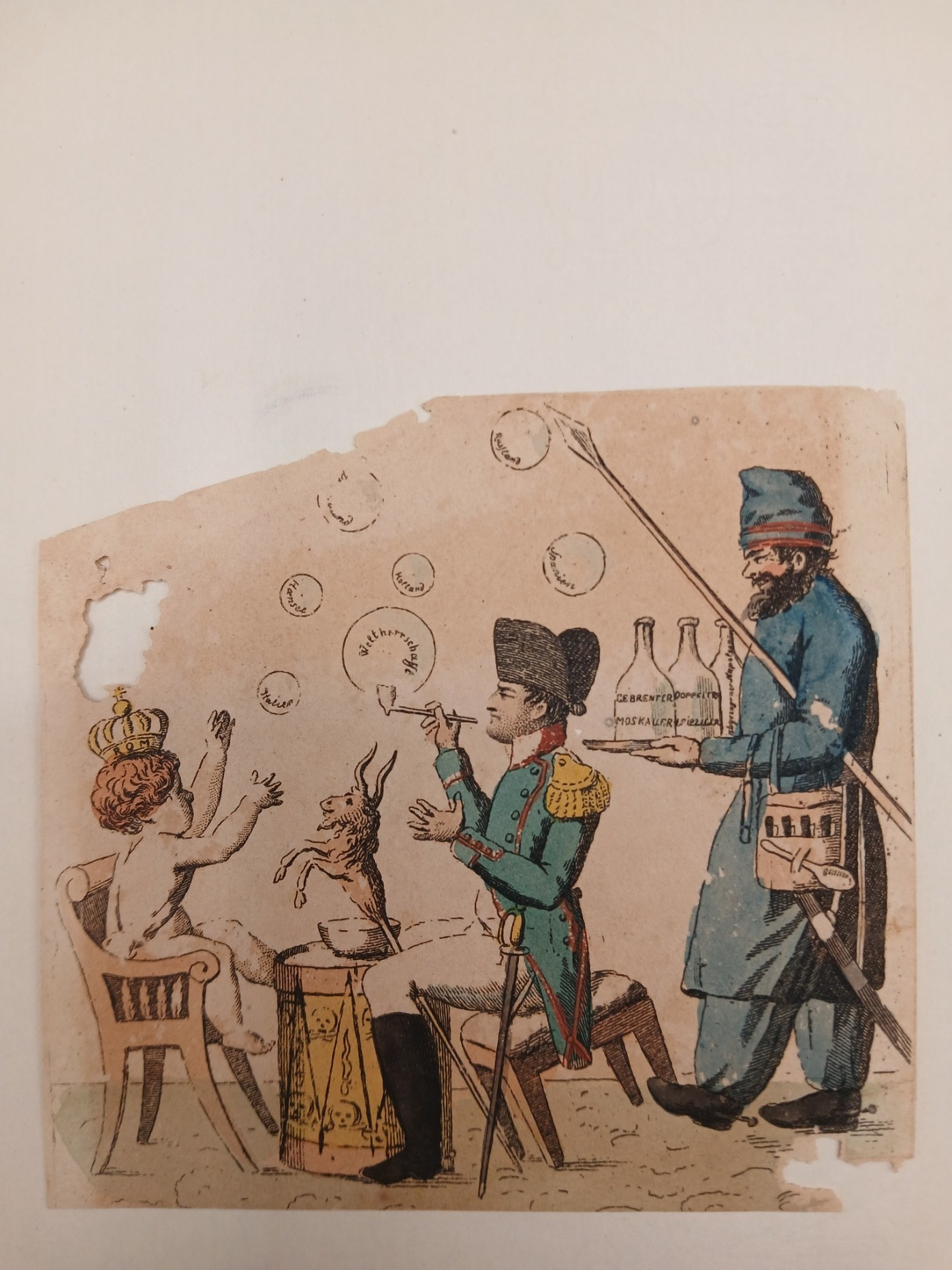 PRUSKA KARYKATURA ANTYNAPOLEOŃSKA Z EPOKI. NAPOLEON PUSZCZA ORLĄTKU MYDLANE BAŃKI (swoich podbojów: WŁOCHY, HISZPANIA, ROSJA), kozak z trunkami, które zdecydowanie mogą przyprawić przynajmniej o ból głowy, jedna z butelek z etykietą Moskwa[...]