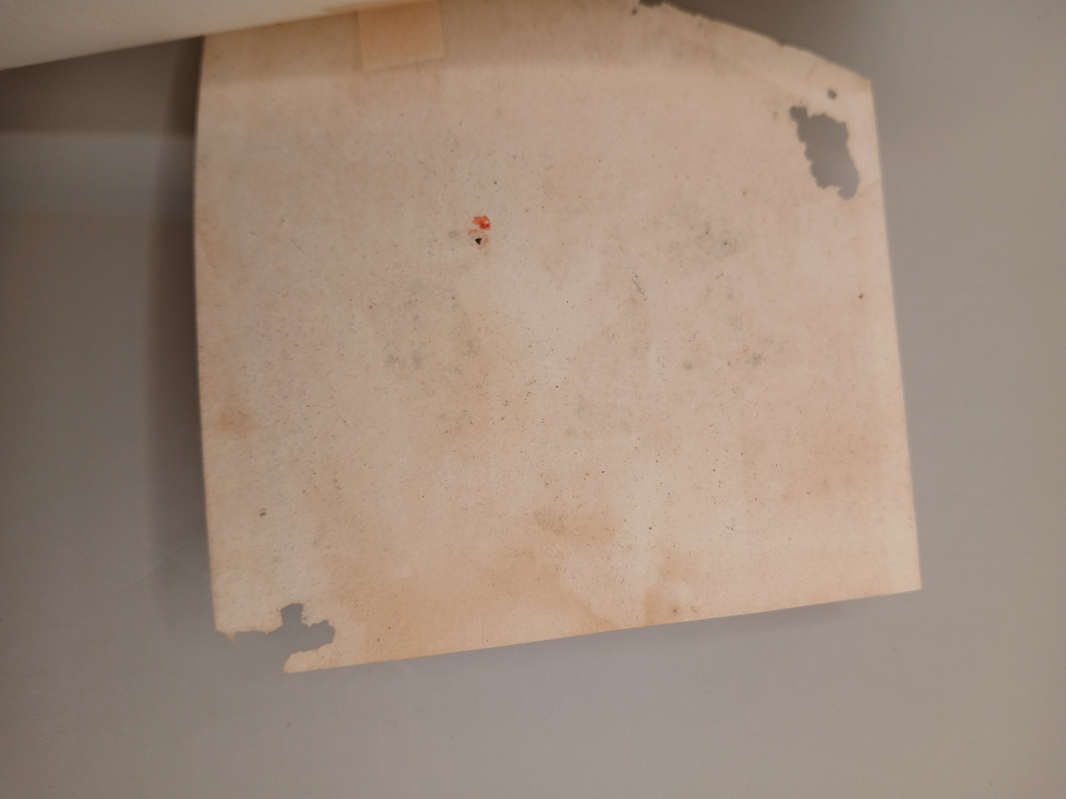 miedzioryt ok. 10 x 9,5 cm. Rycina mocno przycięta i uszkodzona, na grubym papierze, kolorowana w epoce, podklejona "podlepką" do kartki papieru.