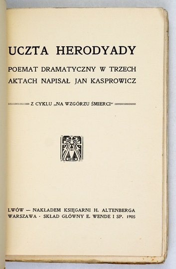 KASPROWICZ Jan - Uczta Herodyady. Poemat dramatyczny w trzech aktach. Z cyklu "Na Wzgórzu Śmierci". Lwów 1905. Księg. H. Altenberga. 8, s. [6], 194. brosz.