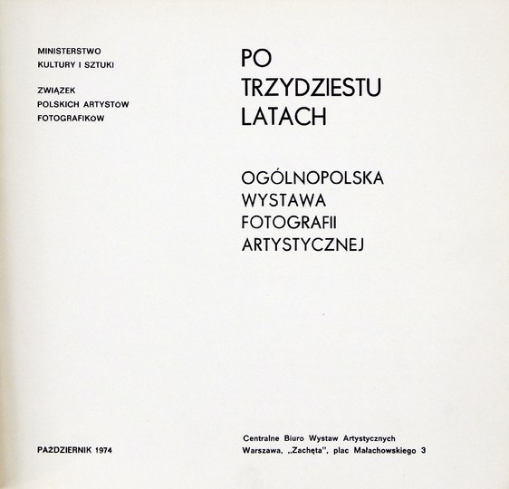 [KATALOG]. CBWA Warszawa, "Zachęta". Po trzydziestu latach. Ogólnopolska wystawa fotografii artystycznej. Warszawa, X 1974. Ministerstwo Kultury i Sztuki, Związek Polskich Artystów Fotografików. 8, s. [47]. brosz.