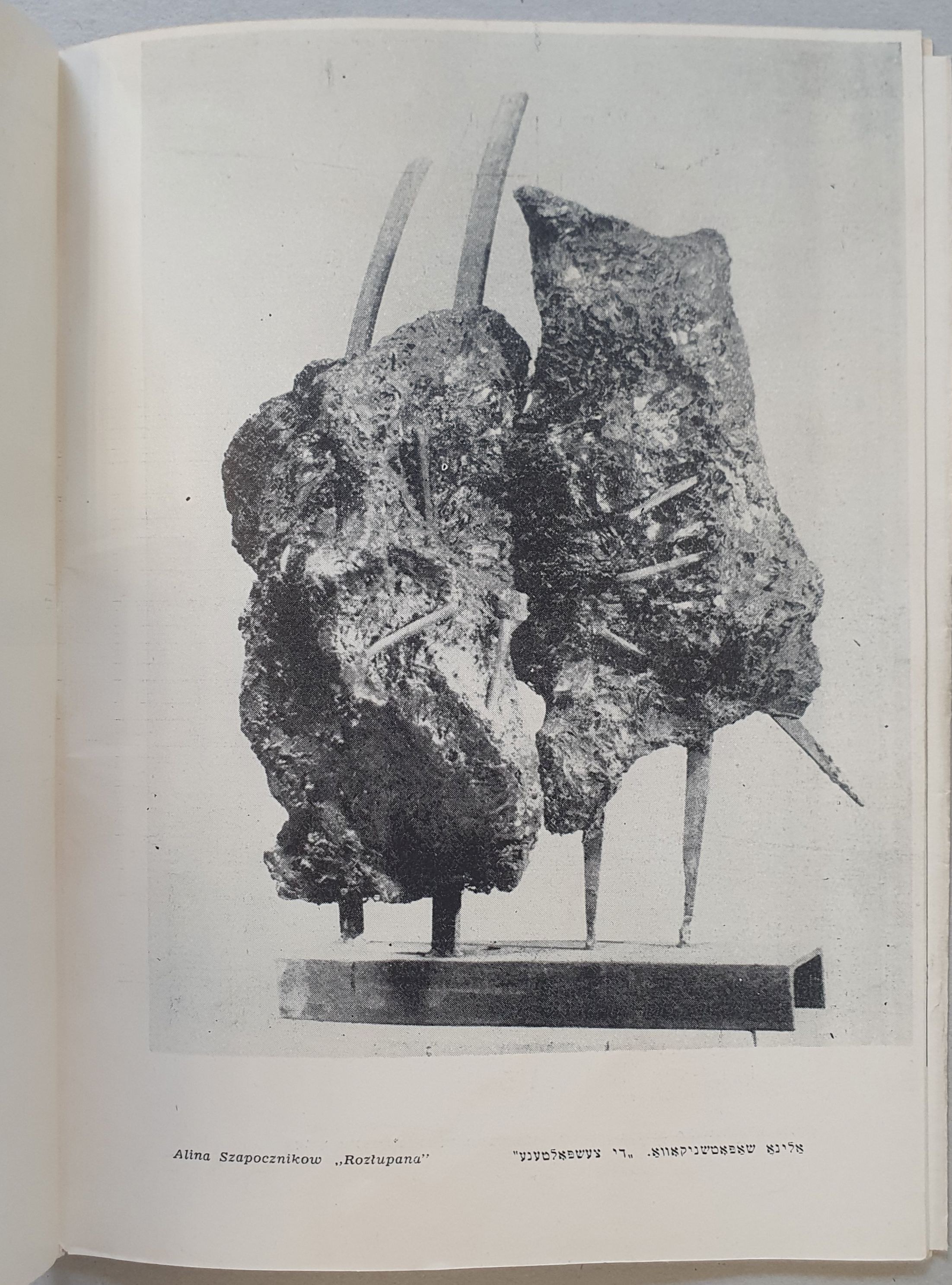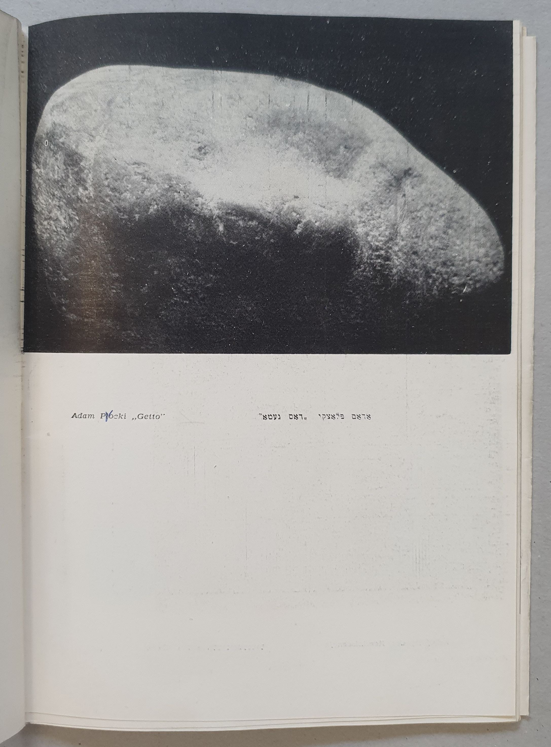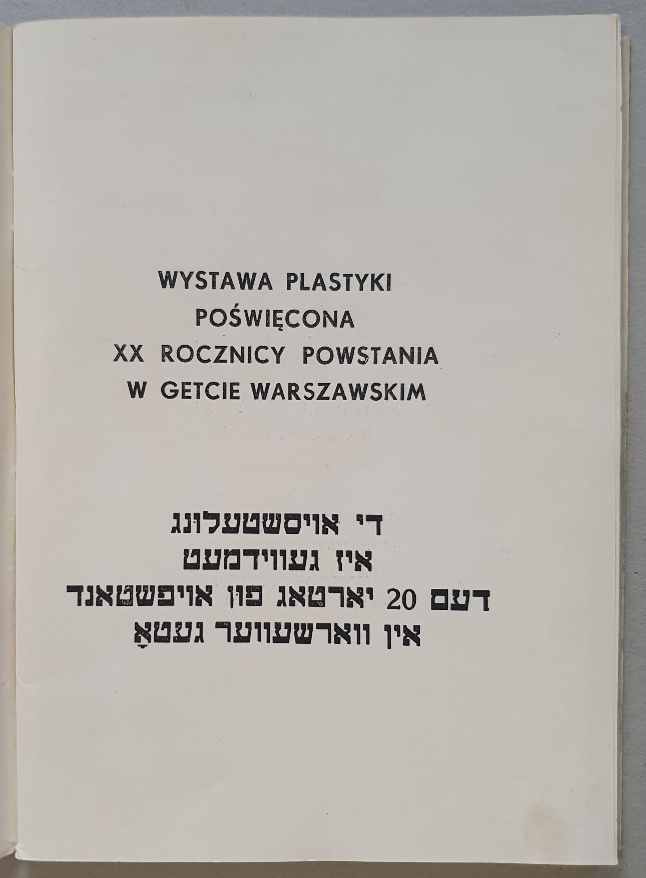 Katalog, 22 s. nlb. w części opisowej, tekst w języku polskim i jidysz, 42 s. - fotografie dzieł prezentowanych na wystawie. Zachowana obwoluta.