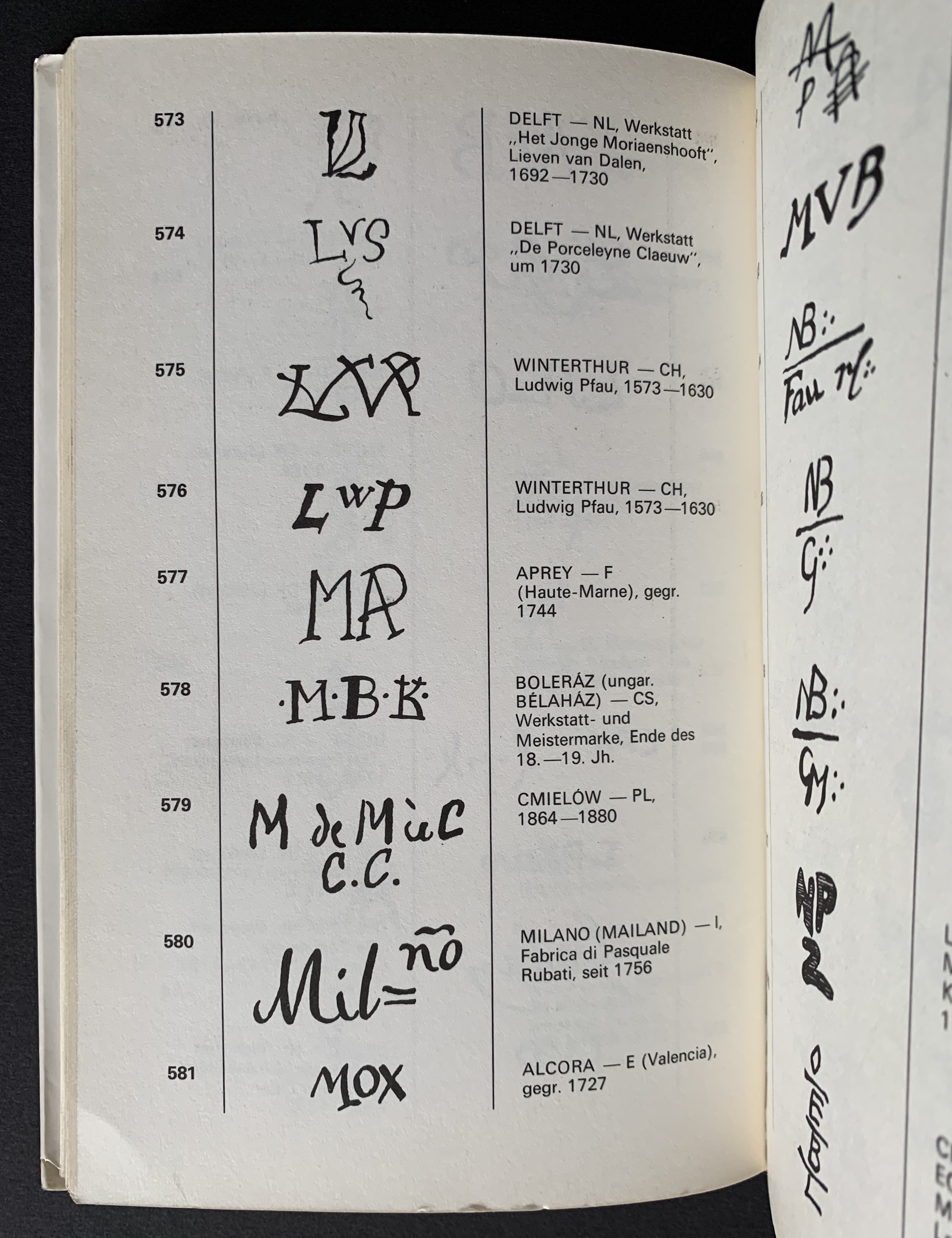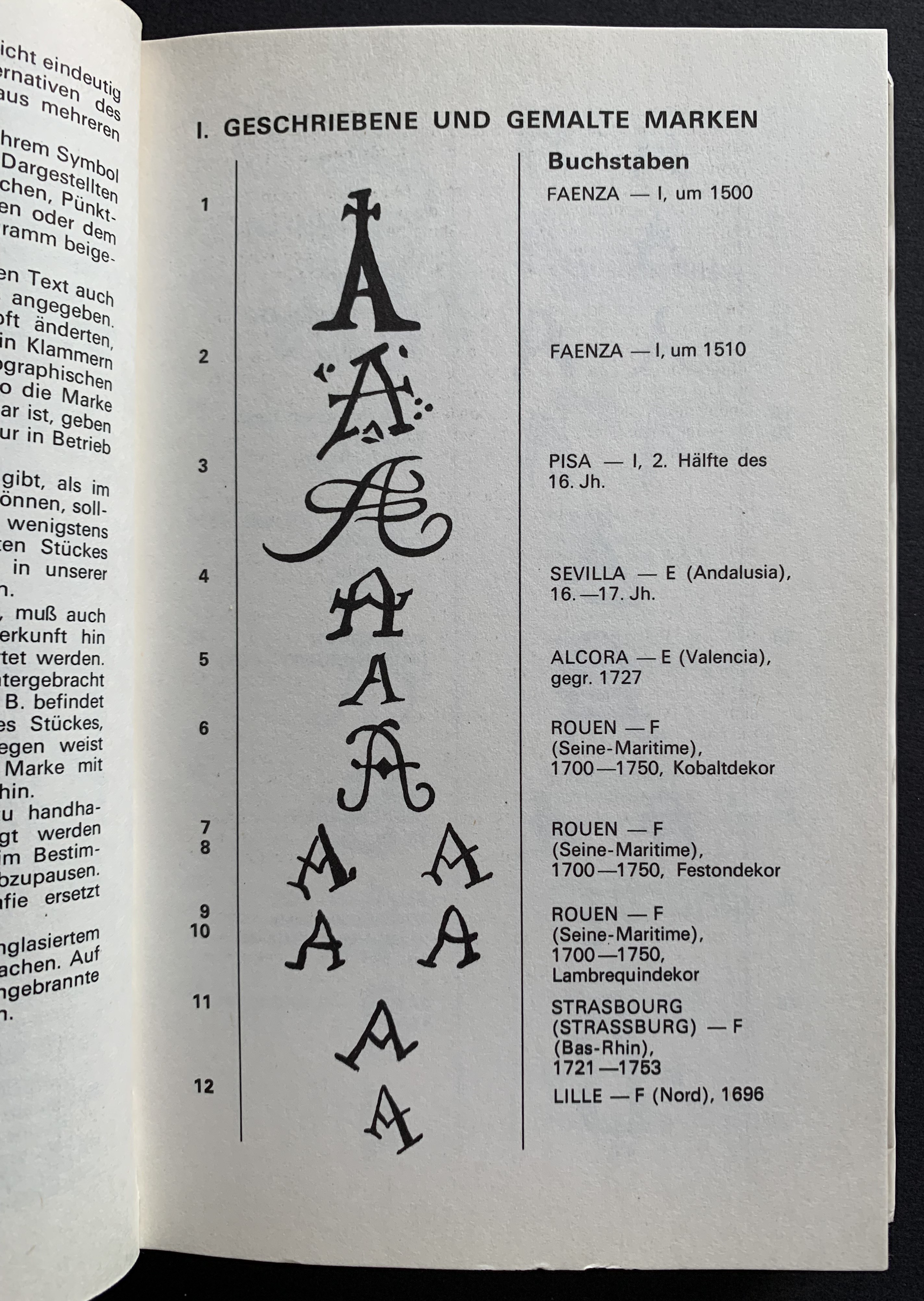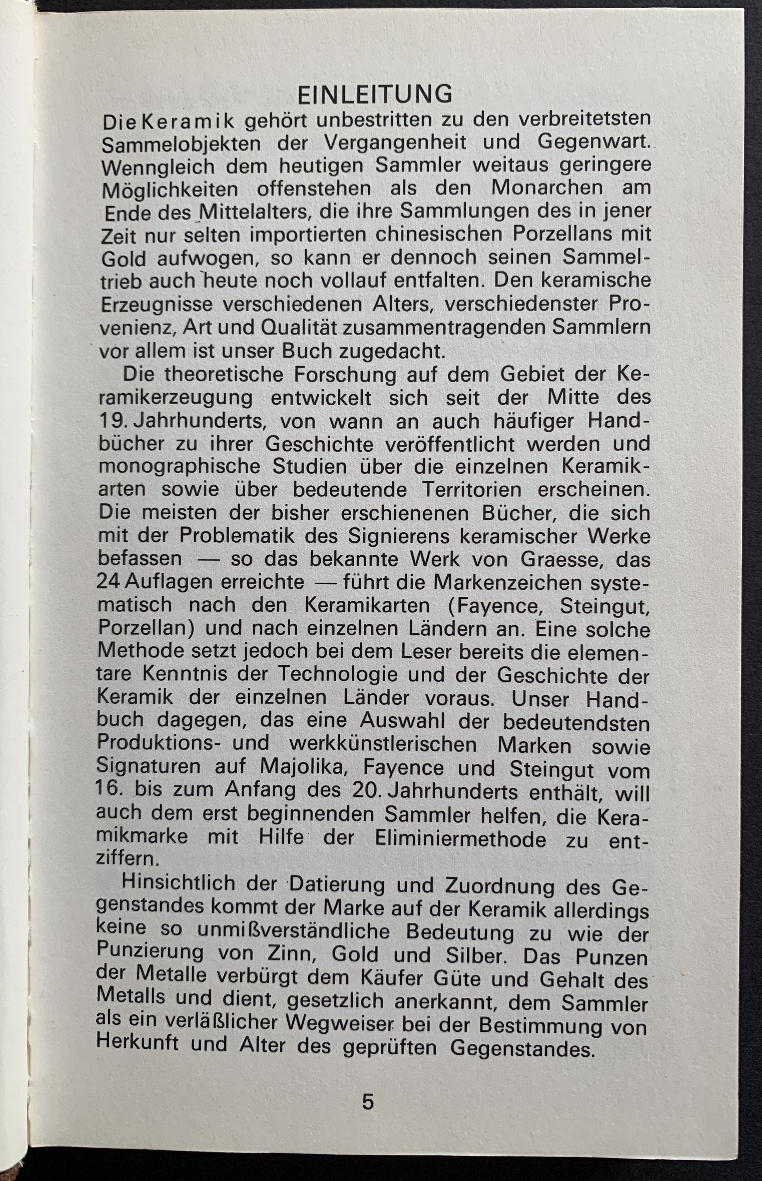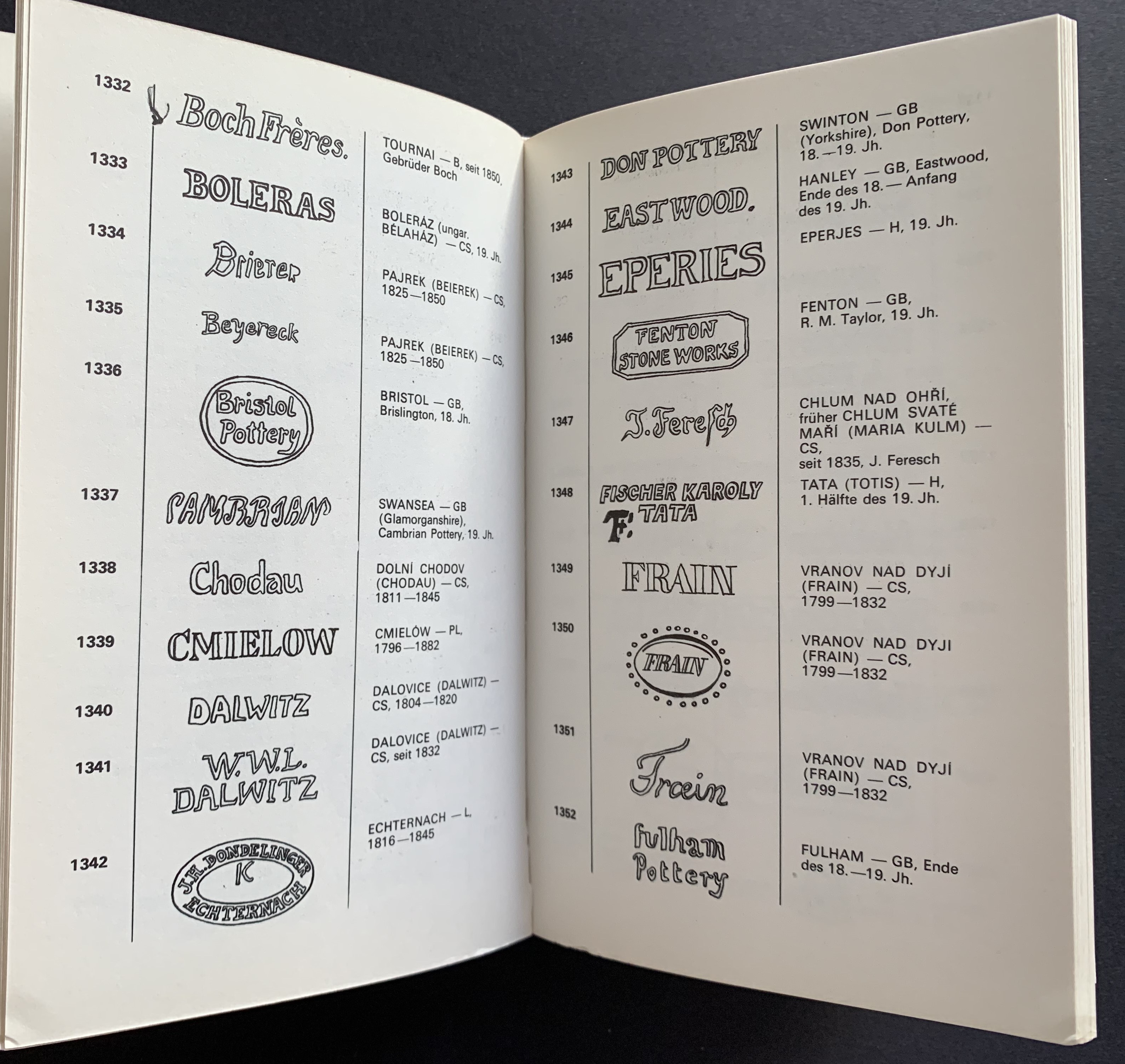 Niezastąpiony katalog przedstawiający sygnatury i znaki używane na ceramice, kamionce, fajansie, majolice, czy terakocie. obejmujący cały świat. Katalog ułożony w porządku alfabetycznym oraz typograficznym, przejrzysty i pomocny w wydatowaniu przedmiotu i określeniu jego pochodzenia. Popularny wśród kolekcjonerów katalog przedstawia 1 782 sygantury .