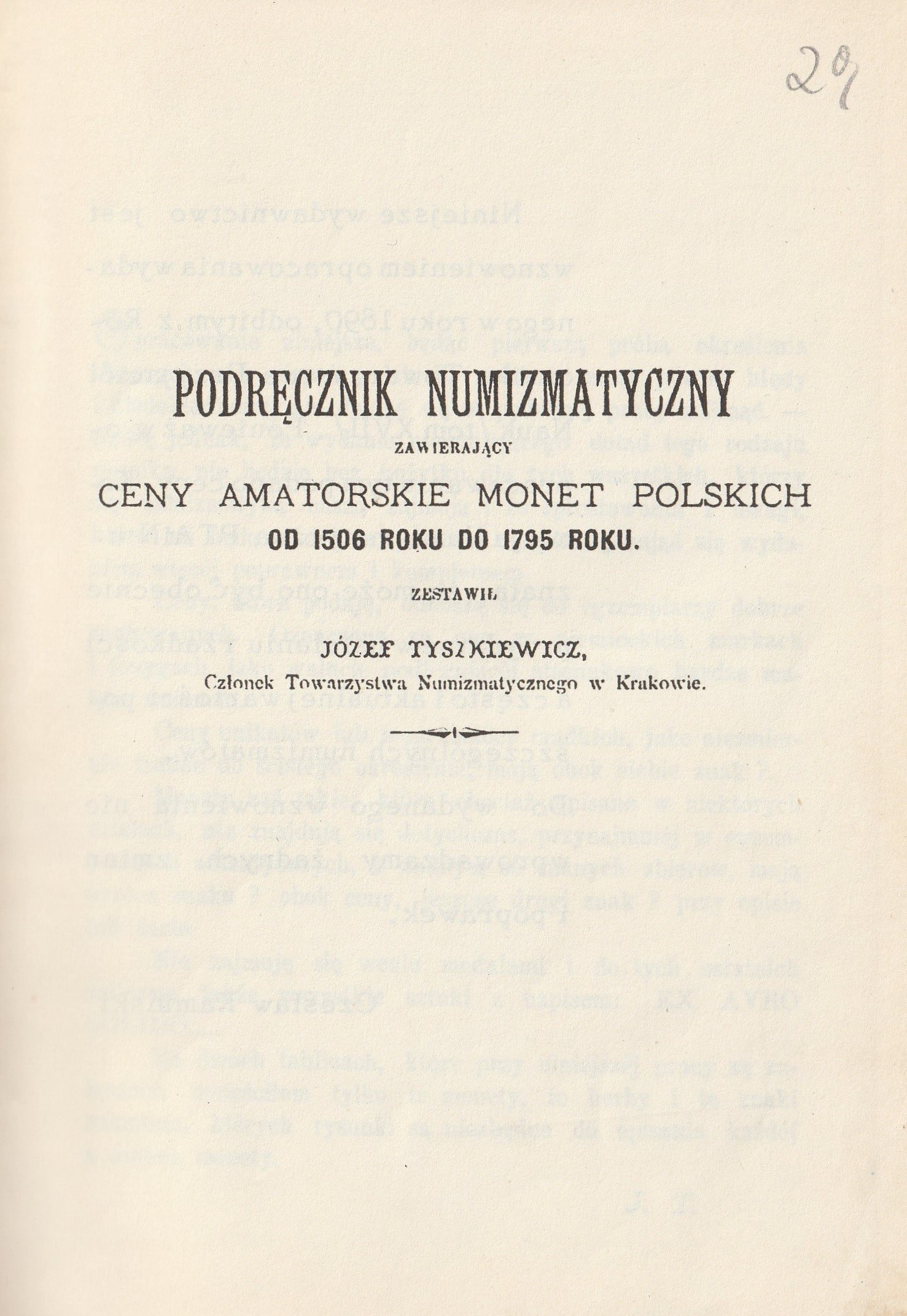 KATALOG MONET. 1) Podręcznik numizmatyczny zawierający ceny amatorskie monet polskich od 1506 roku do 1795 roku zestawił Józef Tyszkiewicz (wznowienie wyd. z 1890 ze słowem wstępnym Czesława Kamińskiego), wyd. PTAiN, Warszawa 1973, str. 68; 2) W. Niemirycz, Katalog monet polskich spółdzielni wojskowych z lat 1925-1939, wyd. PTAiN, Warszawa 1983, str. 57 (dedykacja i autograf autora); 3) A. Schmidt, Katalog żetonów gazowych z ziem polskich, Piła 1986 (?) str. 116; 4) B. Sikorski, Monety zastępcze obozów jeńców wojennych 1914-1918 (Emisje urzędowe), Piła 1989 (?), str. 111 (dedykacja i autograf autora); w jednej, oprawie, twardej, imitacja skóry, ze złotym napisem na grzbiecie: Katalog monet; st. bdb.; o wym. ok. 140x200 mm; razem 4 katalogi.