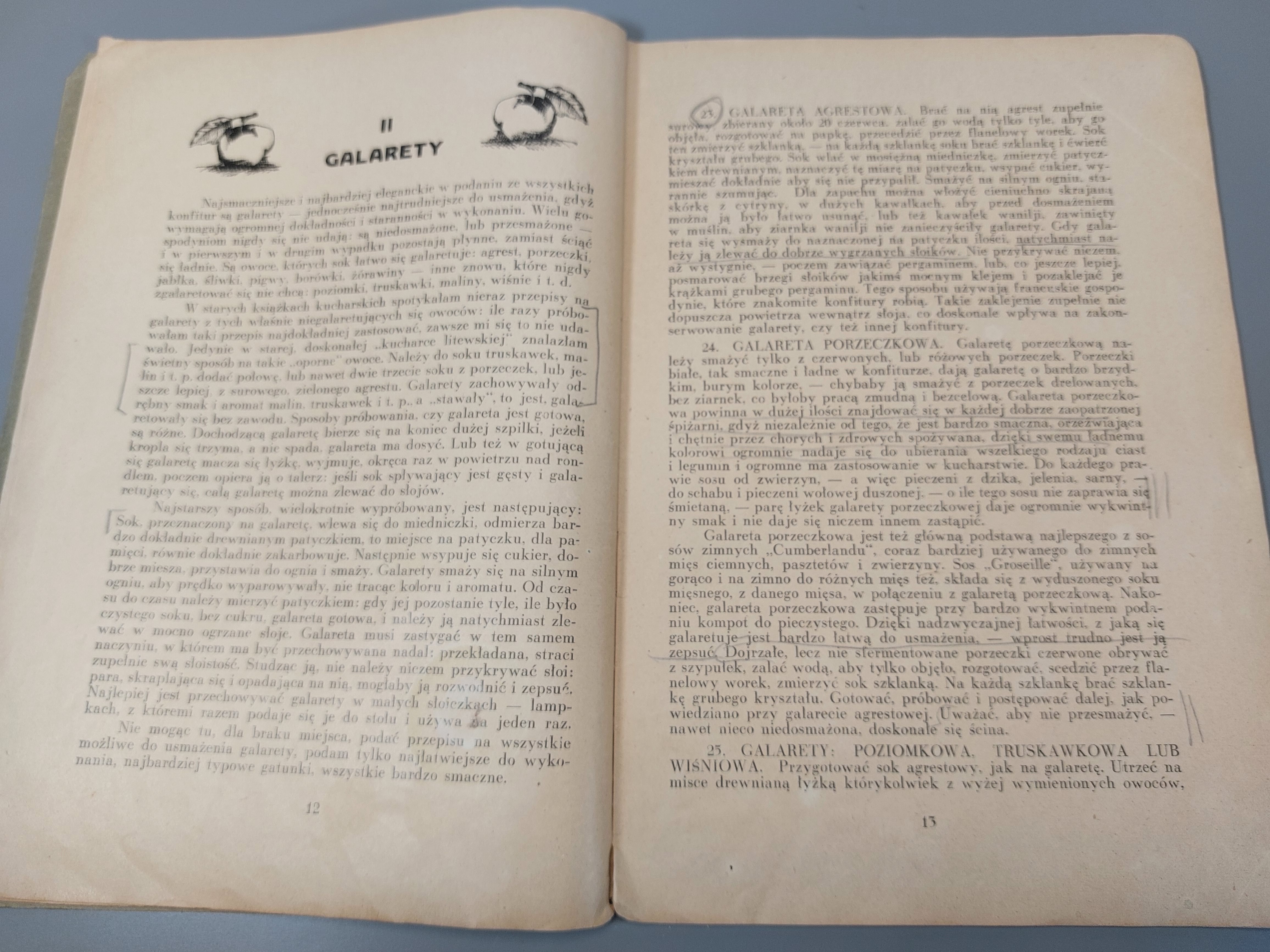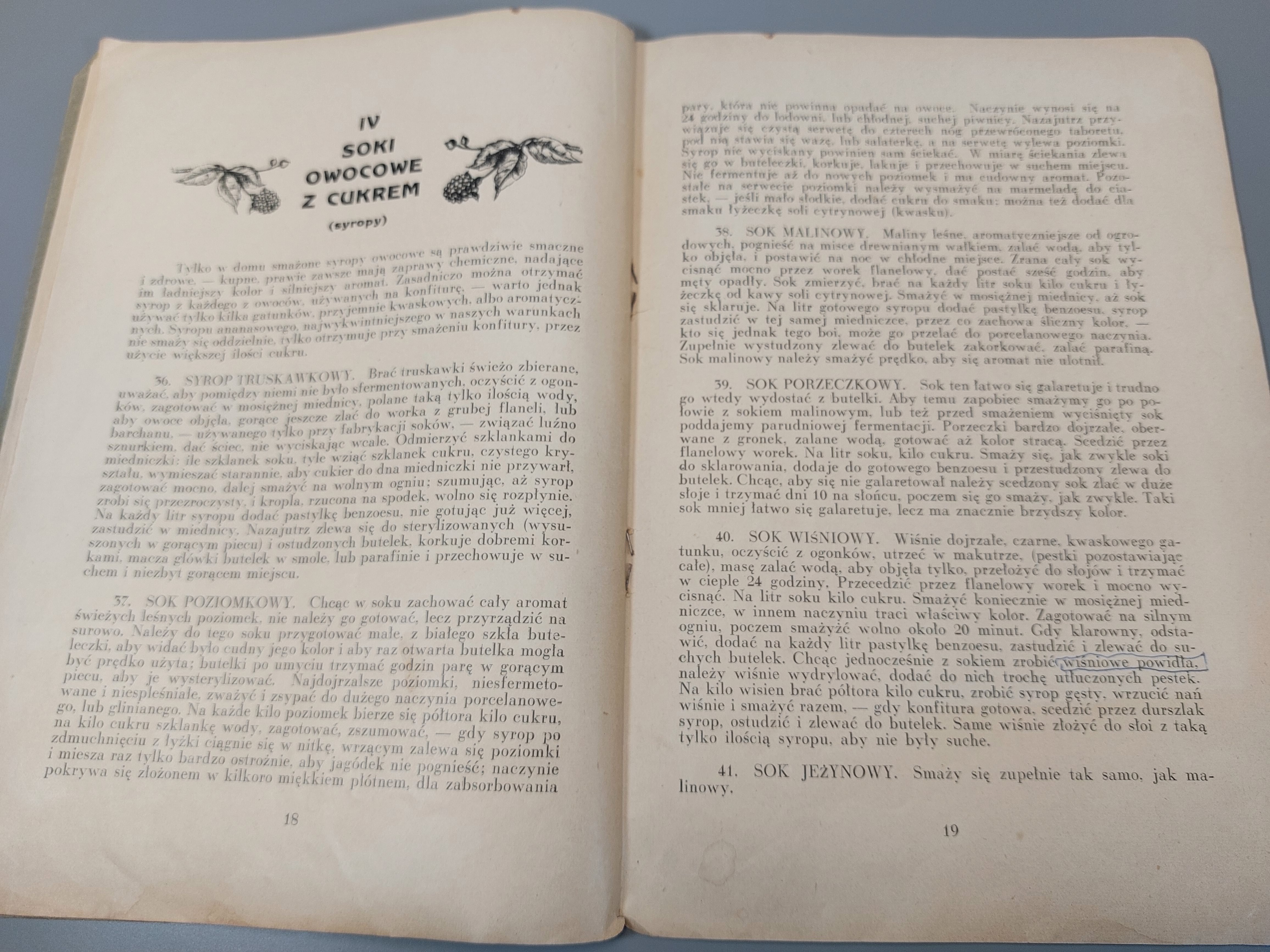 Zawiera przepisy na m.in.: konfitury, galarety, dżemy, soki owocowe z cukrem, kompoty, marynaty octowe, soki i konserwy owocowe bez cukru, owoce moczone, marmolady, sery owocowe, powidła. "Życie Praktyczne" - Wydawnictwo poświęcone sprawom prowadzenia domu i gospodarstwa kobiecego.