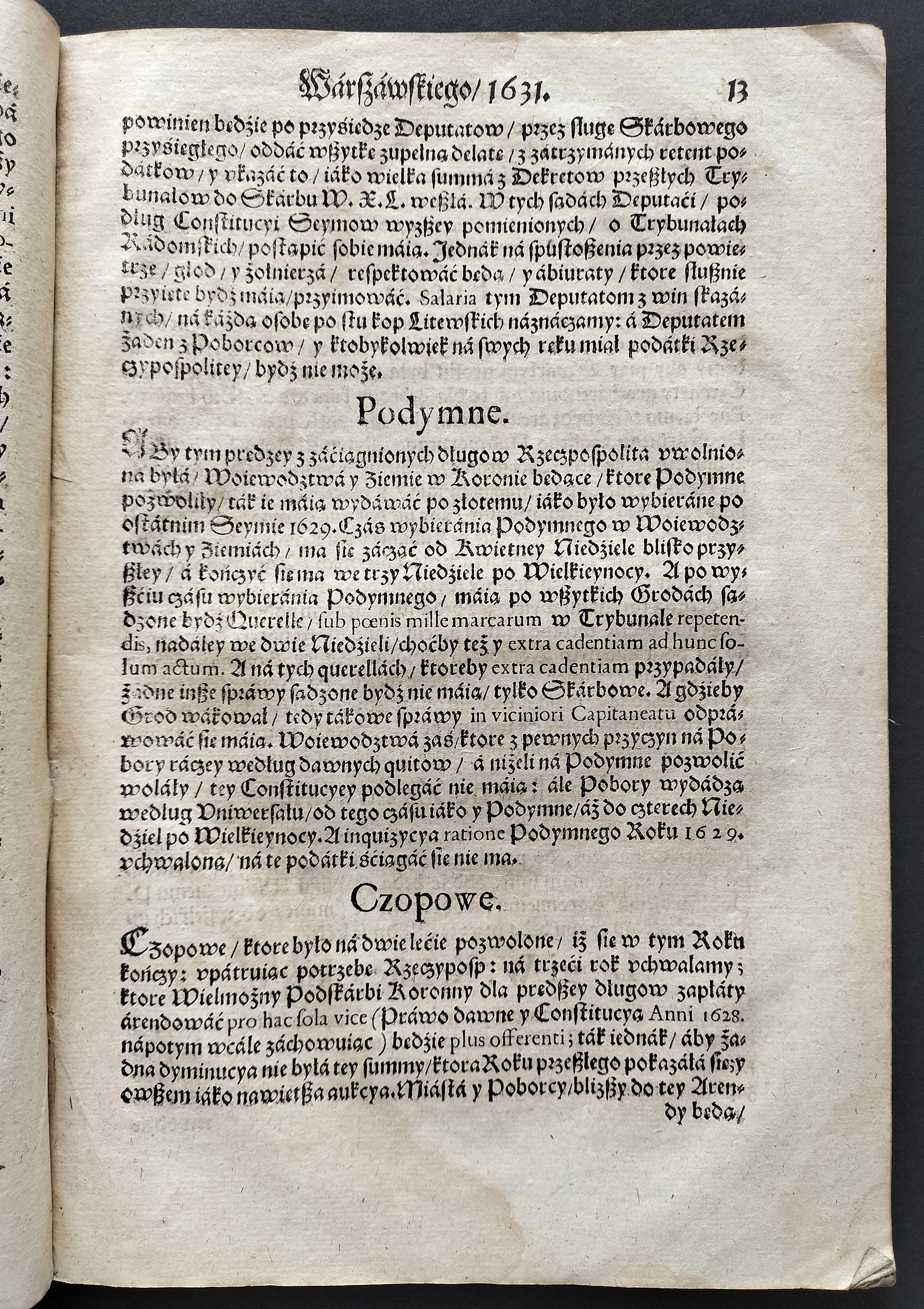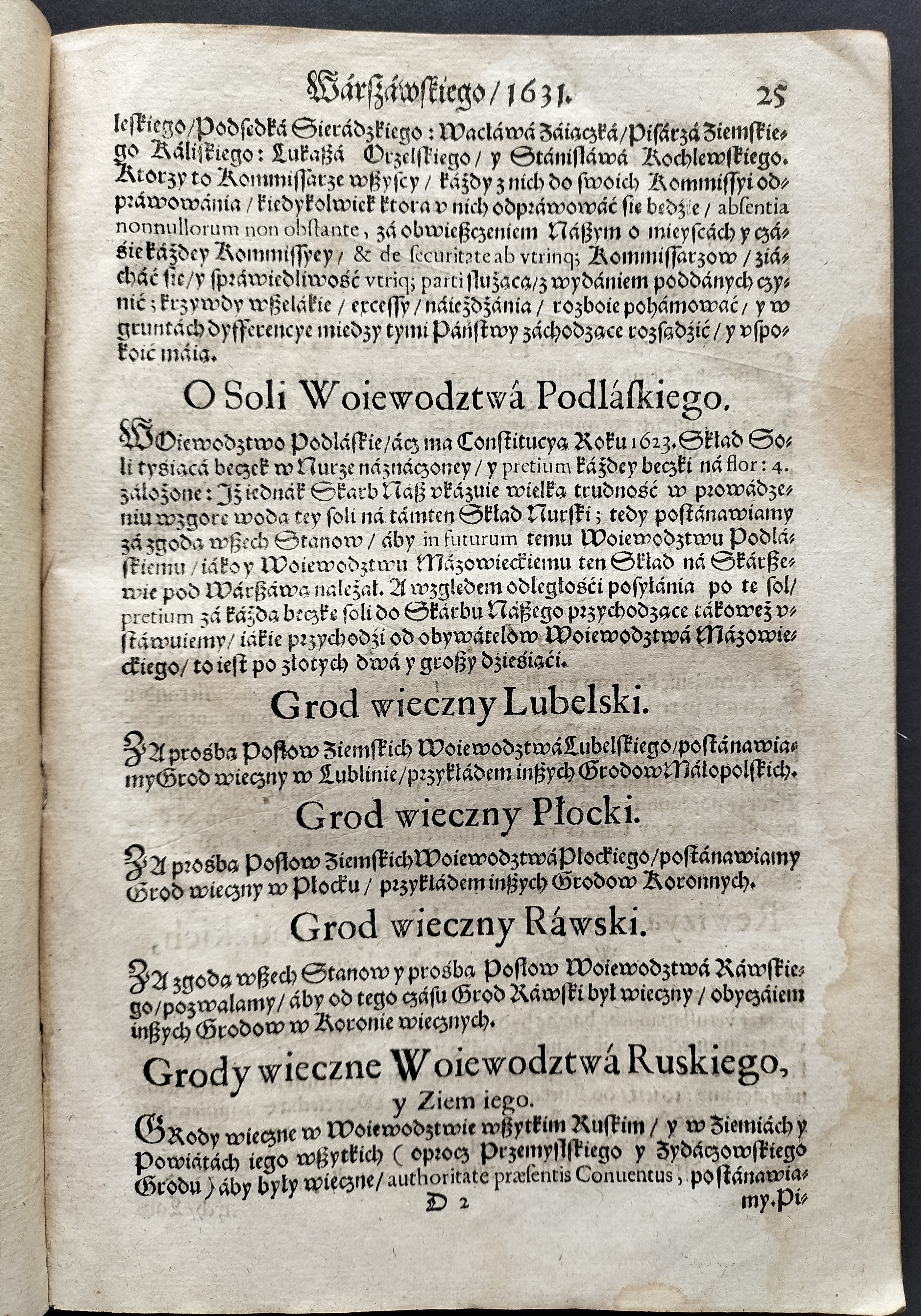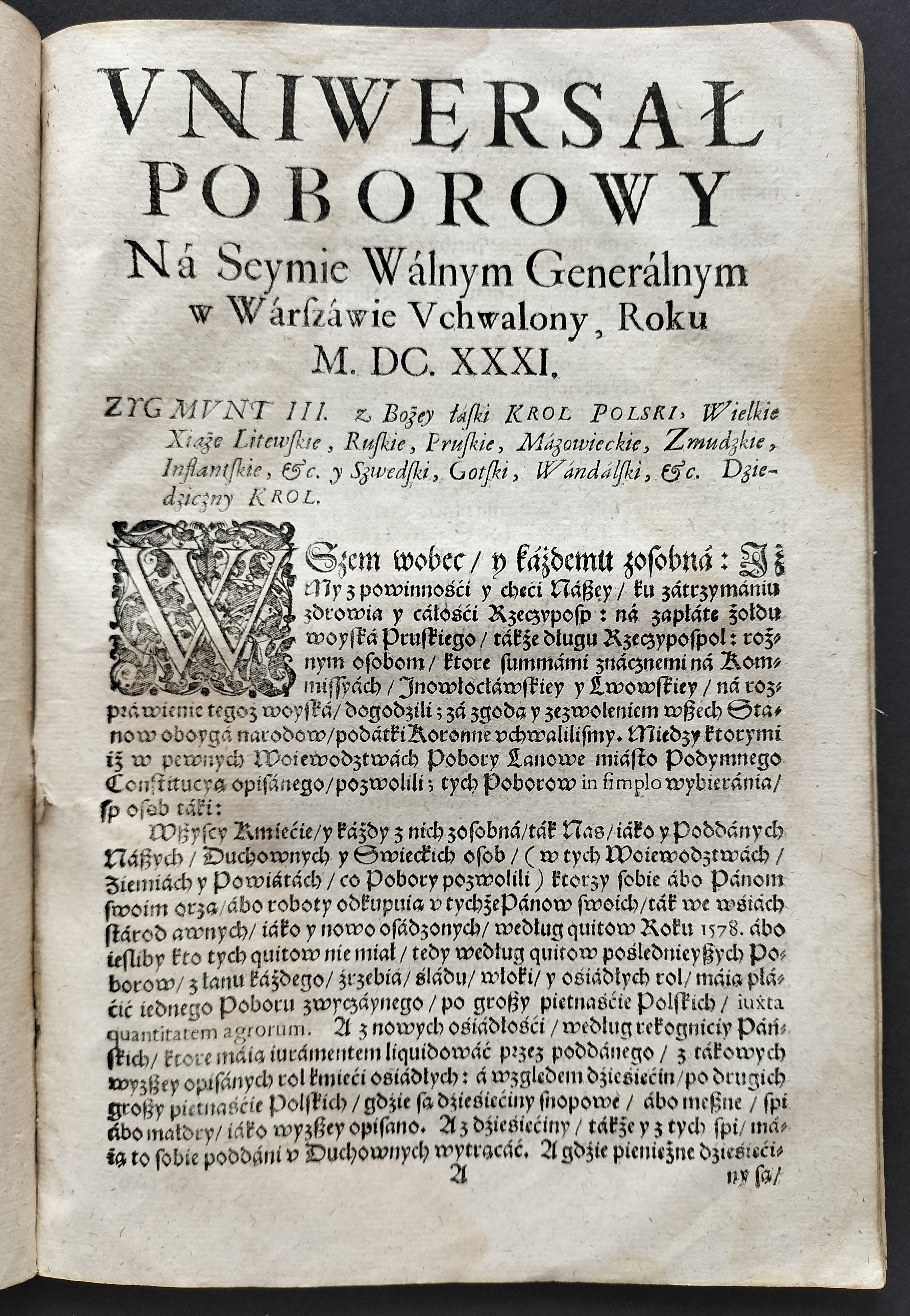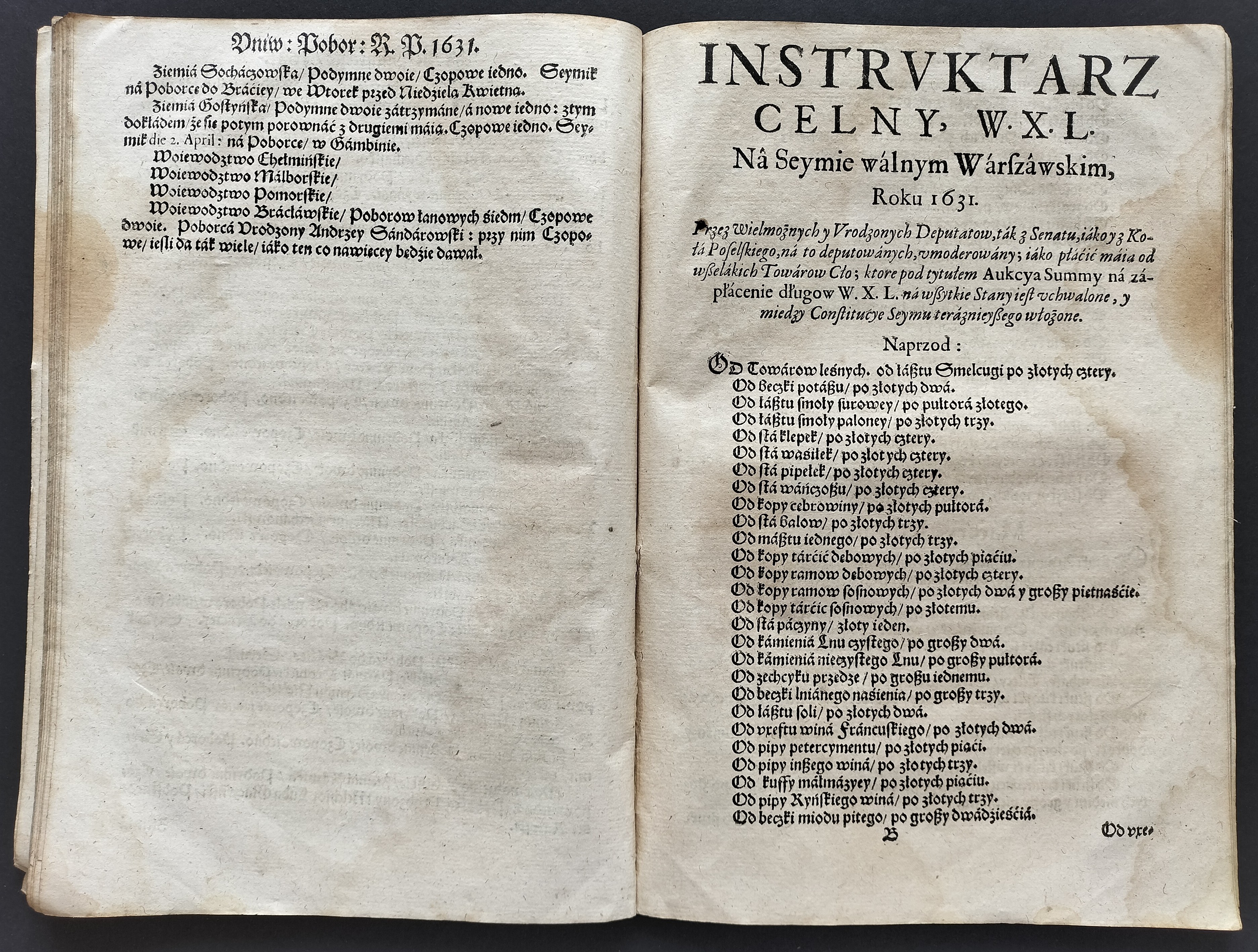 Format:20x30cm. Zawiera: Konstytucje Sejmu 1631. Dnia 12 marca [stron:45] nieliczbowane strony: Uniwersału Poborowego[8], Instruktarza Celnego[9], Konstytucje Sejmu 1632. Dnia 1 kwietnia [7], O podatkach Rzeczpospolitej [7]. Przybrudzona strona tytułowa, zaplamienia, znaki wodne.