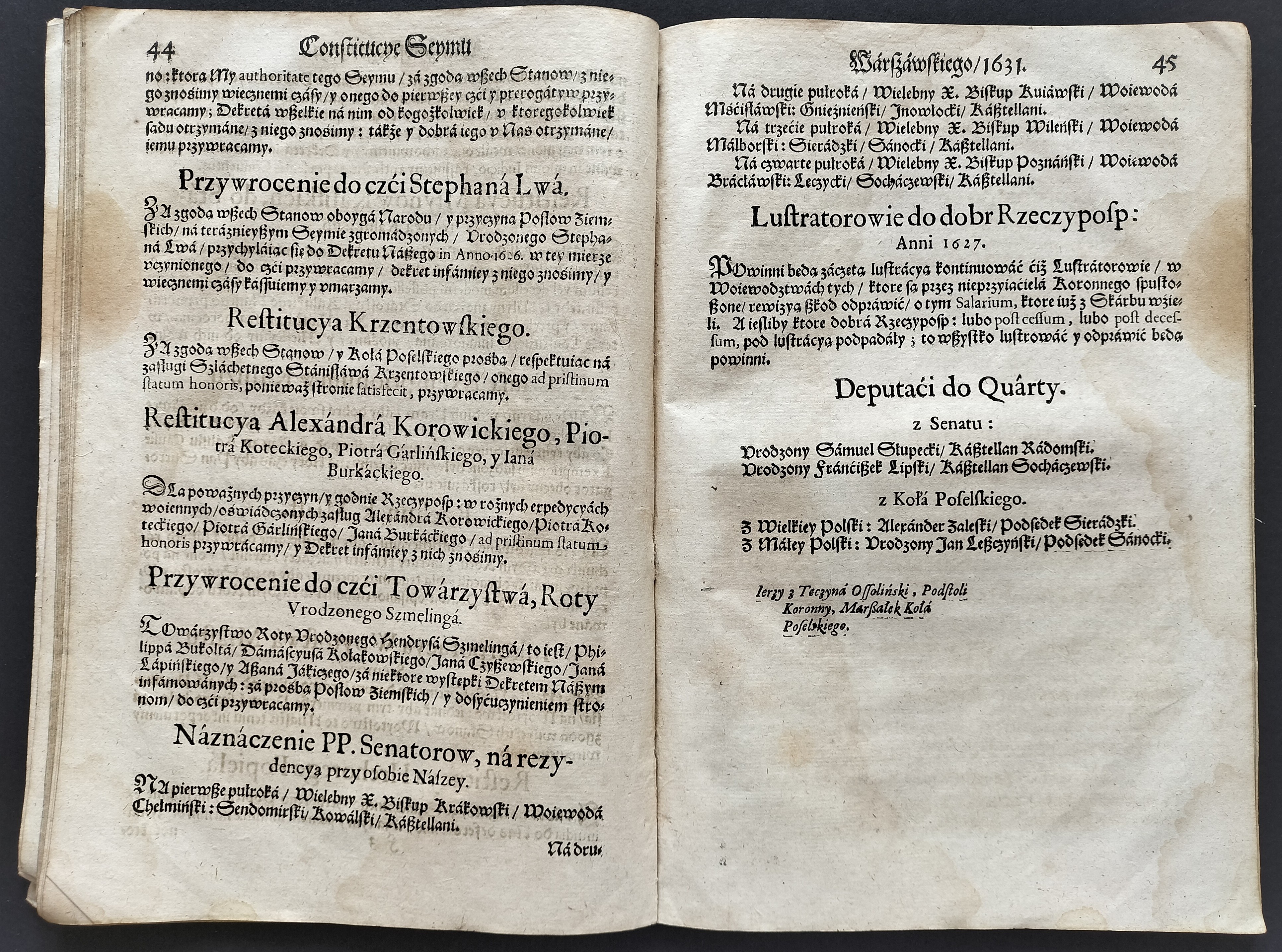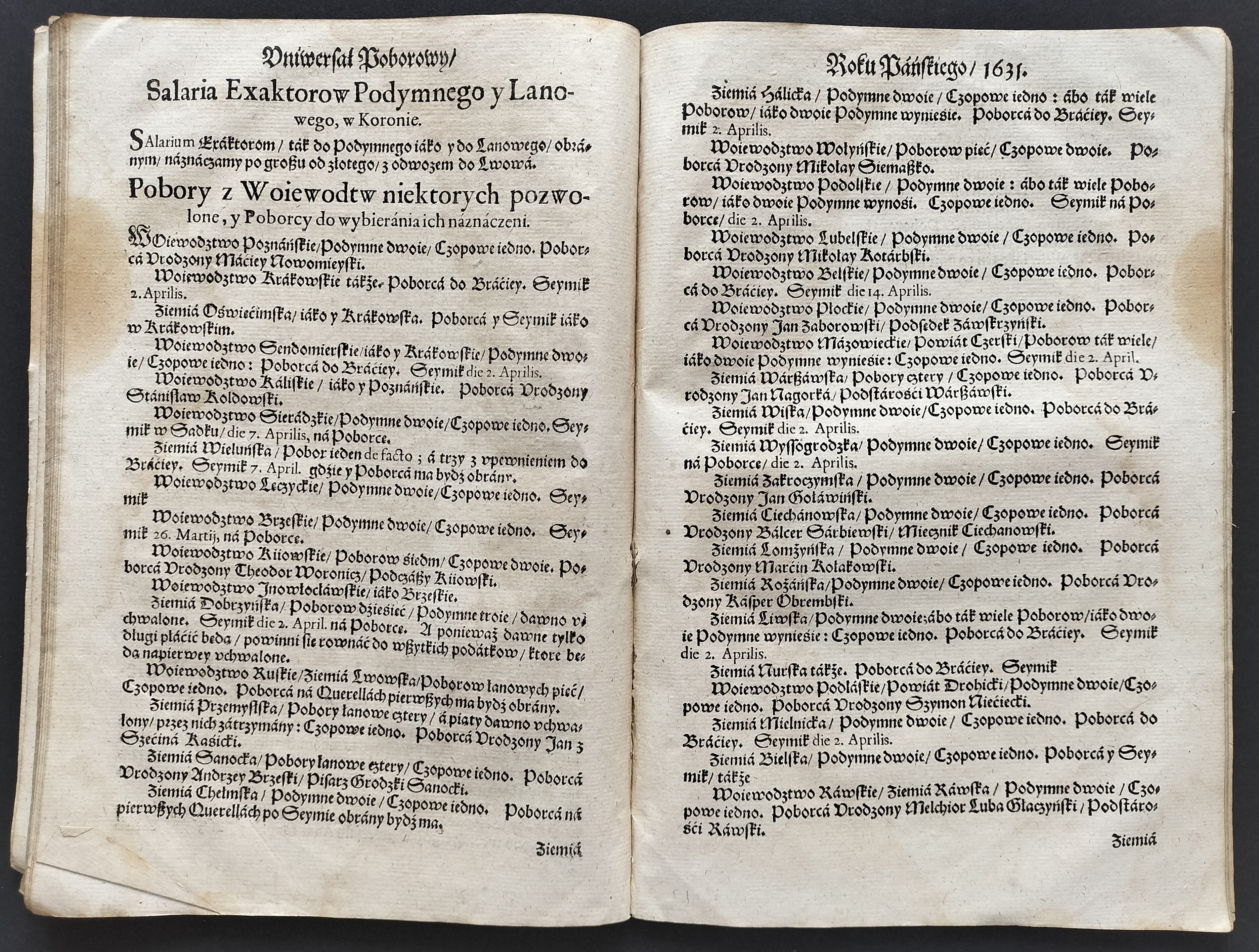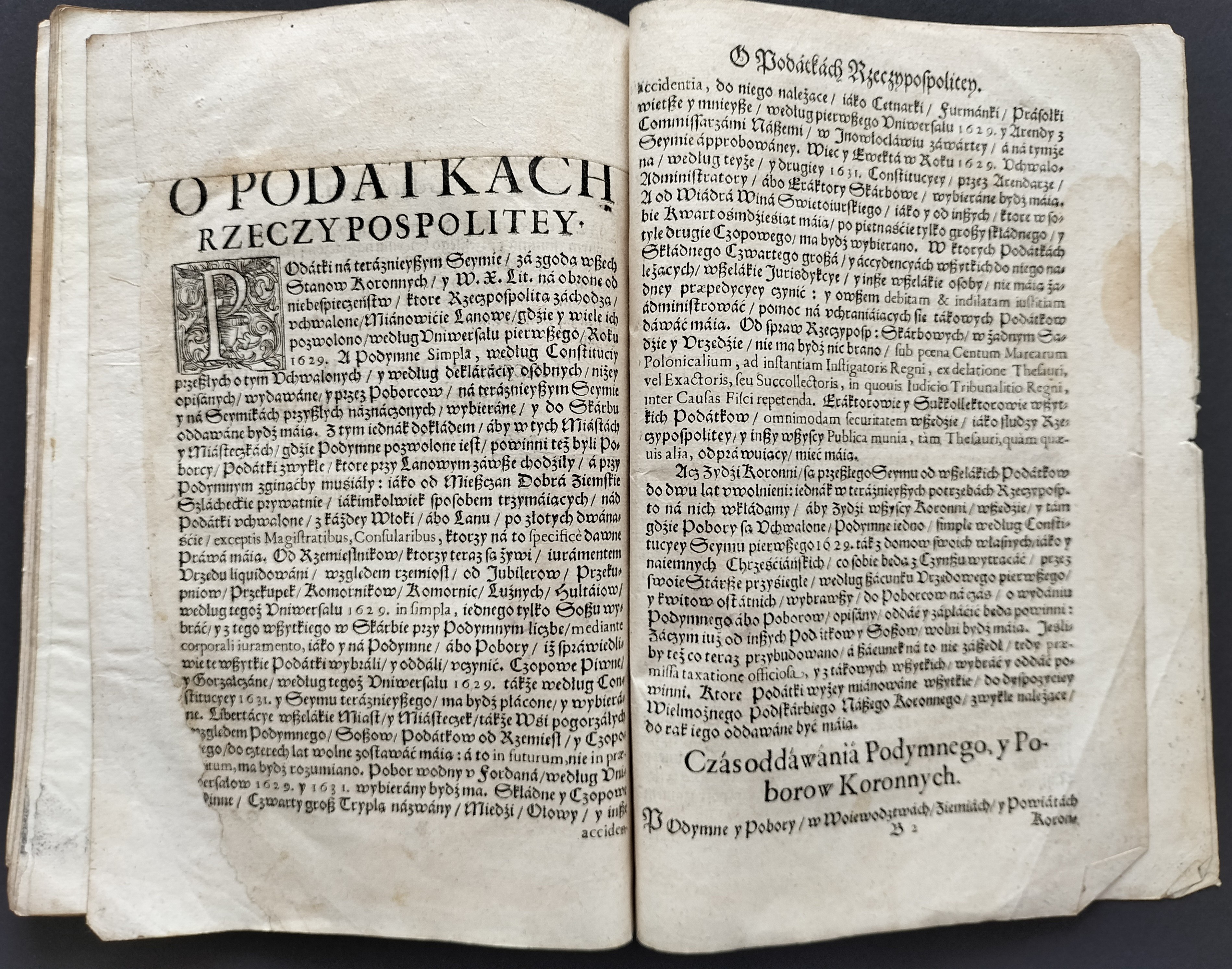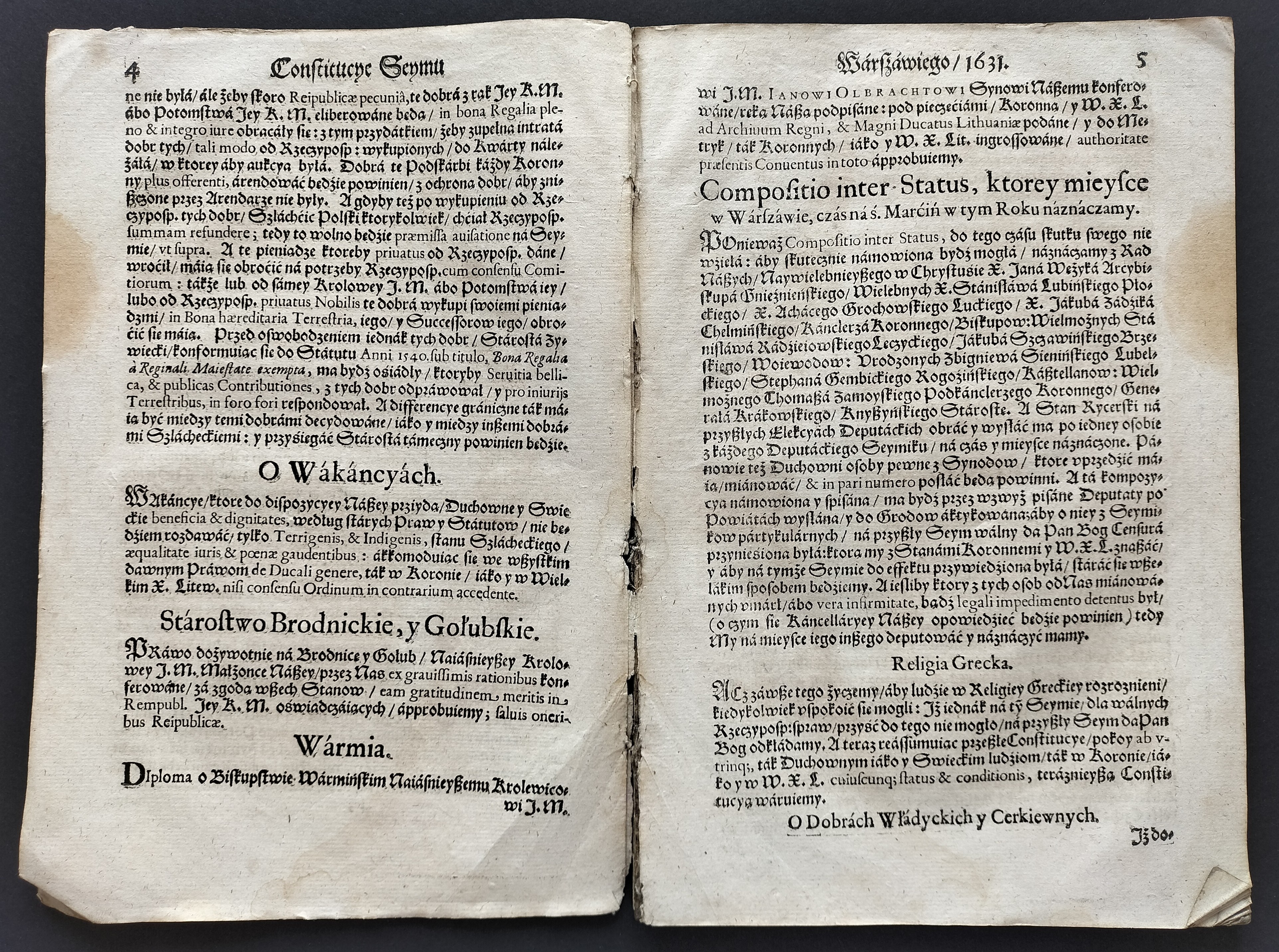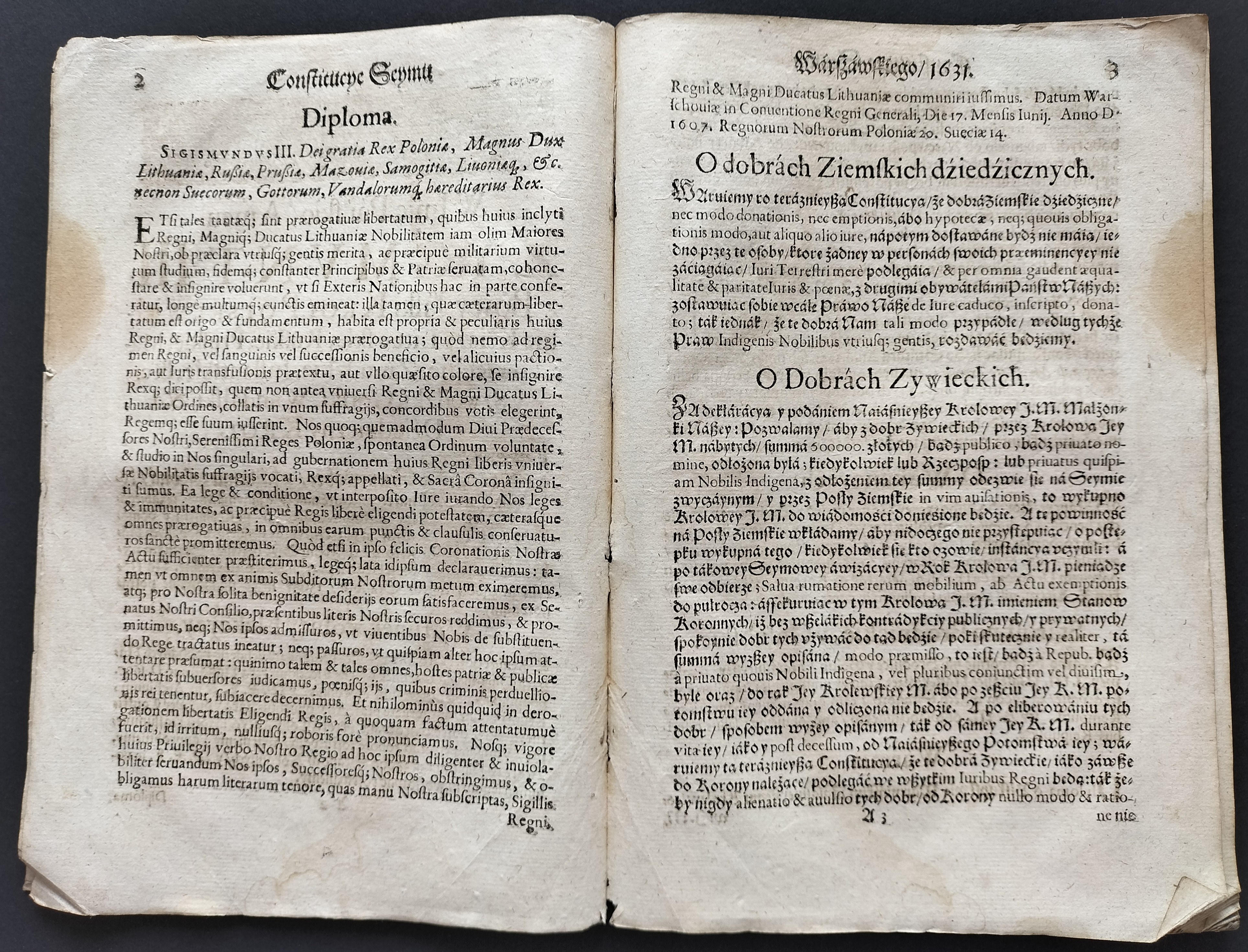 Format:20x30cm. Zawiera: Konstytucje Sejmu 1631. Dnia 12 marca [stron:45] nieliczbowane strony: Uniwersału Poborowego[8], Instruktarza Celnego[9], Konstytucje Sejmu 1632. Dnia 1 kwietnia [7], O podatkach Rzeczpospolitej [7]. Przybrudzona strona tytułowa, zaplamienia, znaki wodne.