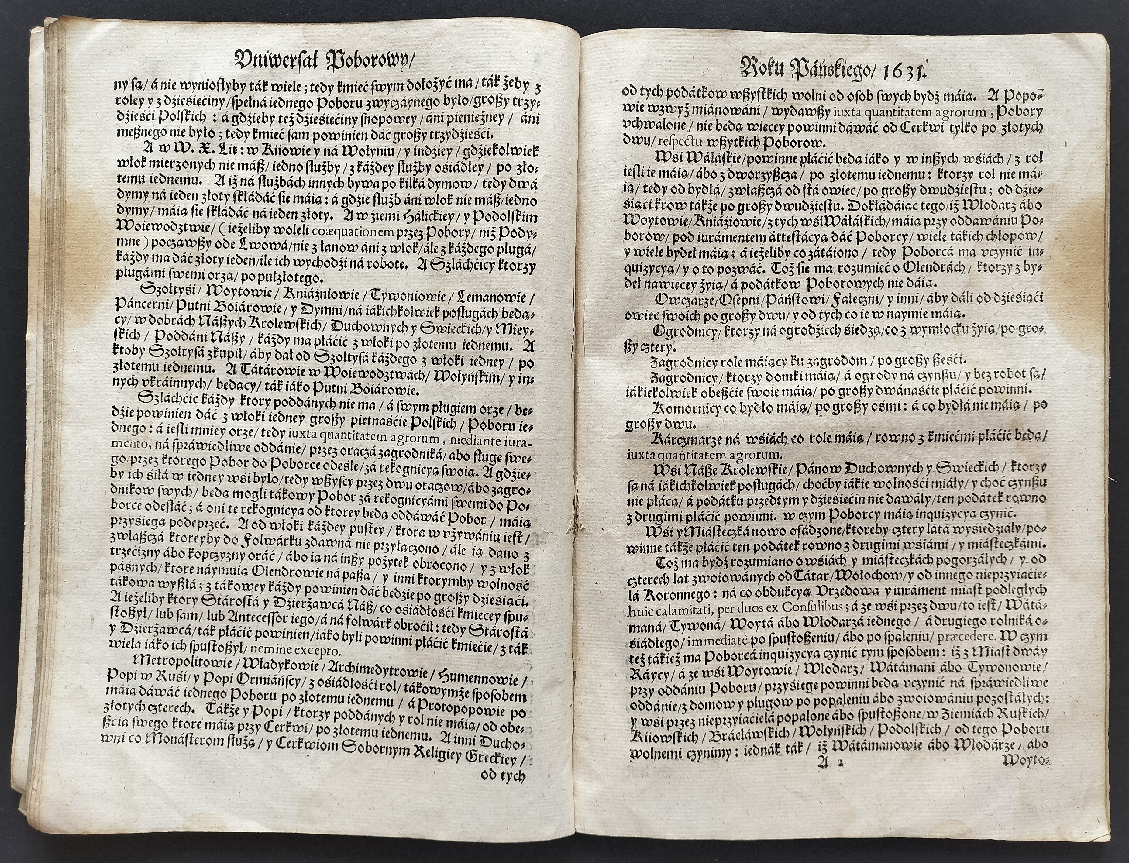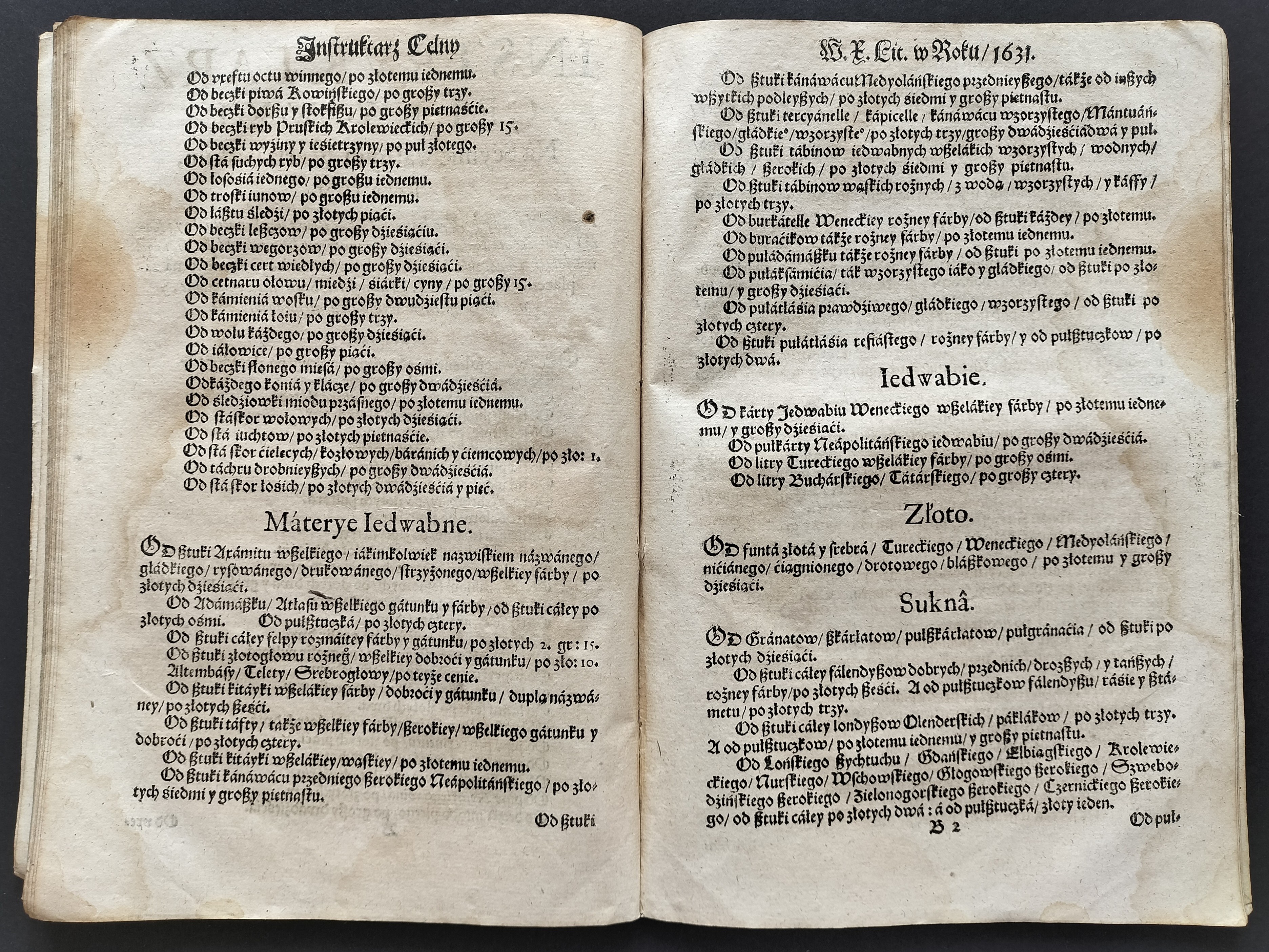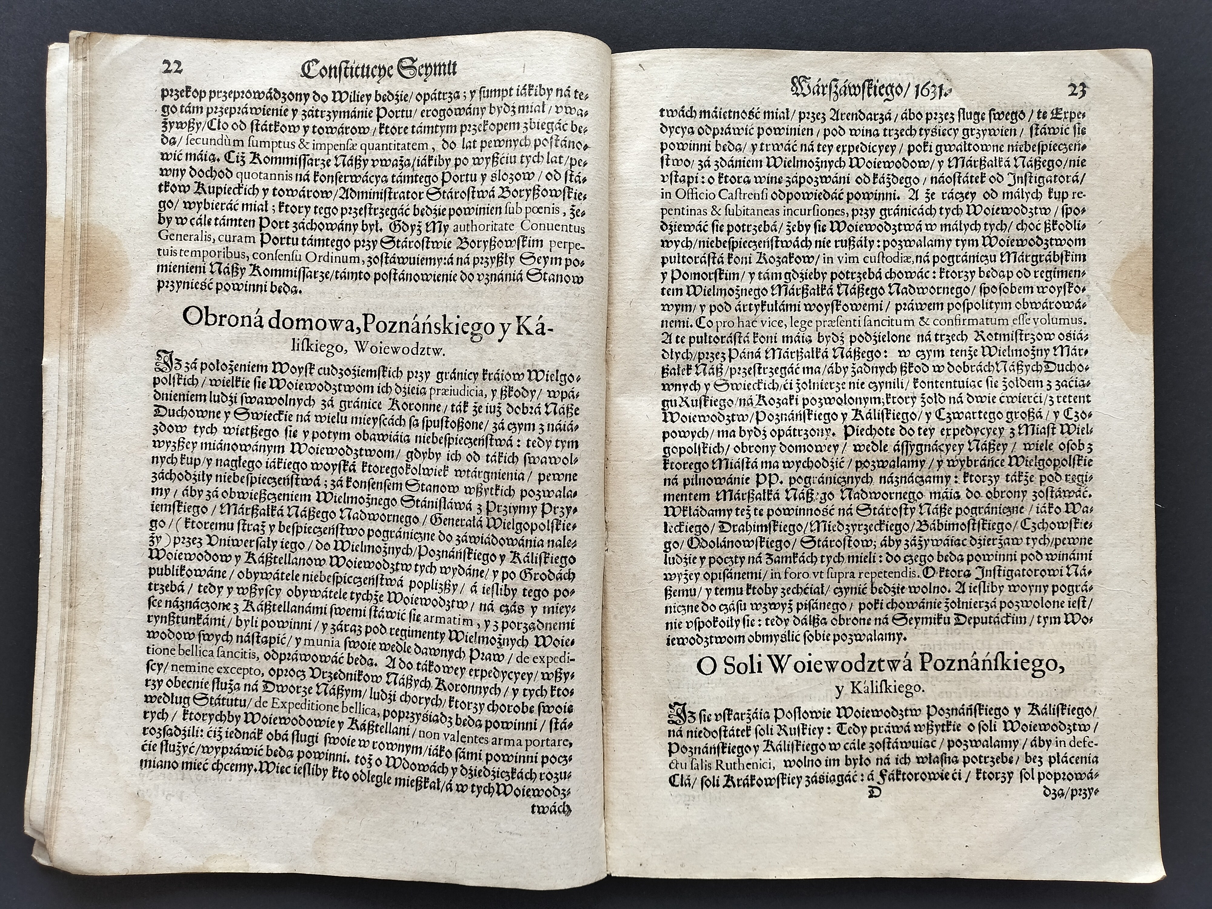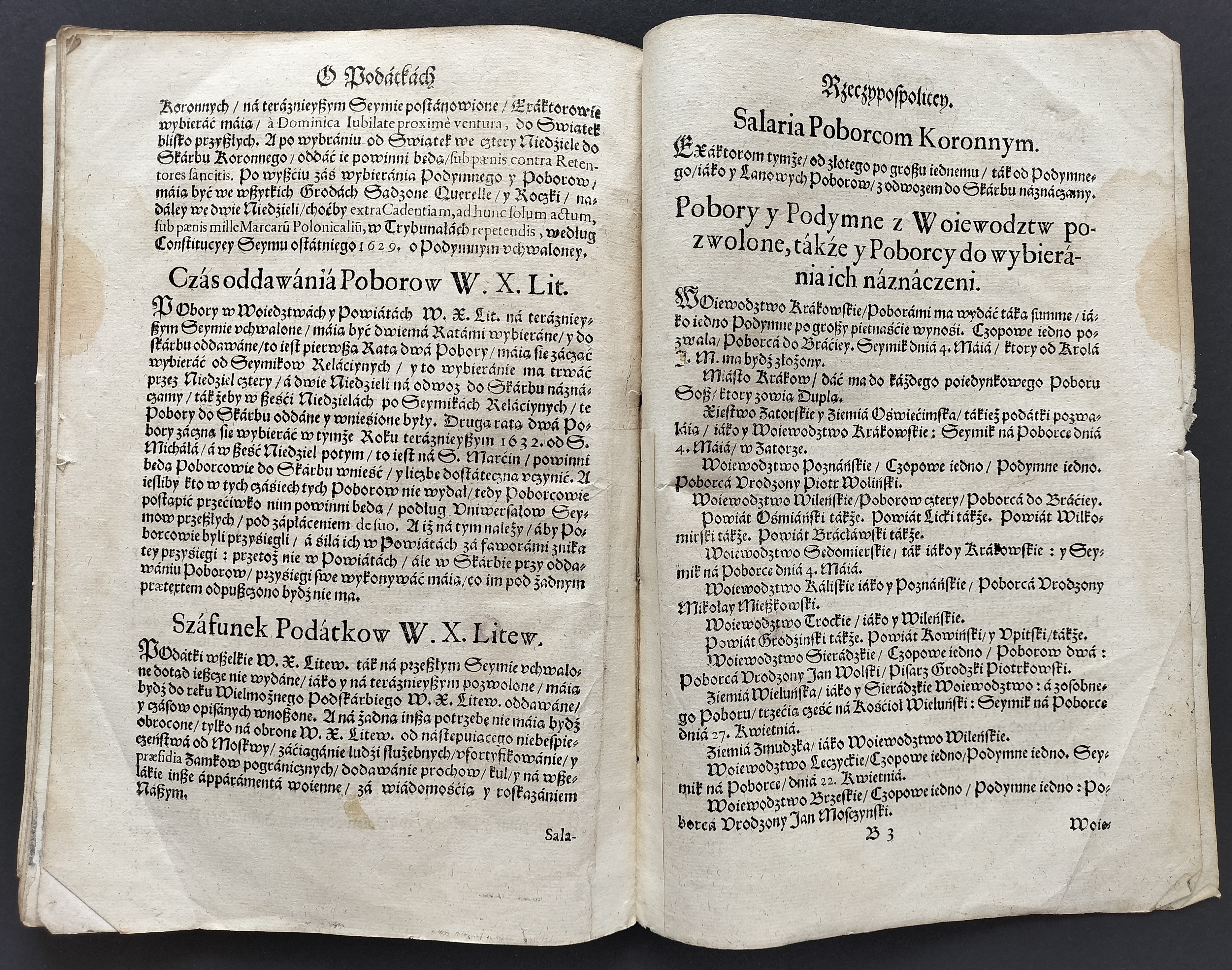 Format:20x30cm. Zawiera: Konstytucje Sejmu 1631. Dnia 12 marca [stron:45] nieliczbowane strony: Uniwersału Poborowego[8], Instruktarza Celnego[9], Konstytucje Sejmu 1632. Dnia 1 kwietnia [7], O podatkach Rzeczpospolitej [7]. Przybrudzona strona tytułowa, zaplamienia, znaki wodne.