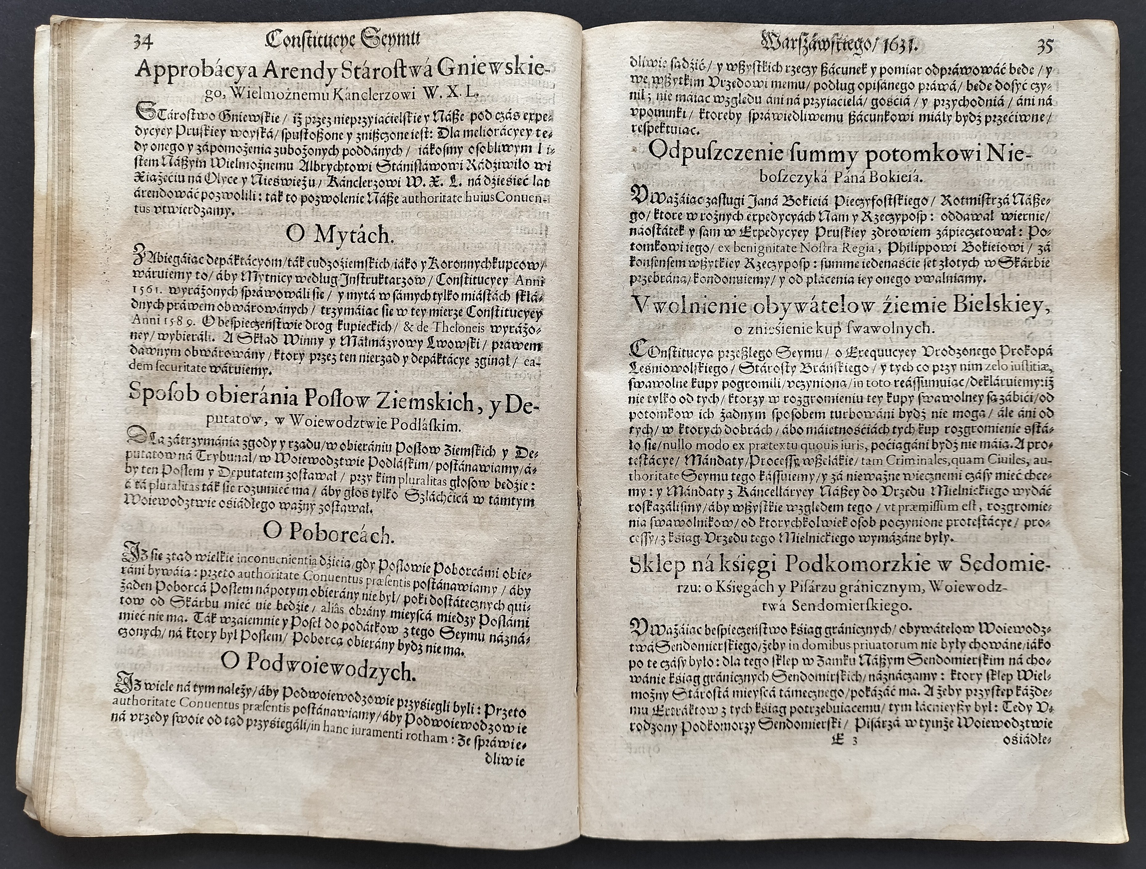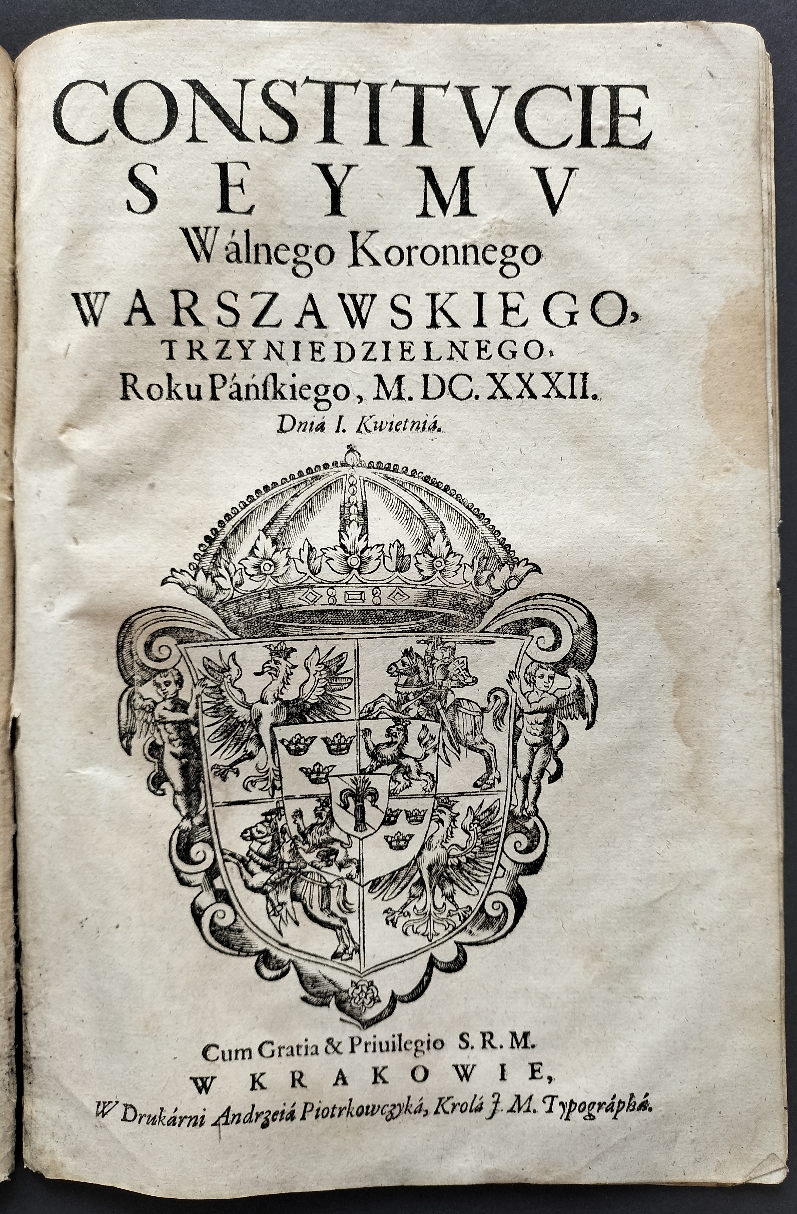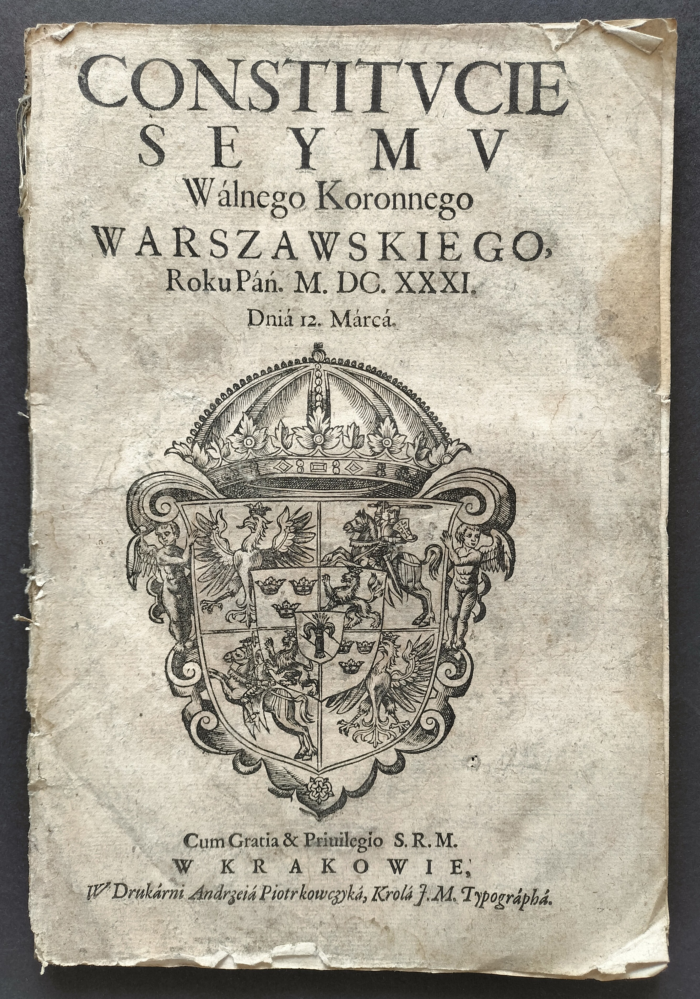 [Klocek] Konstytucje Sejmu & Instruktarz Celny & O Podatkach Rzeczpospolitej [CONSTITVCIE SEYMV Wálnego Koronnego WARSZAWSKIEGO, Roku Páń. M. DC. XXXI. Dniá 12. Márcá. Cum Gratia & Priuilegio S. R. M. W KRAKOWΙΕ, W Drukarni Andrzeiá Piotrkowczyká, Krolá J. M. Typographá] Kraków 1631-1632.