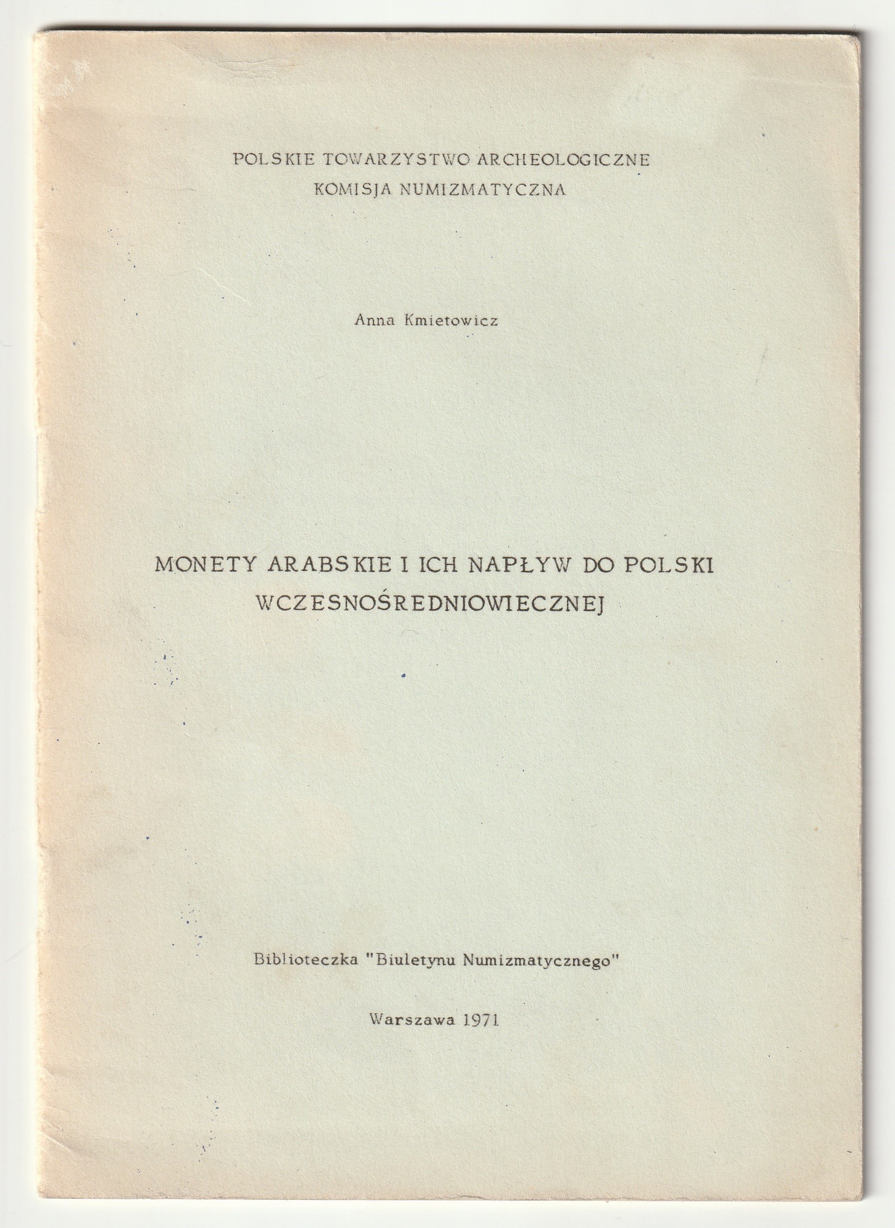 KMIETOWICZ Anna. Monety arabskie i ich napływ do Polski wczesnośredniowiecznej, wyd. PTAiN, Warszawa 1971, str. 20 + 3 nn z rys. i fot. cz.-b.; oprawa miękka, st. bdb.; wym. ok. 143x205 mm.