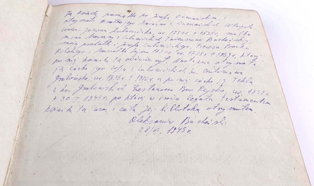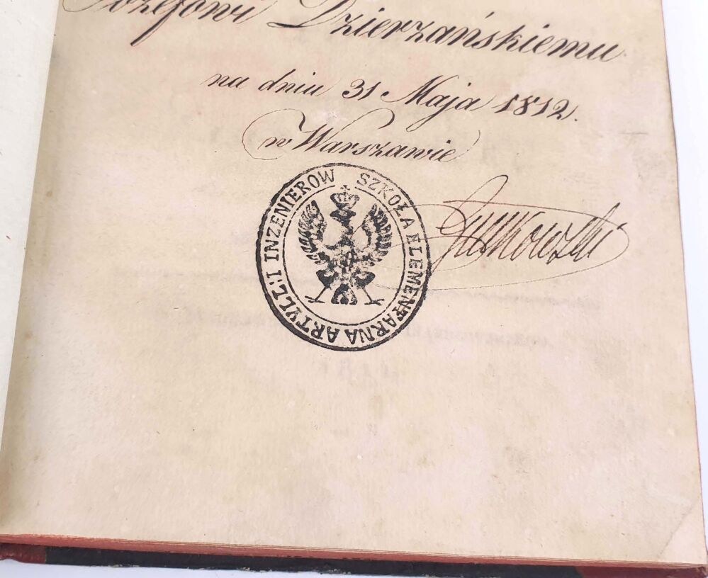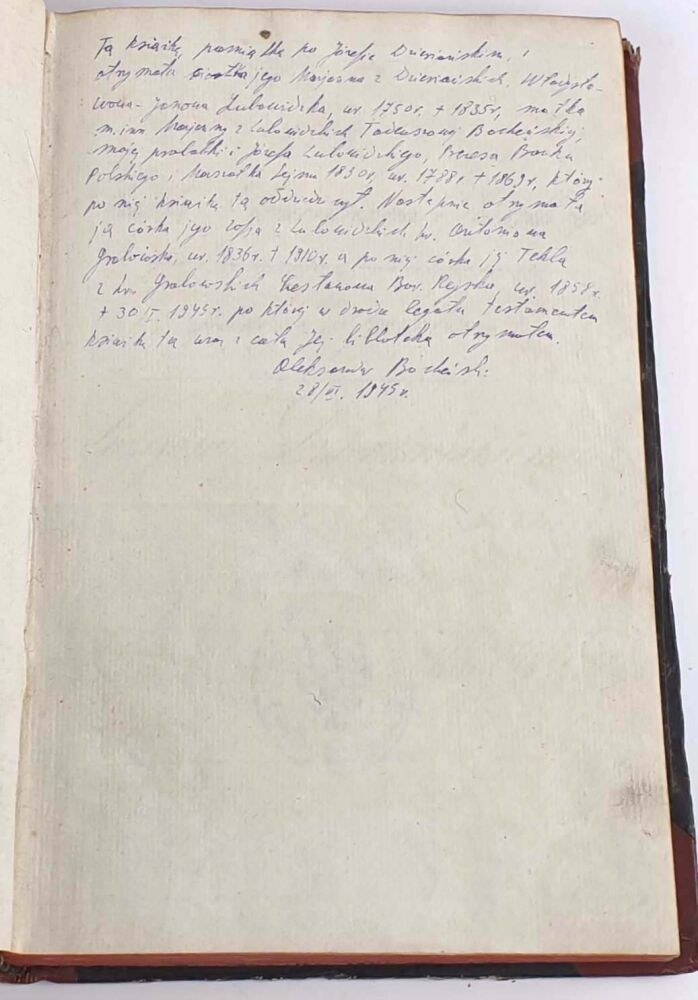 Ofiarowana Józefowi Dzierżańskiemu 1812r., książka z bardzo bogatą historią, o czym na odrębnej karcie wprawionej przed tekstem pisze Józef Bocheński w swojej kwerendzie z 1945r.