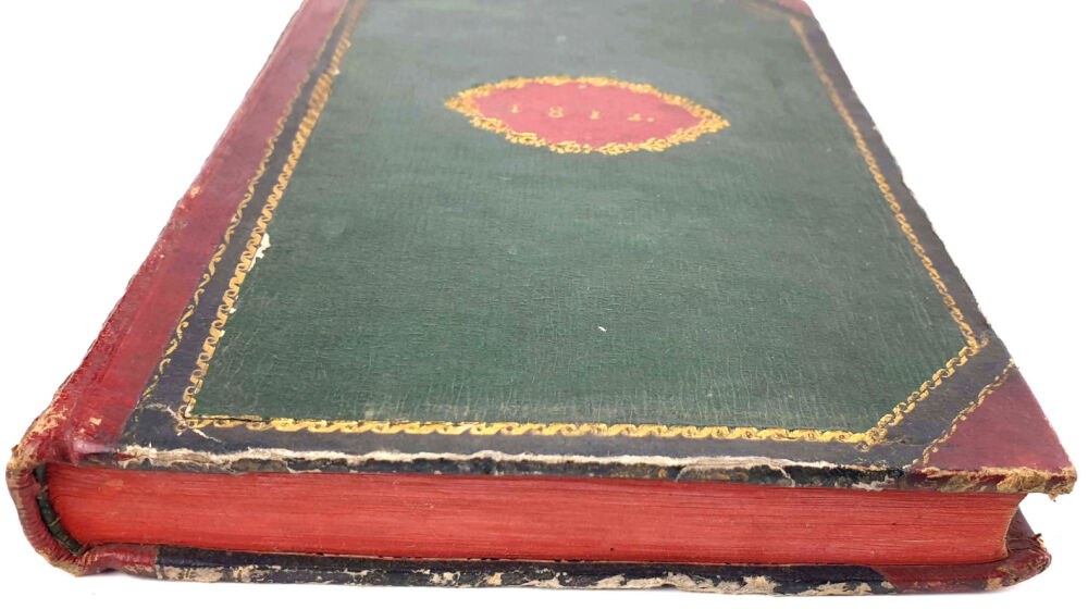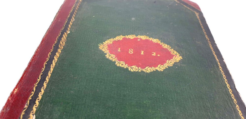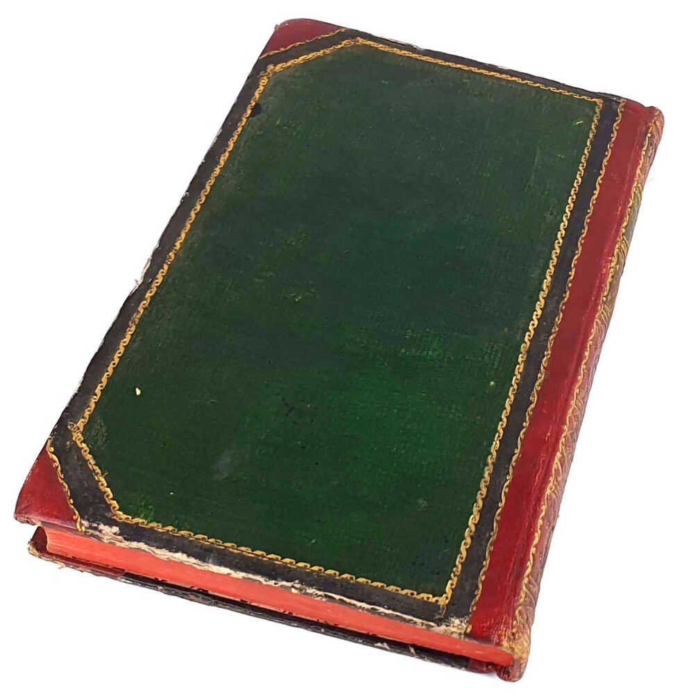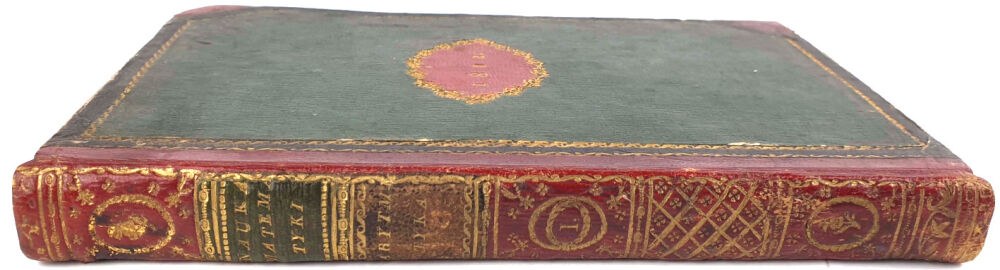 TWARDA OPRAWA PÓŁSKÓREK Z EPOKI. DEKORACYJNY GZRBIET Z SZYLDZIKAMI I ZAGĘSZCZONYMI ZŁOCENIAMI. OBCIĘCIA KART BARWIONE.