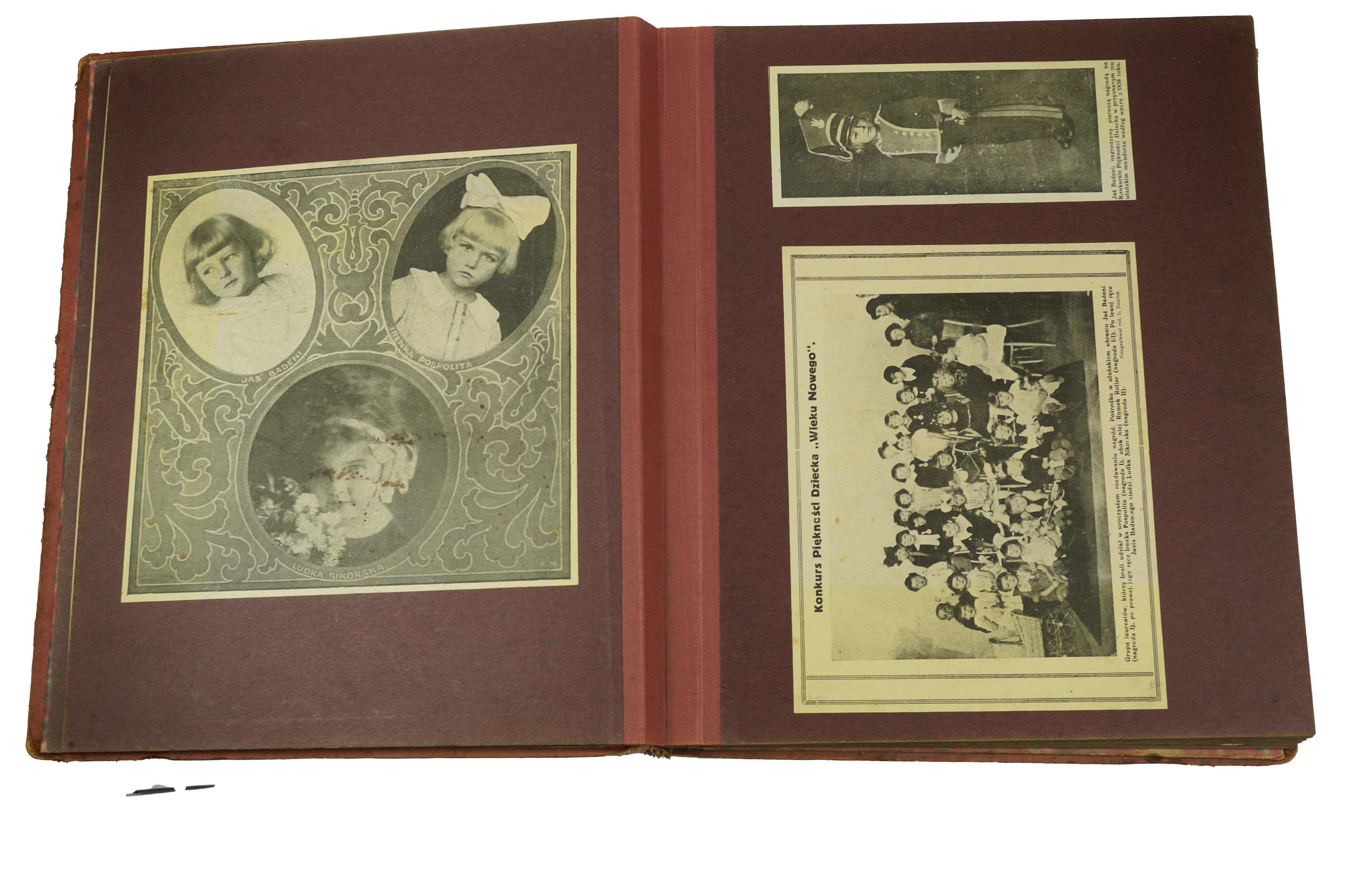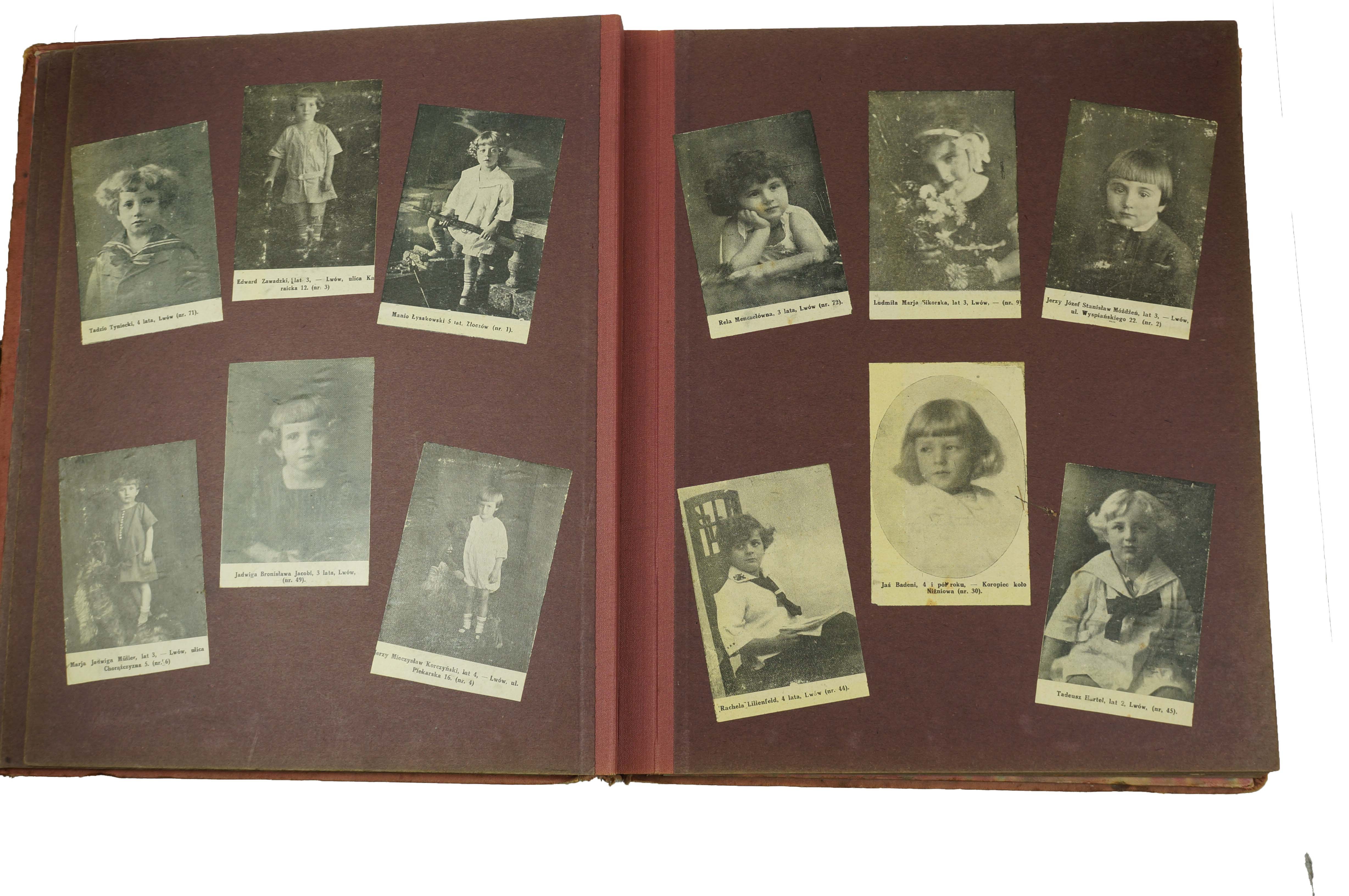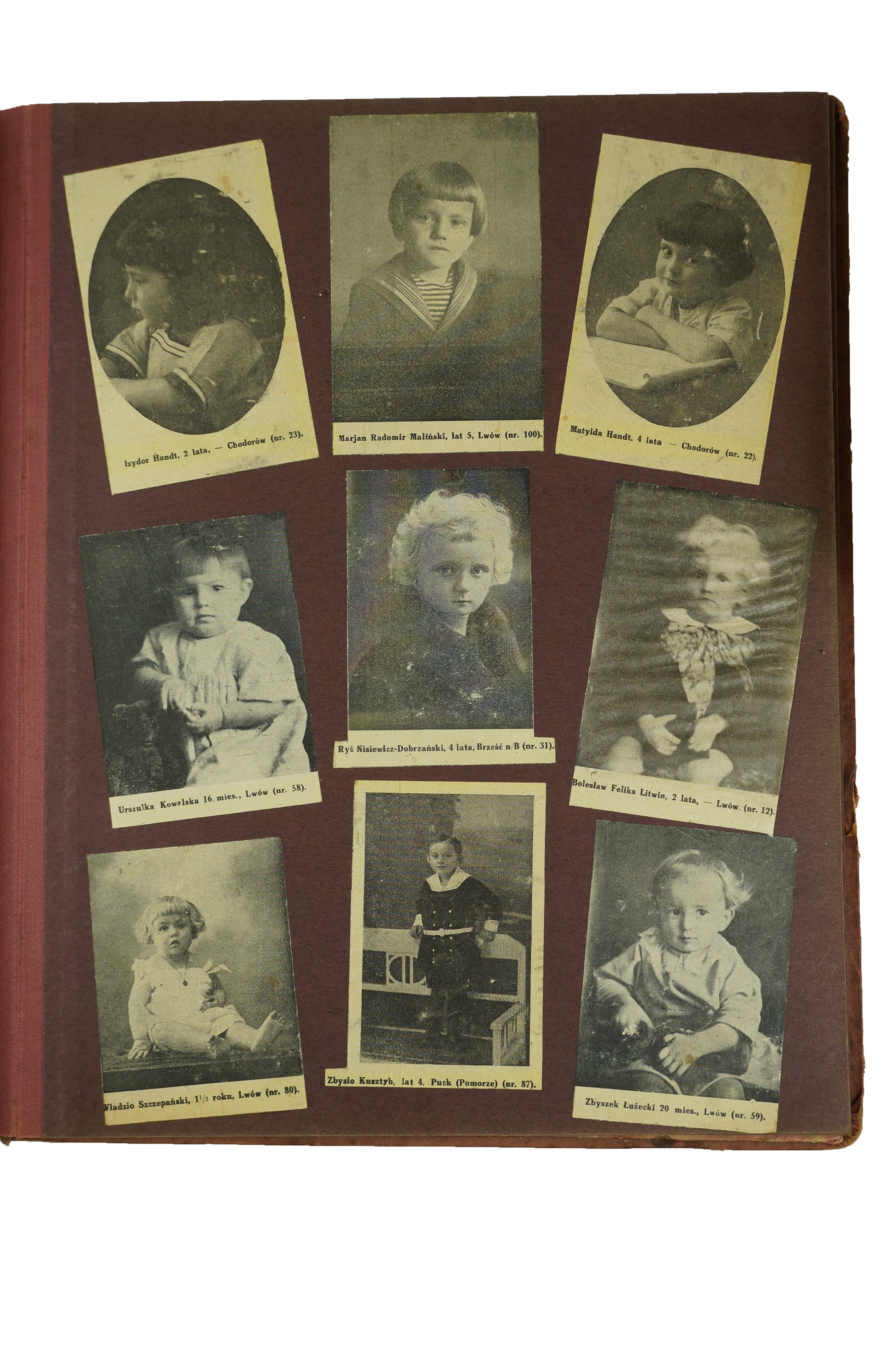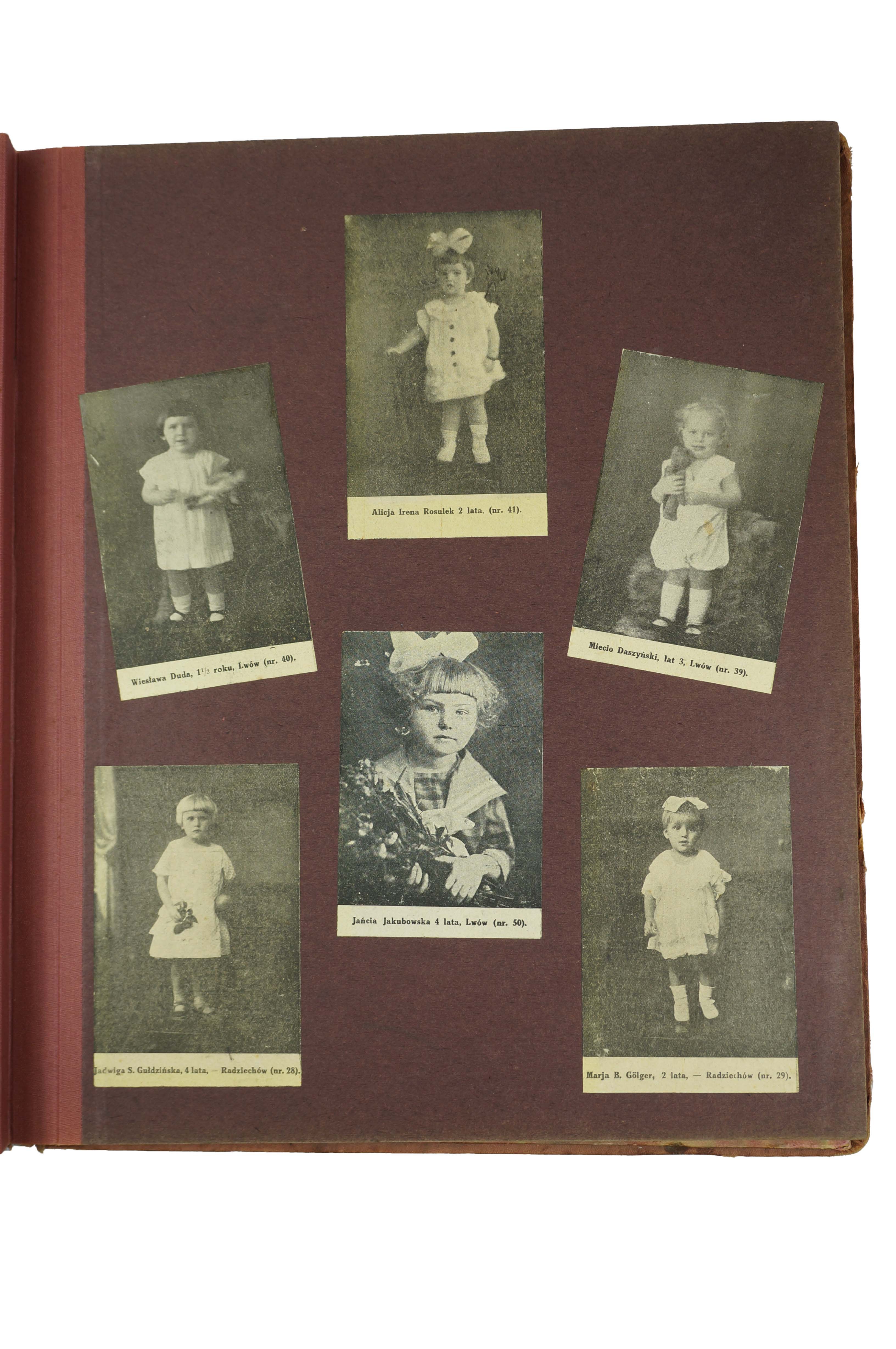 Konkurs Piękności Dziecka "Wieku Nowego" 1925-26, ALBUM z dyplomem i fotografiami dzieci które zostały laureatami konkursu. Album liczy 10 kart / tablic na których naklejone są: dyplom, wizerunki dzieci i wyniki konkursu. Każde dziecko na fotografii opisane [imię, dzieci w różnych strojach i nakryciach głowy, z zabawkami, kwiatami, w mundurkach, nazwisko, wiek, miejsce zamieszkania], f. 30,5x36,5cm, k. tablic 10, RZADKIE