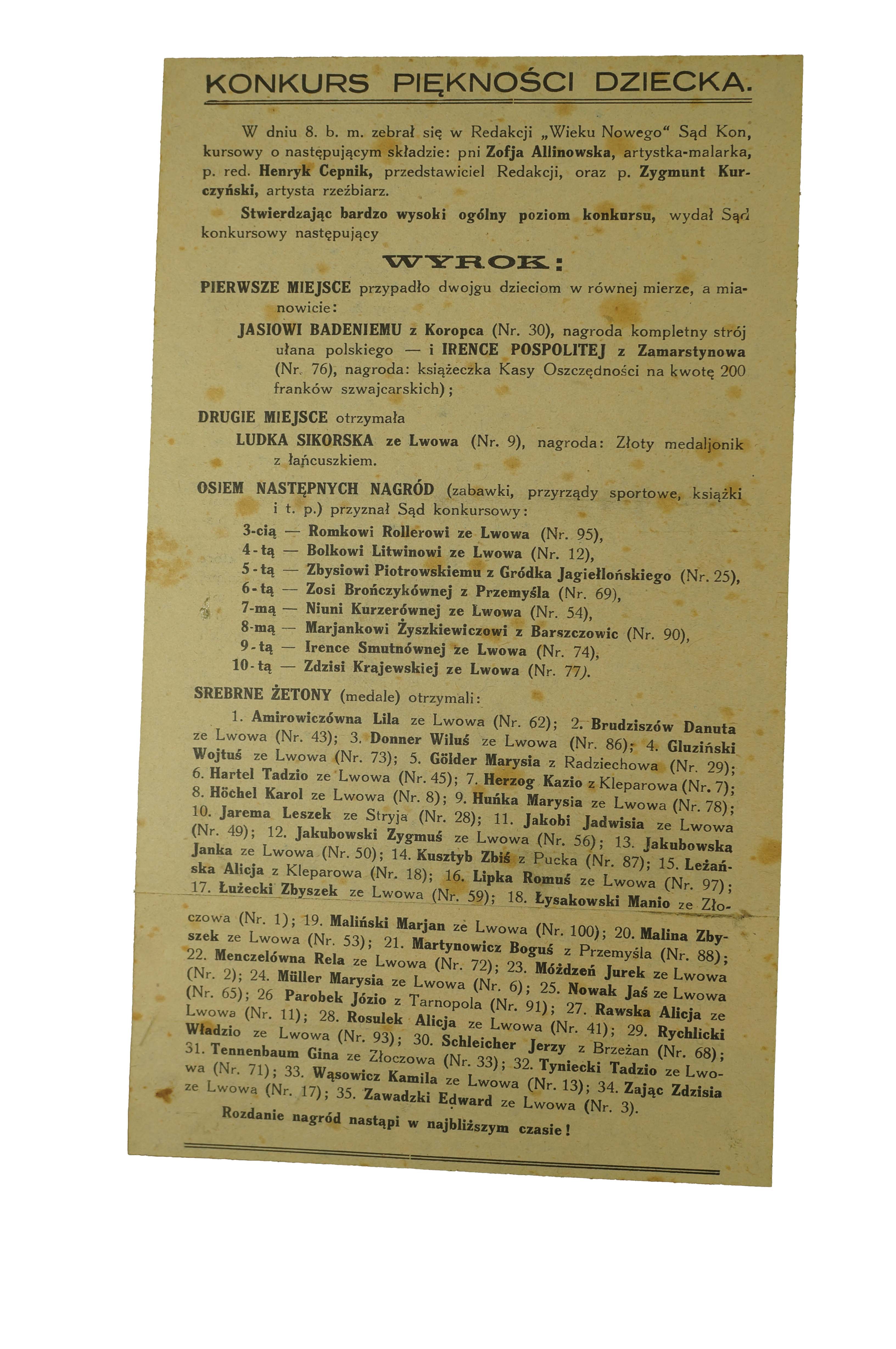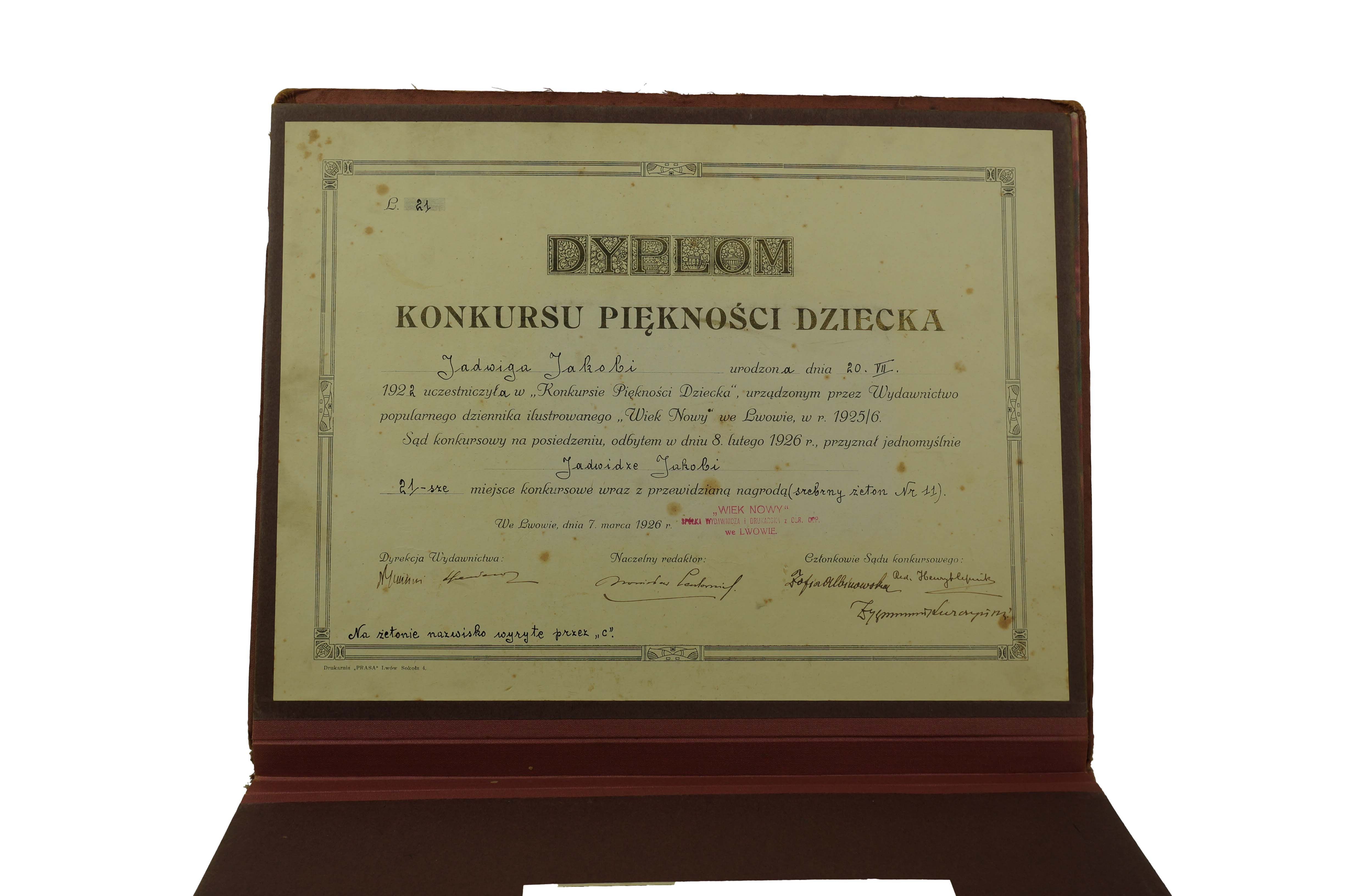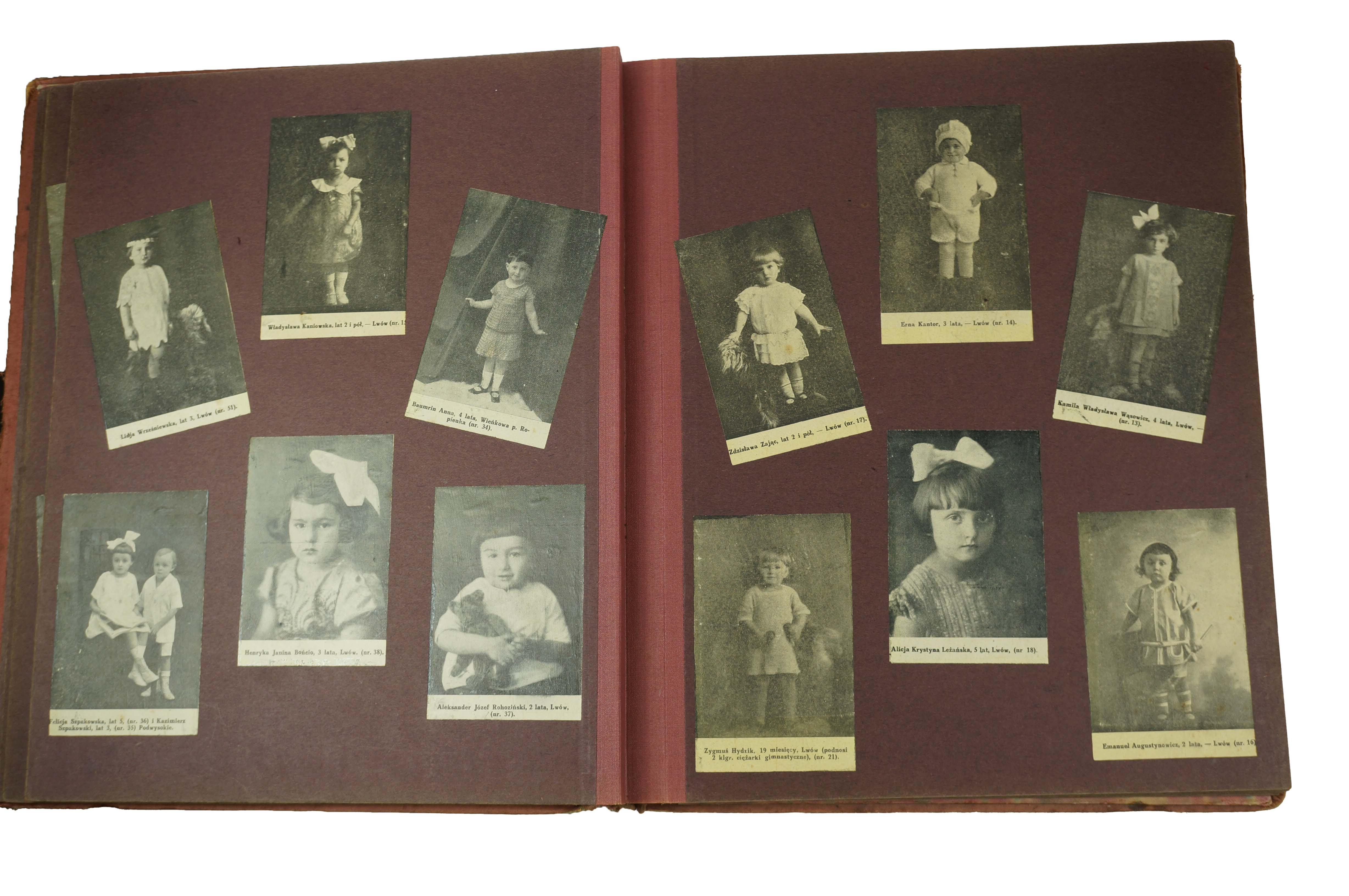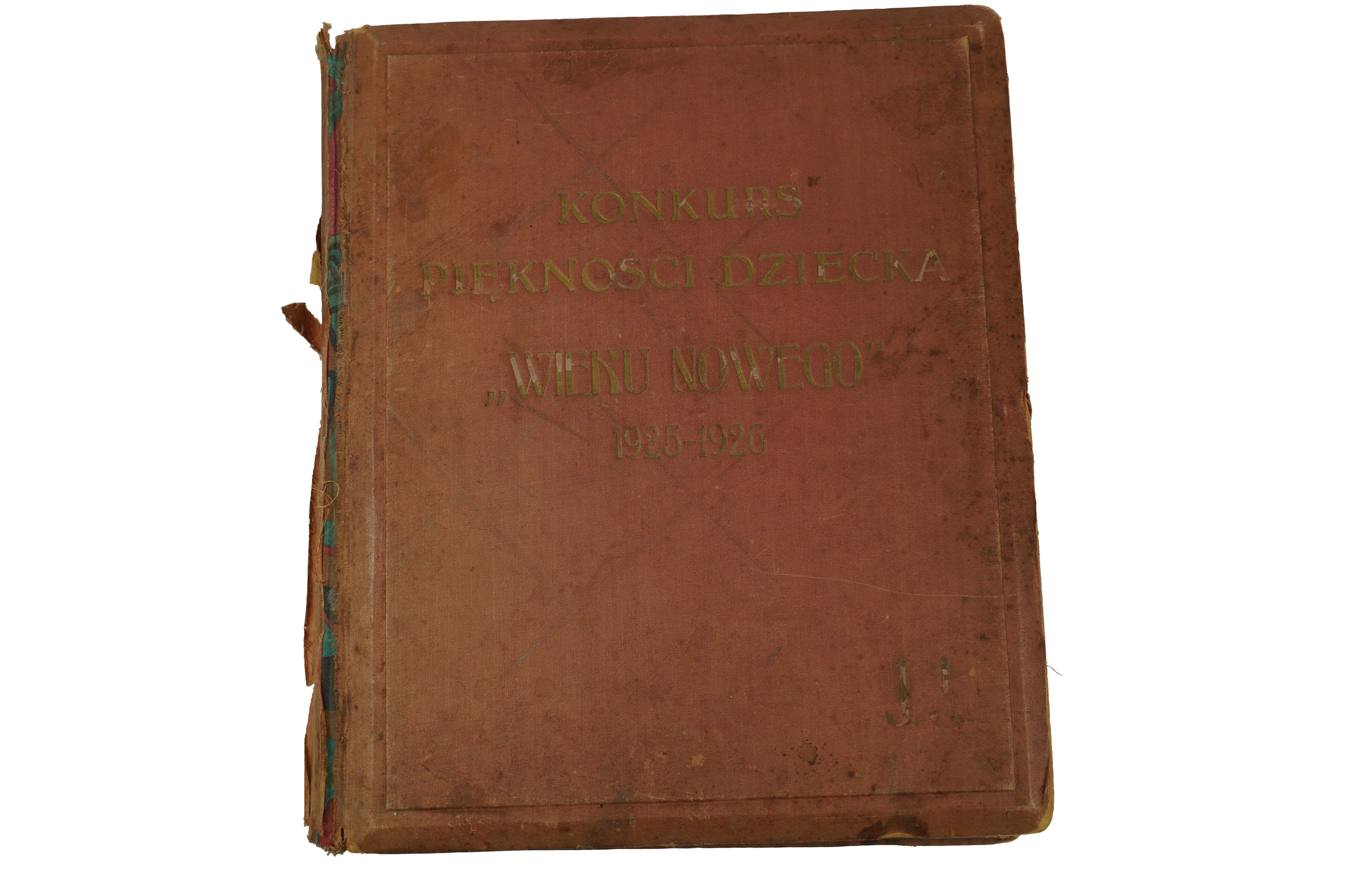 Konkurs Piękności Dziecka "Wieku Nowego" 1925-26, ALBUM z dyplomem i fotografiami dzieci które zostały laureatami konkursu. Album liczy 10 kart / tablic na których naklejone są: dyplom, wizerunki dzieci i wyniki konkursu. Każde dziecko na fotografii opisane [imię, dzieci w różnych strojach i nakryciach głowy, z zabawkami, kwiatami, w mundurkach, nazwisko, wiek, miejsce zamieszkania], f. 30,5x36,5cm, k. tablic 10, RZADKIE
