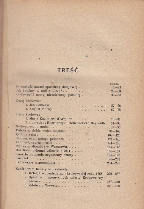 Zawiera m.in.: Jak żyliśmy w unji z Litwą?; O dawnej i nowej nietolerancji polskiej; Polska w dobie wojen śląskich; Lambert, szpieg pruski; Konsztu kochanja argumenty cztery; Konfederaci barscy w Krakowie.