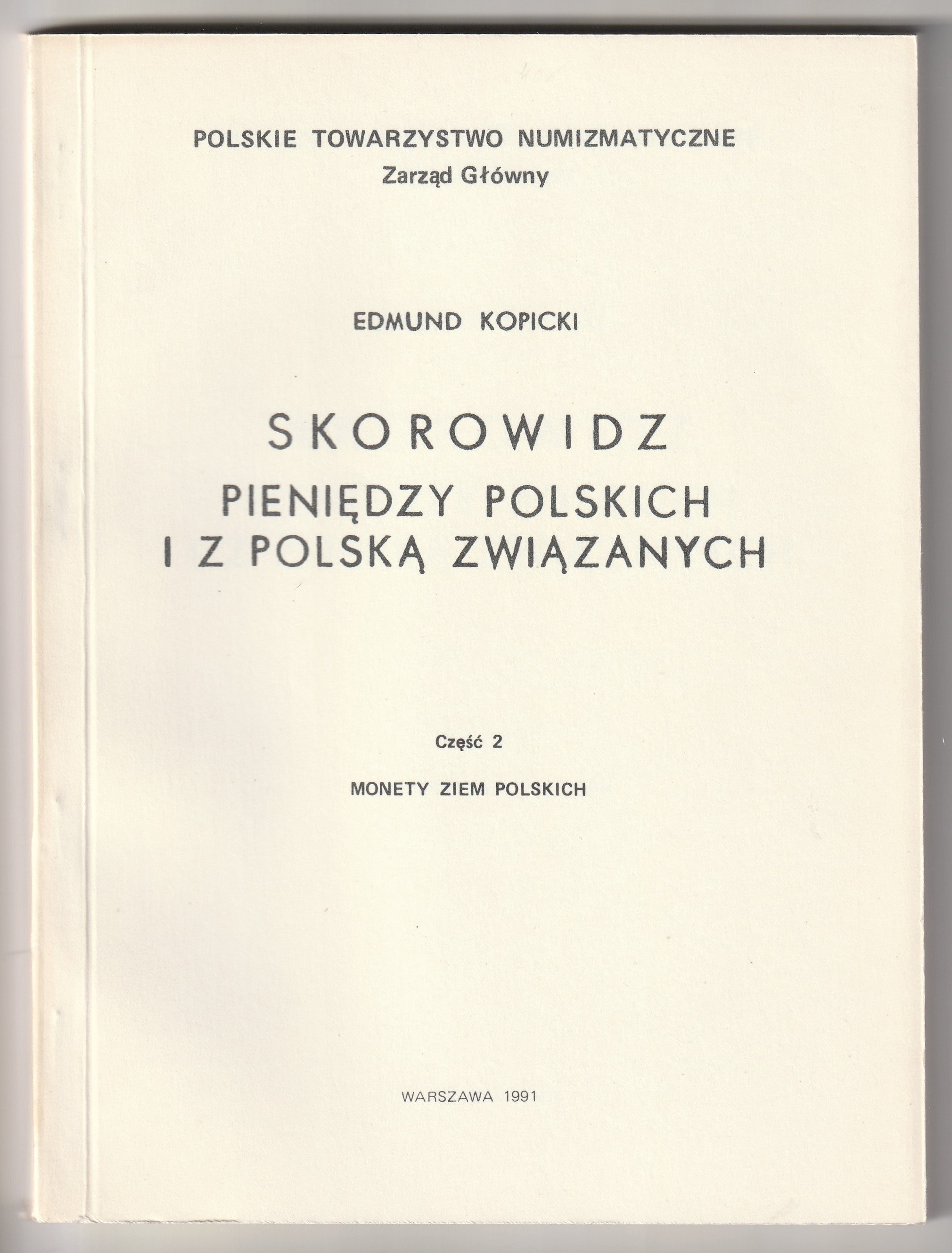 KOPICKI Edmund. Skorowidz pieniędzy polskich i z Polską związanych, cz. 2: Monety ziem polskich, wyd. PTN, Warszawa 1991, str. 187, oprawa miękka, st. bdb.; wym. ok. 160x210 mm.