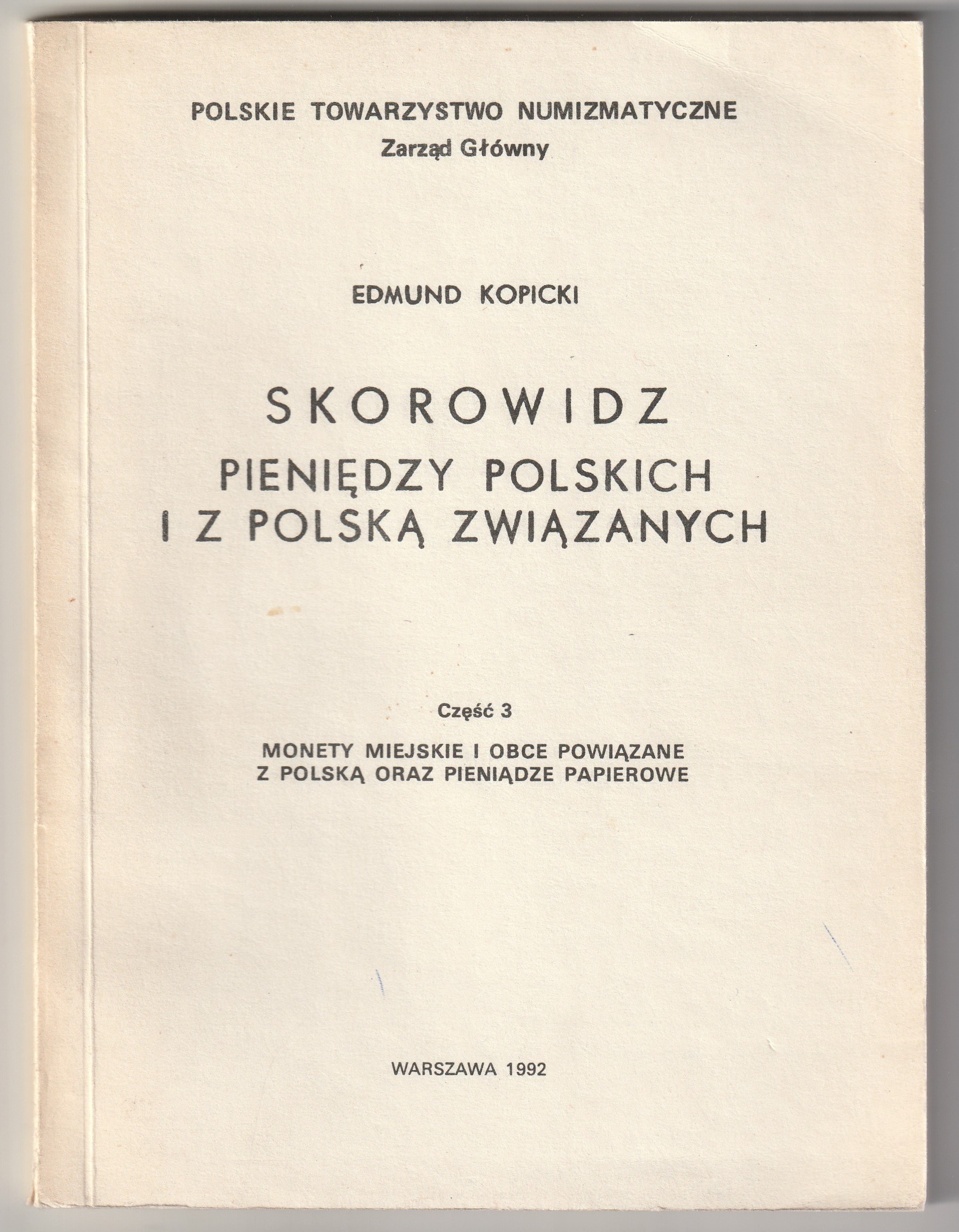 KOPICKI Edmund. Skorowidz pieniędzy polskich i z Polską związanych, cz. 3: Monety miejskie i obce powiązane z Polską oraz pieniądze papierowe, wyd. PTN, Warszawa 1992, str. 220 oprawa miękka, niewielkie kreski, po wewnętrznej stronie tylnej okładki nieaktualna pieczątka, st. bdb.; wym. ok. 160x210 mm.